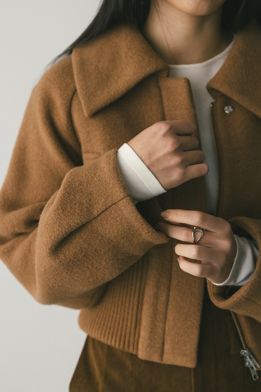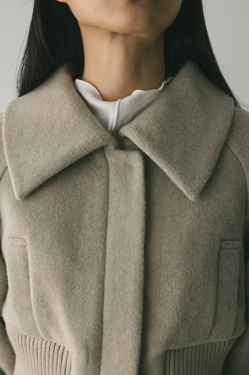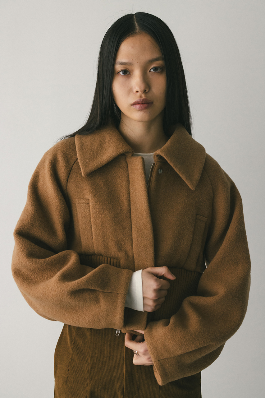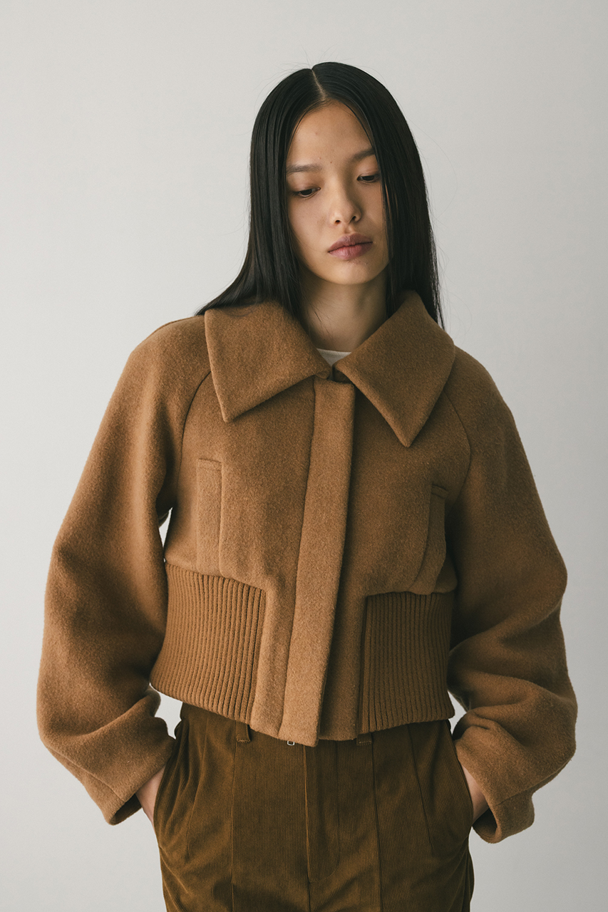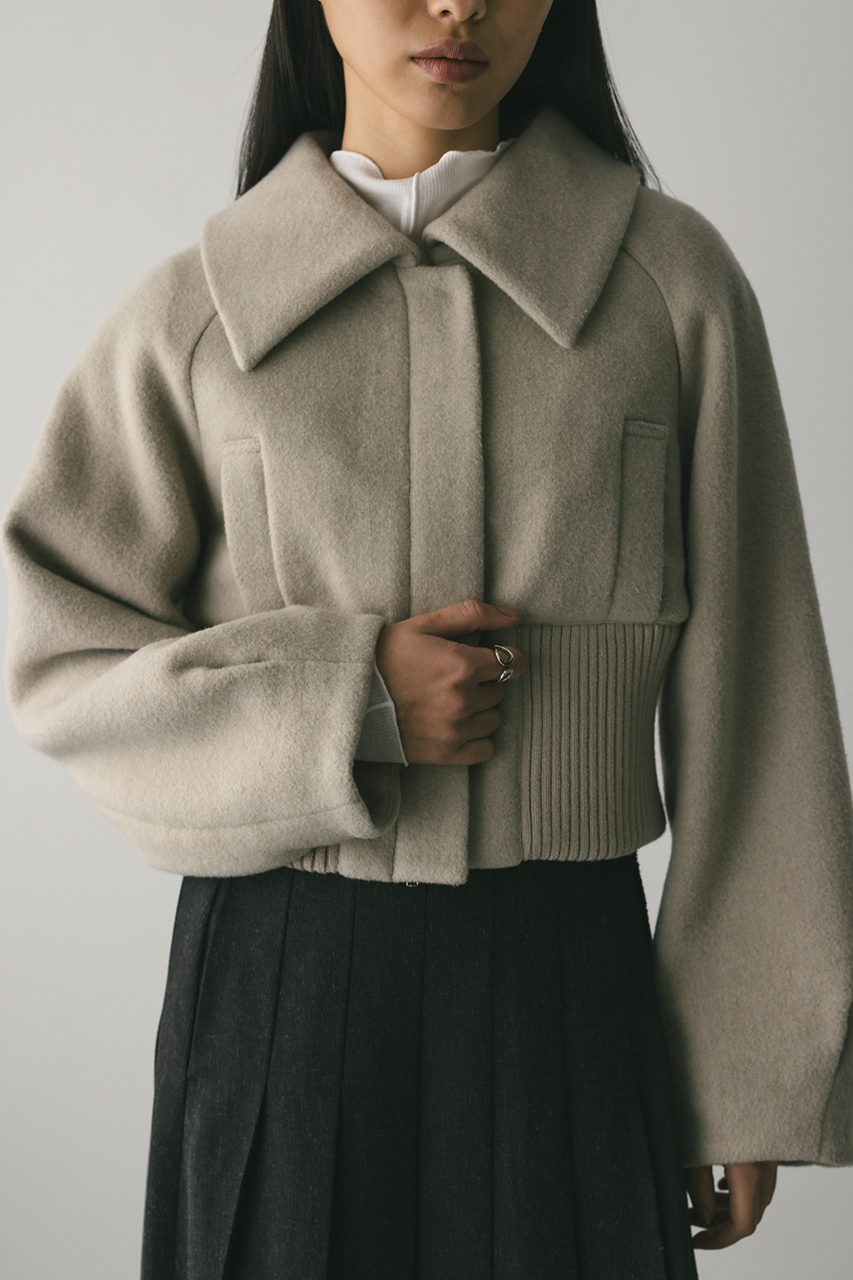 裾に入れたワイドリブがポイントのショートコート。程よく厚みのあるやわらかい風合いで女性らしい印象に導きます。袖太めデザインのラグランスリーブとやや大きめな襟がデザインポイント。ショート丈デザインで様々なボトムスとも合わせやすい一枚です。ストレッチなし、透け感なし。