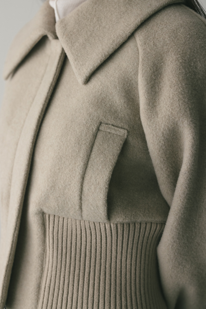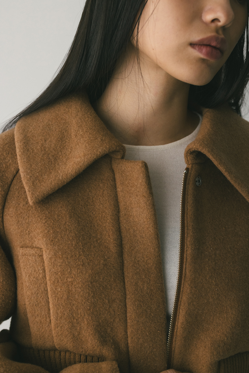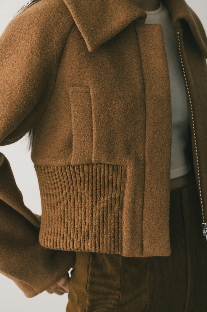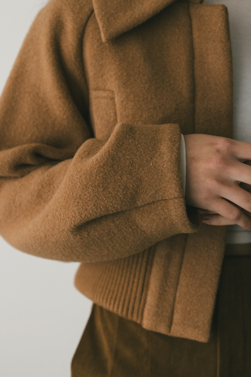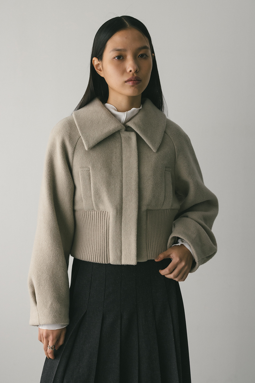 裾に入れたワイドリブがポイントのショートコート。程よく厚みのあるやわらかい風合いで女性らしい印象に導きます。袖太めデザインのラグランスリーブとやや大きめな襟がデザインポイント。ショート丈デザインで様々なボトムスとも合わせやすい一枚です。ストレッチなし、透け感なし。