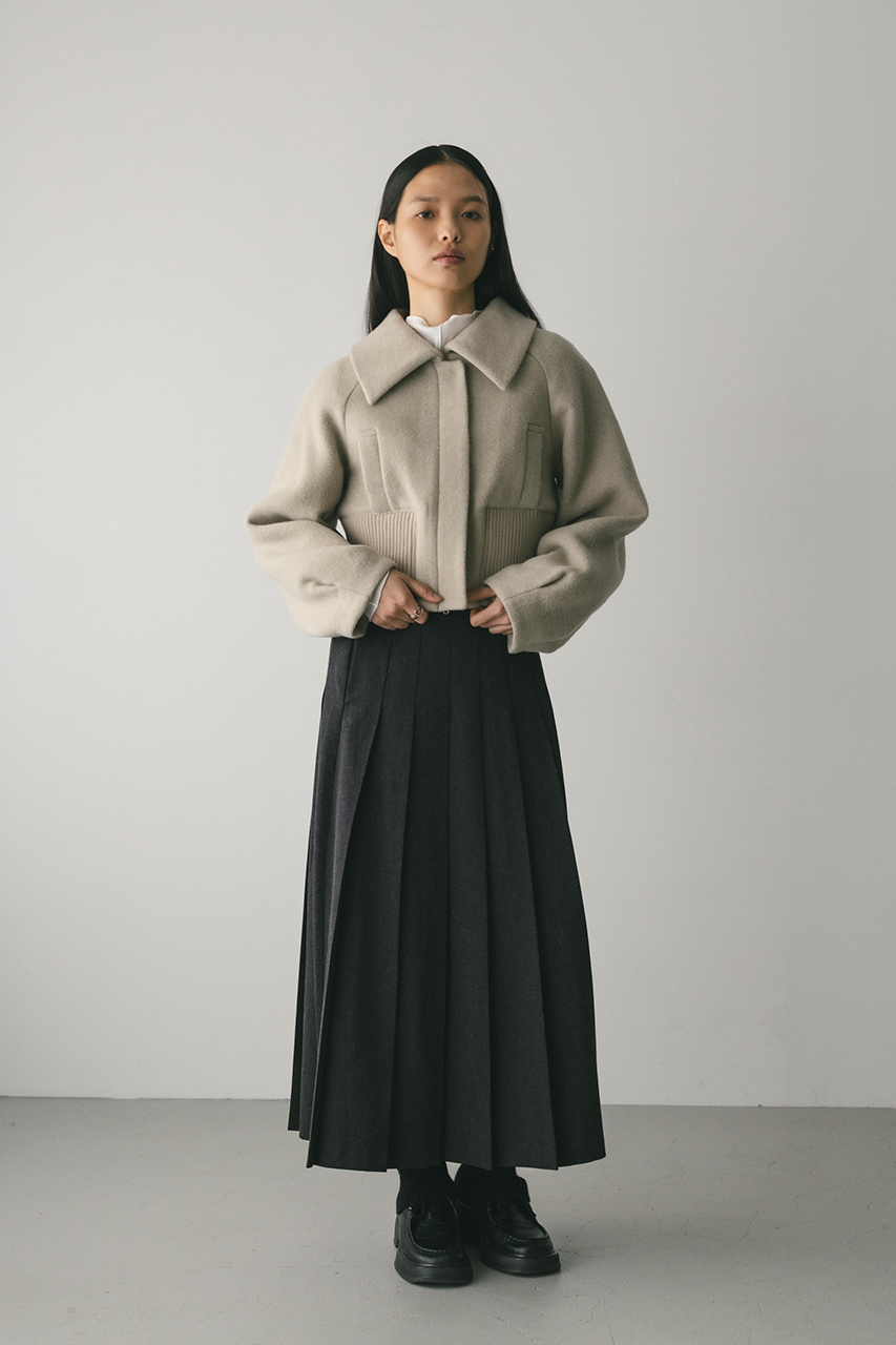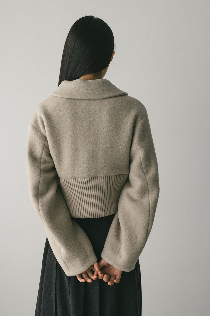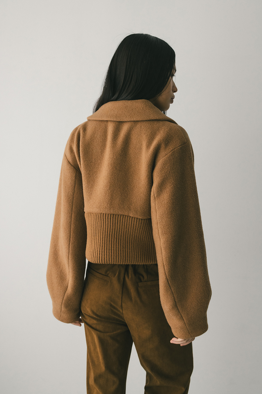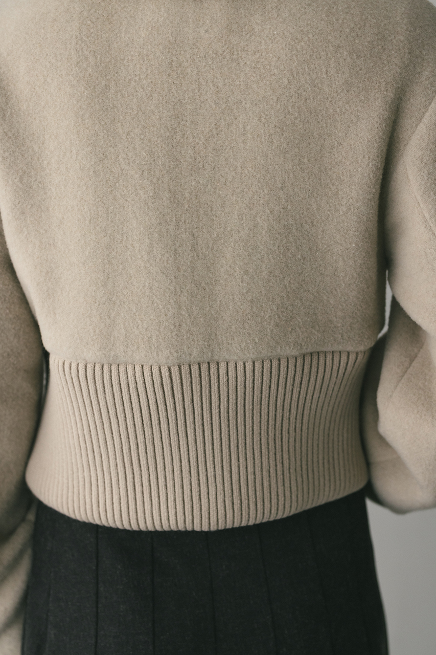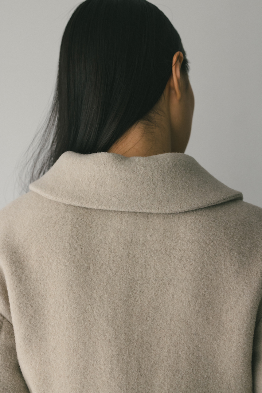 裾に入れたワイドリブがポイントのショートコート。程よく厚みのあるやわらかい風合いで女性らしい印象に導きます。袖太めデザインのラグランスリーブとやや大きめな襟がデザインポイント。ショート丈デザインで様々なボトムスとも合わせやすい一枚です。ストレッチなし、透け感なし。