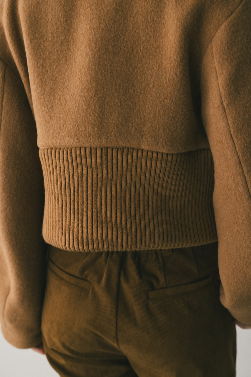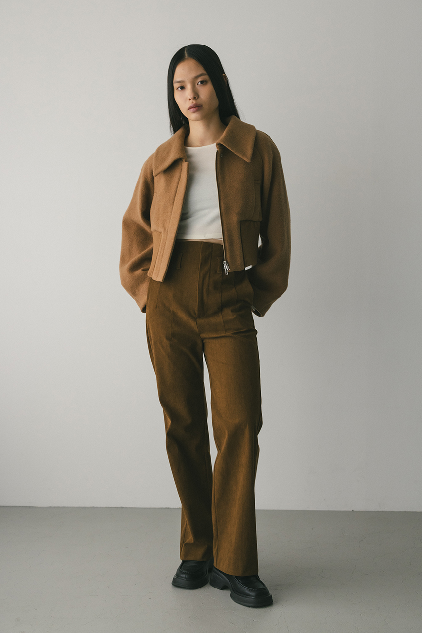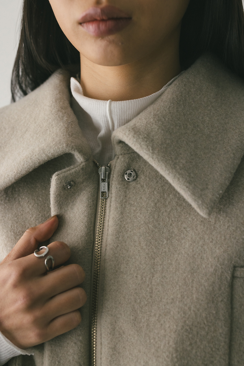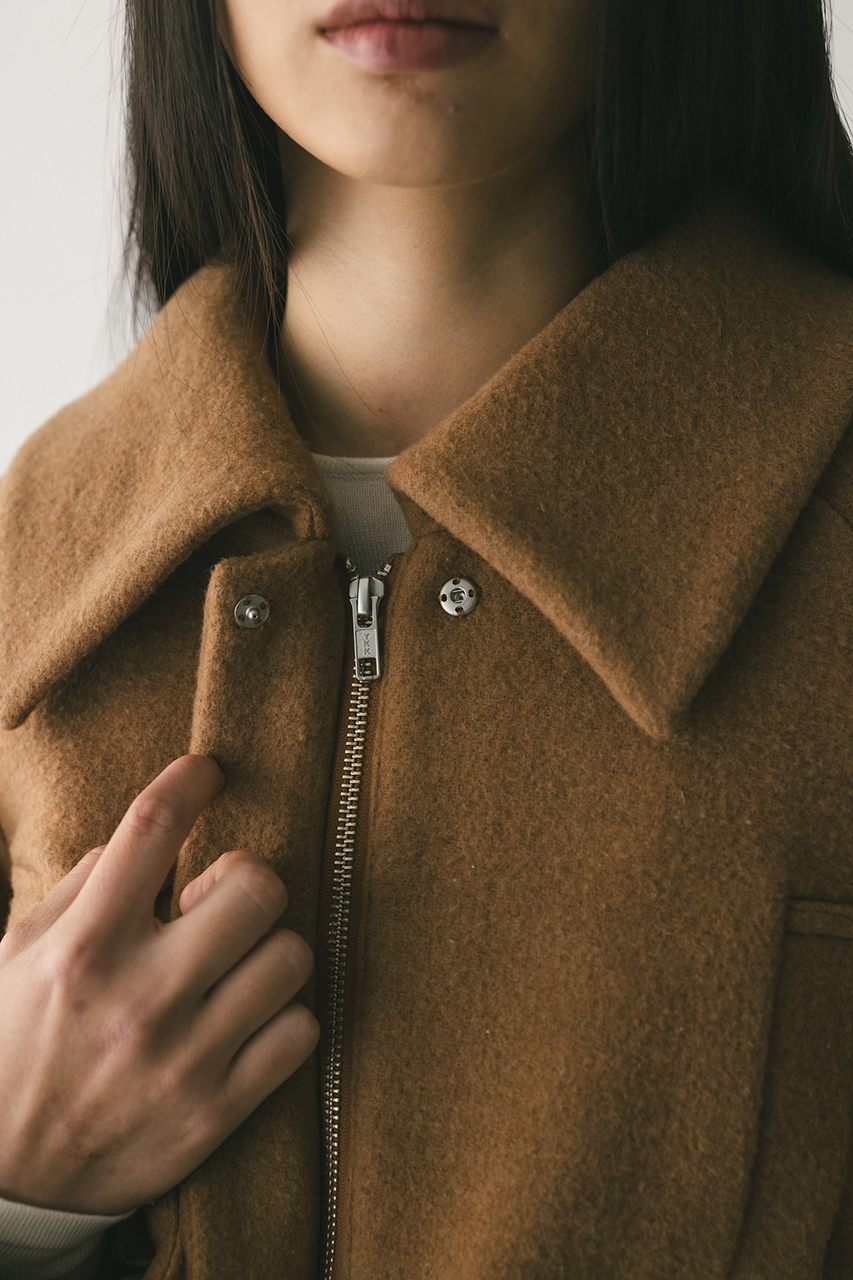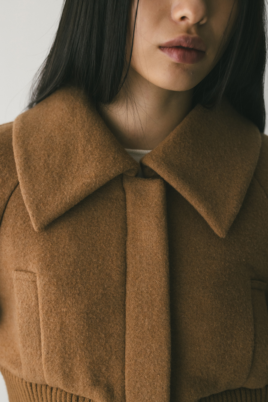 裾に入れたワイドリブがポイントのショートコート。程よく厚みのあるやわらかい風合いで女性らしい印象に導きます。袖太めデザインのラグランスリーブとやや大きめな襟がデザインポイント。ショート丈デザインで様々なボトムスとも合わせやすい一枚です。ストレッチなし、透け感なし。