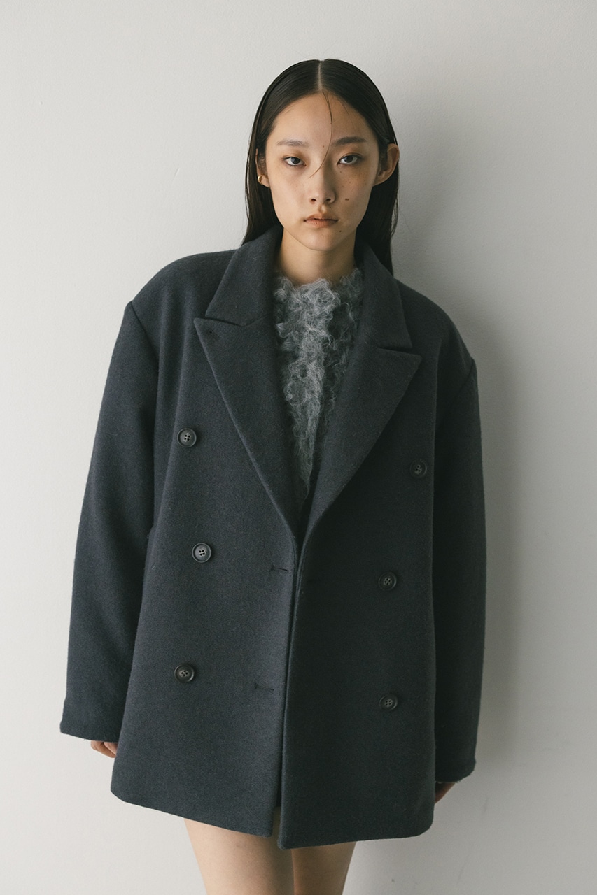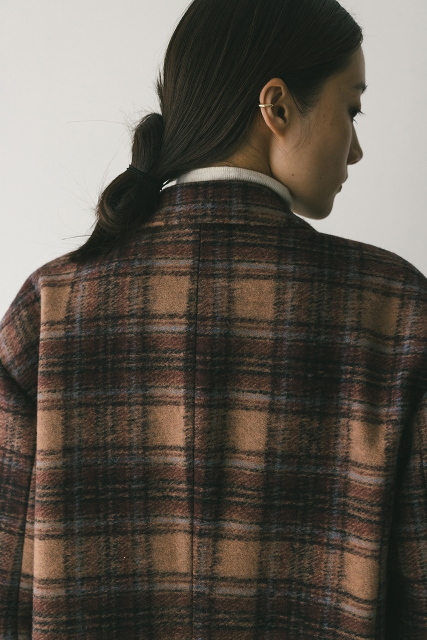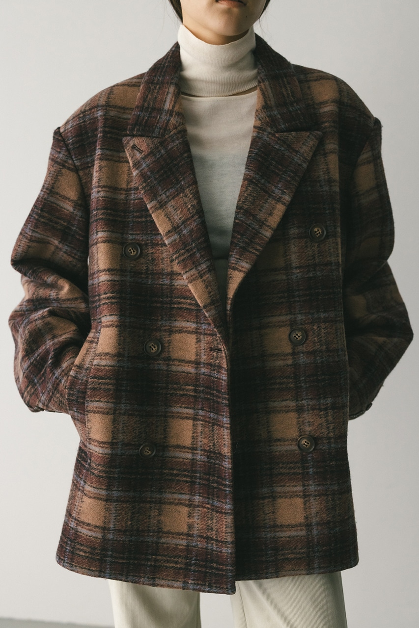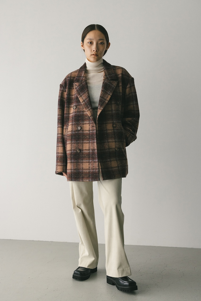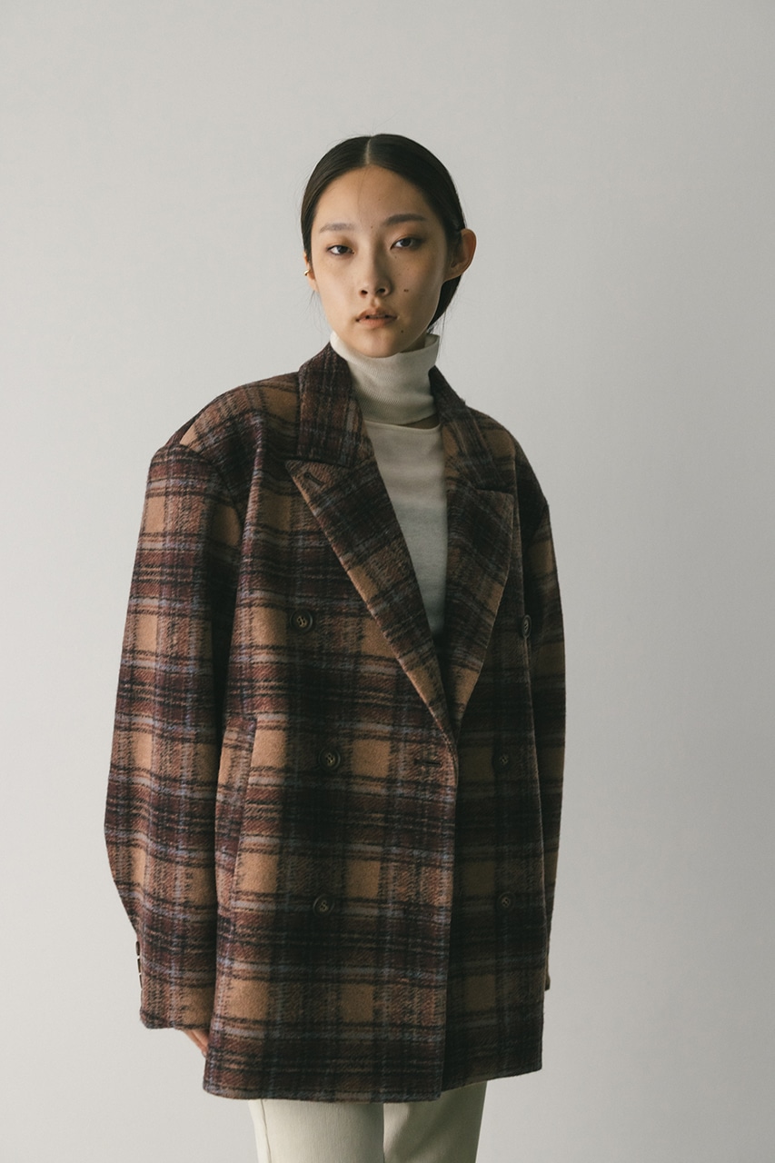 肩パットをしっかりと入れたパワーショルダーがマニッシュでモードな印象に導くPコート。無地とオリジナルのチェック柄の2種類の展開。襟はピークドラペルにしたことで、メンズライクでフォーマルな印象に仕上げました。軽くて柔らかな生地を使用しているので肌なじみも良い一枚。パンツからスカートまでどんなボトムスとも相性良く合わせていただけます。ストレッチなし、透け感なし。