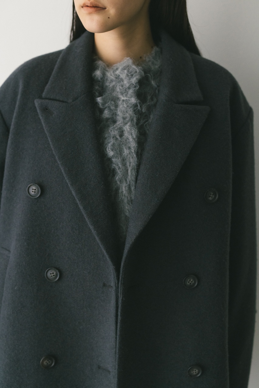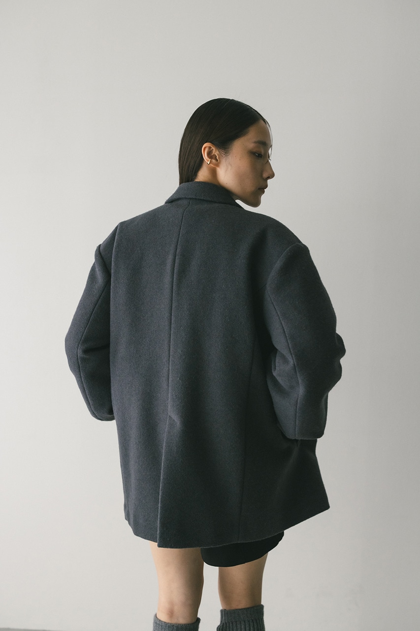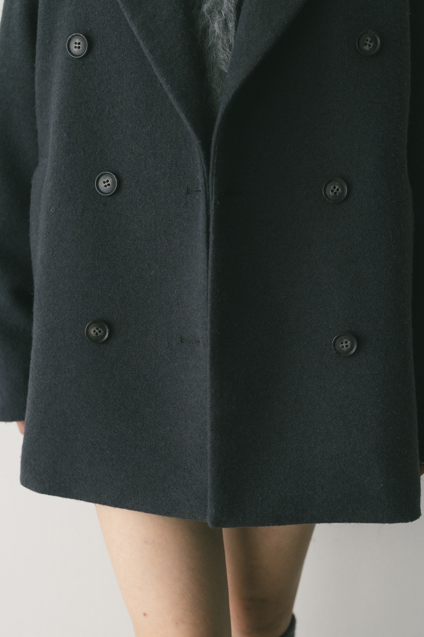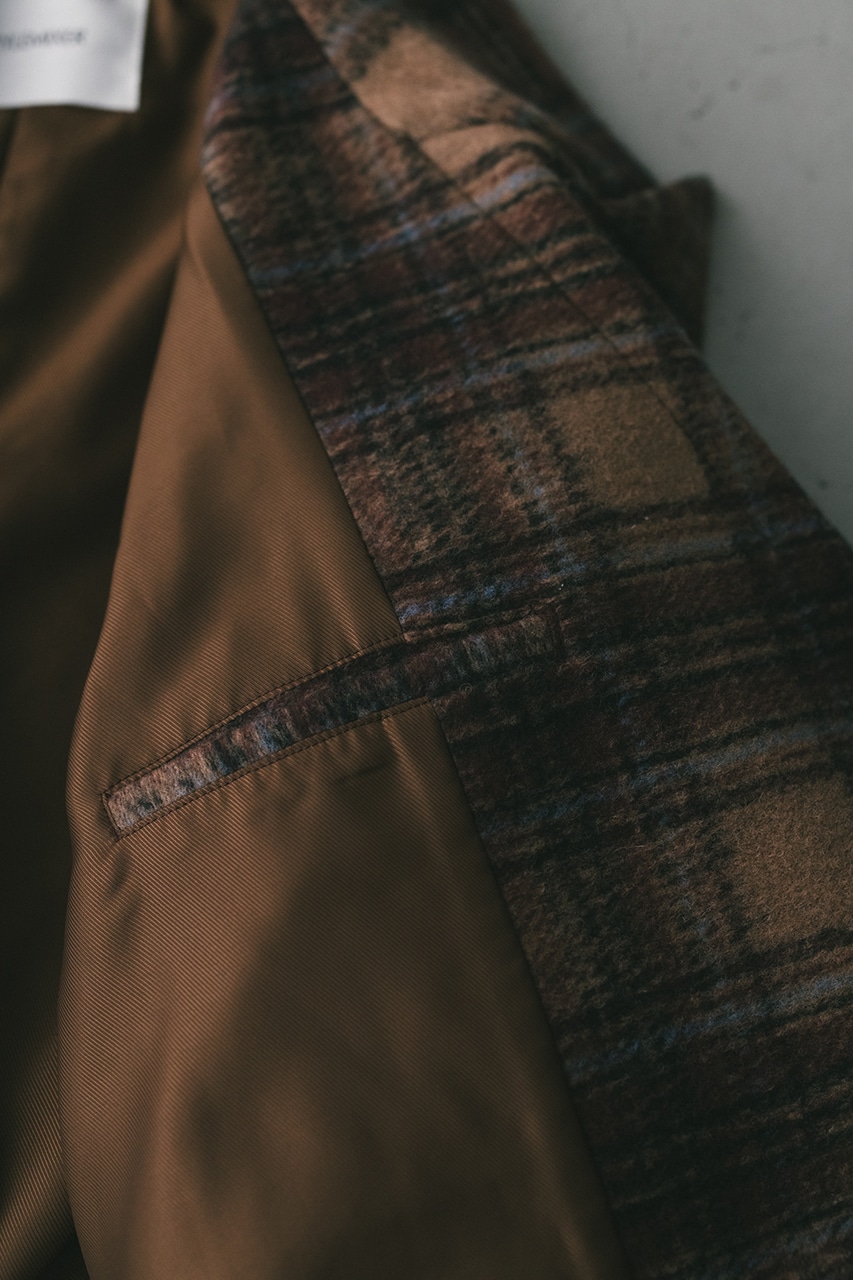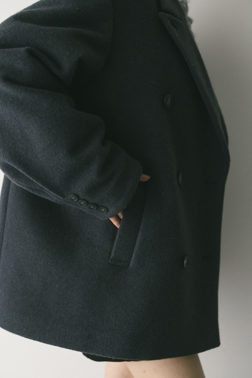 肩パットをしっかりと入れたパワーショルダーがマニッシュでモードな印象に導くPコート。無地とオリジナルのチェック柄の2種類の展開。襟はピークドラペルにしたことで、メンズライクでフォーマルな印象に仕上げました。軽くて柔らかな生地を使用しているので肌なじみも良い一枚。パンツからスカートまでどんなボトムスとも相性良く合わせていただけます。ストレッチなし、透け感なし。