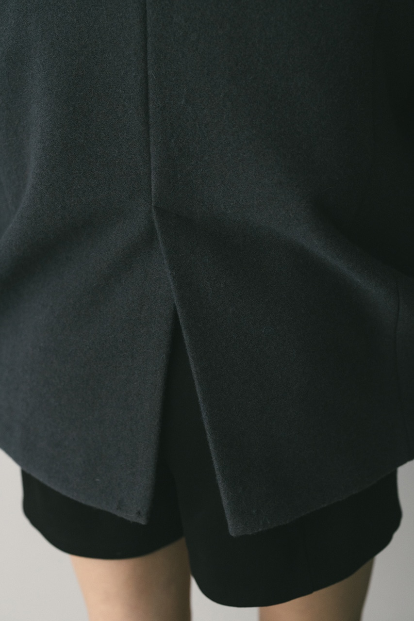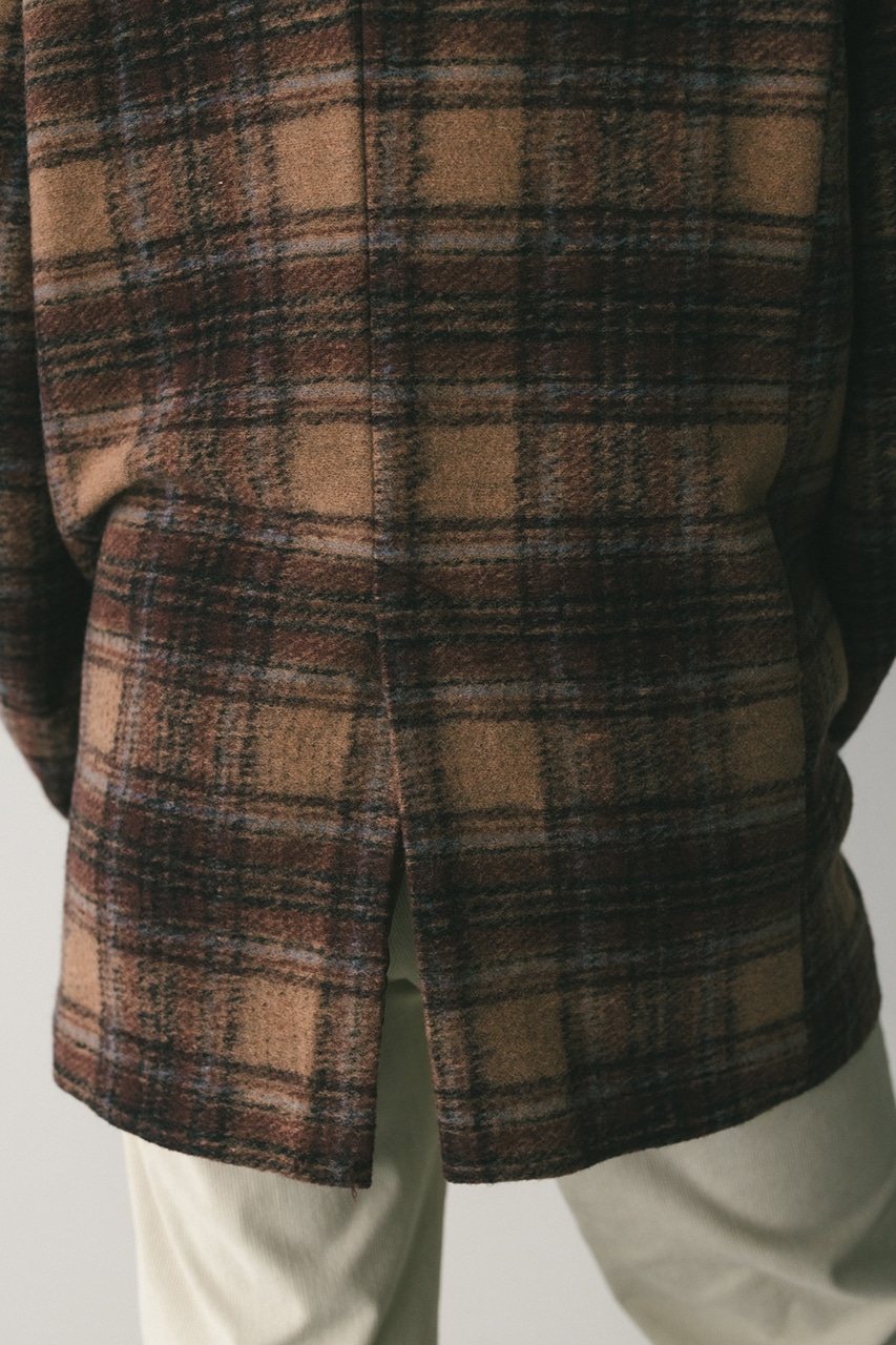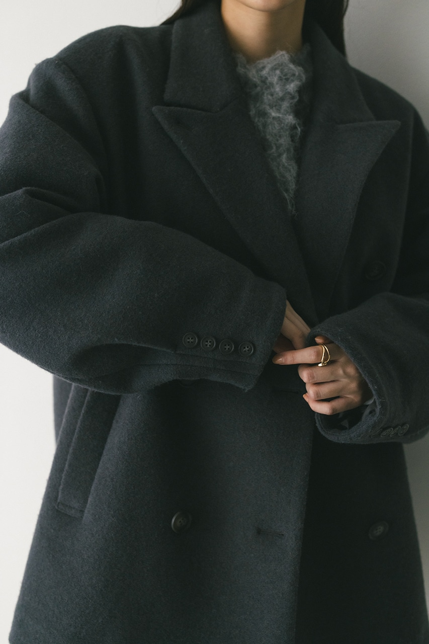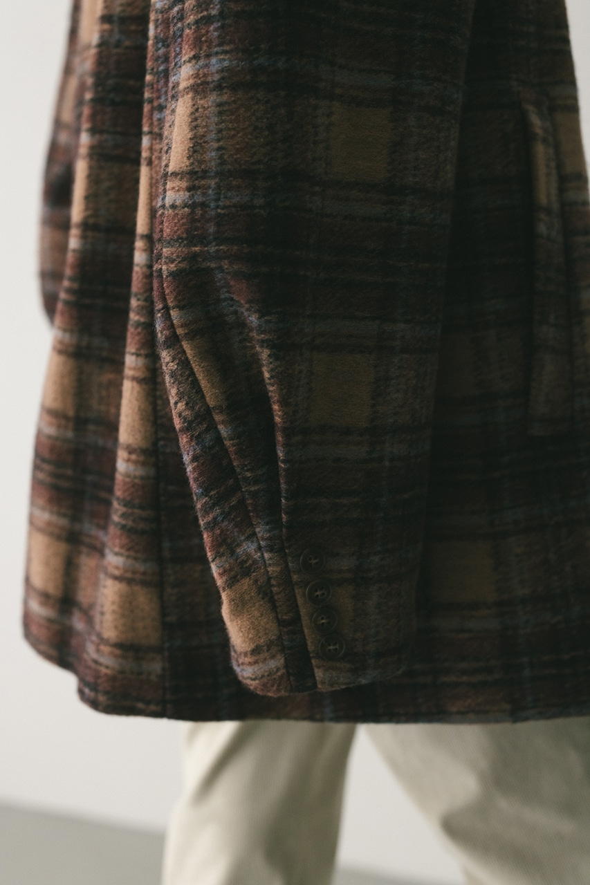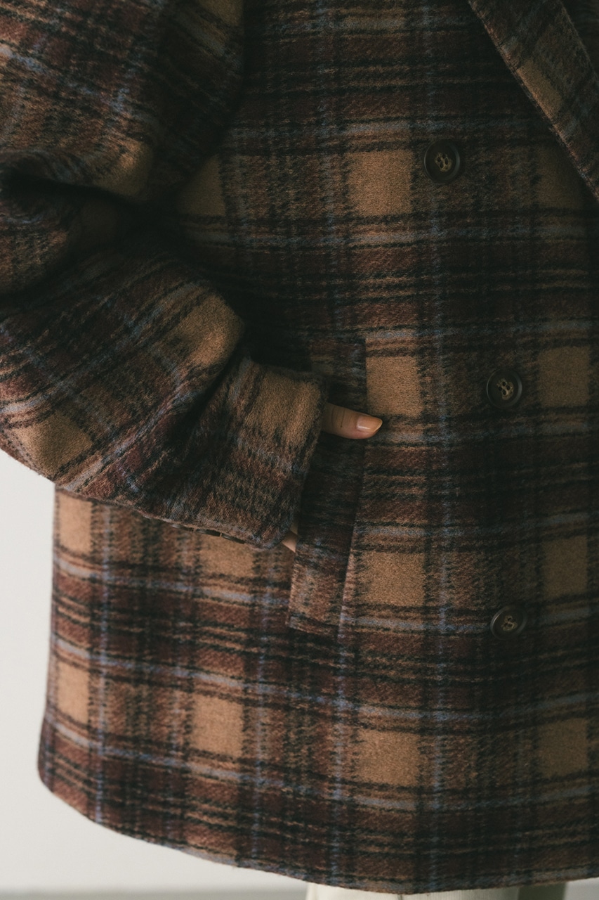 肩パットをしっかりと入れたパワーショルダーがマニッシュでモードな印象に導くPコート。無地とオリジナルのチェック柄の2種類の展開。襟はピークドラペルにしたことで、メンズライクでフォーマルな印象に仕上げました。軽くて柔らかな生地を使用しているので肌なじみも良い一枚。パンツからスカートまでどんなボトムスとも相性良く合わせていただけます。ストレッチなし、透け感なし。