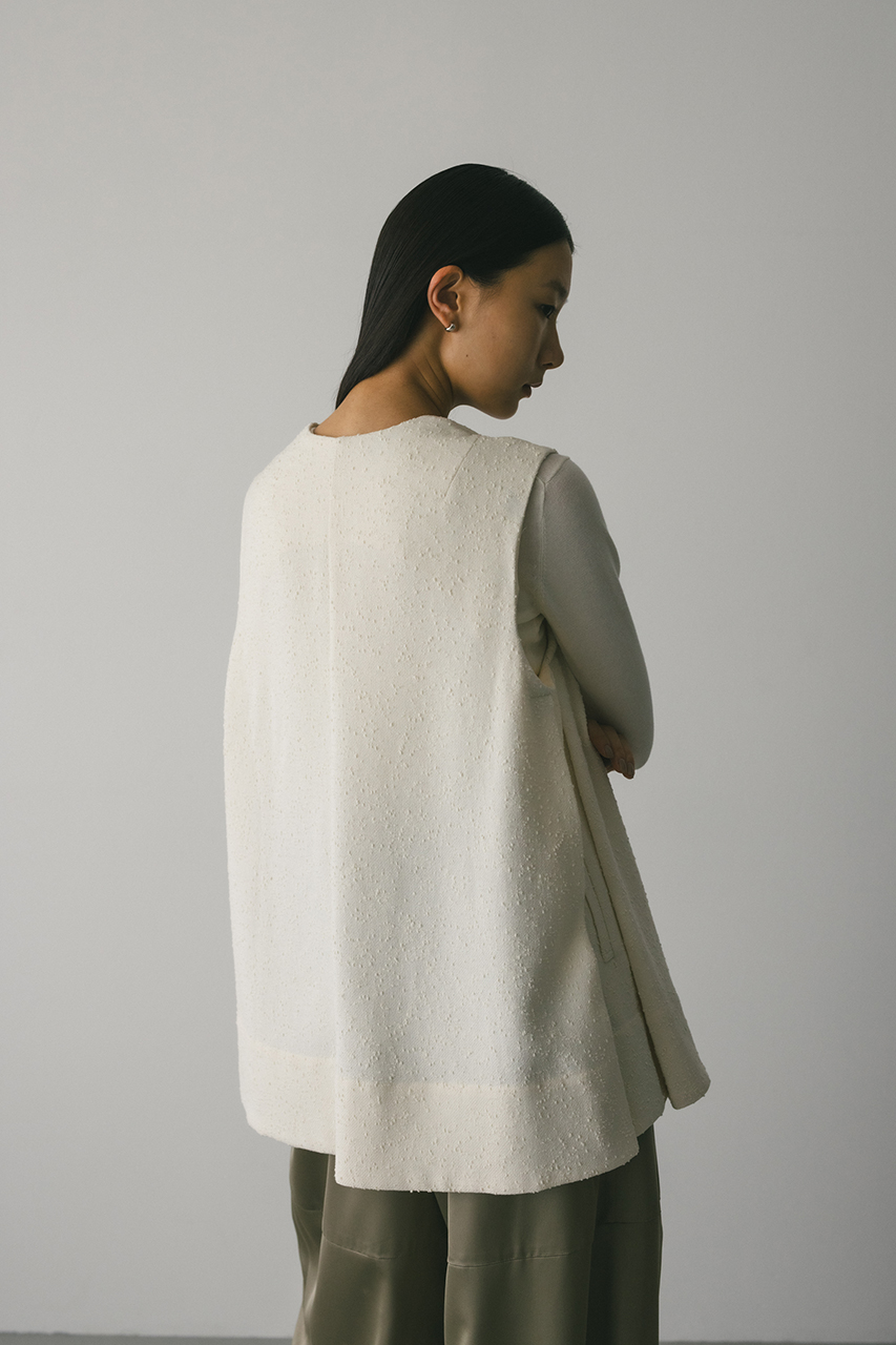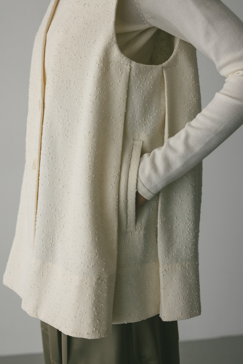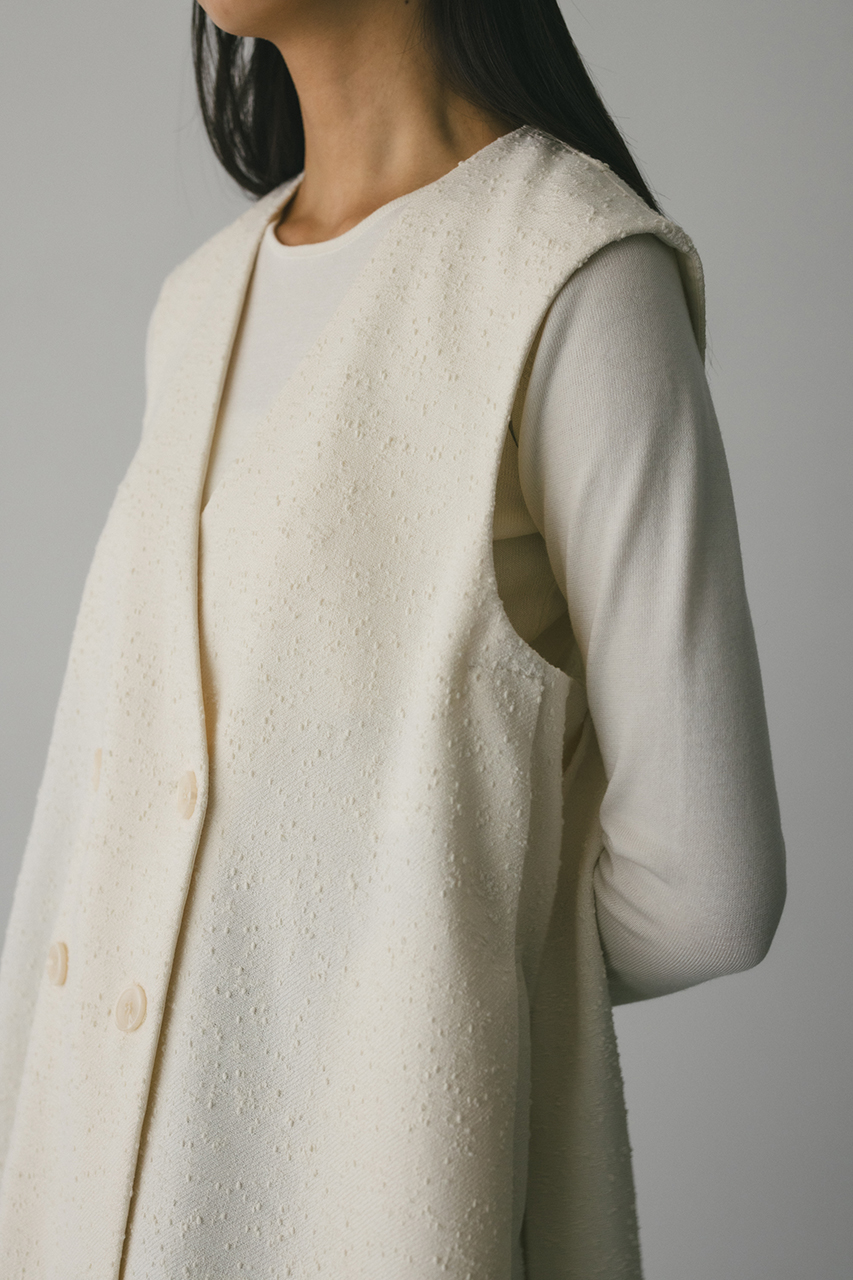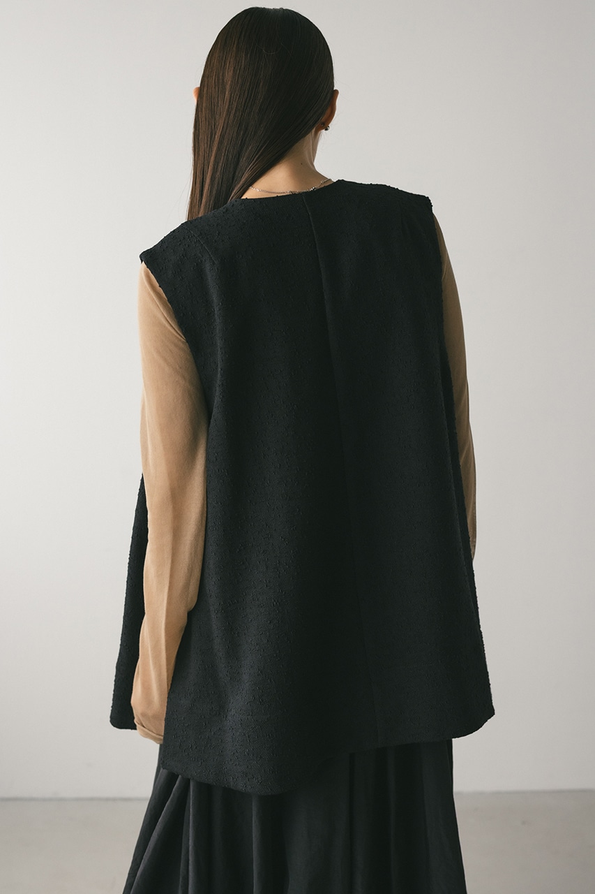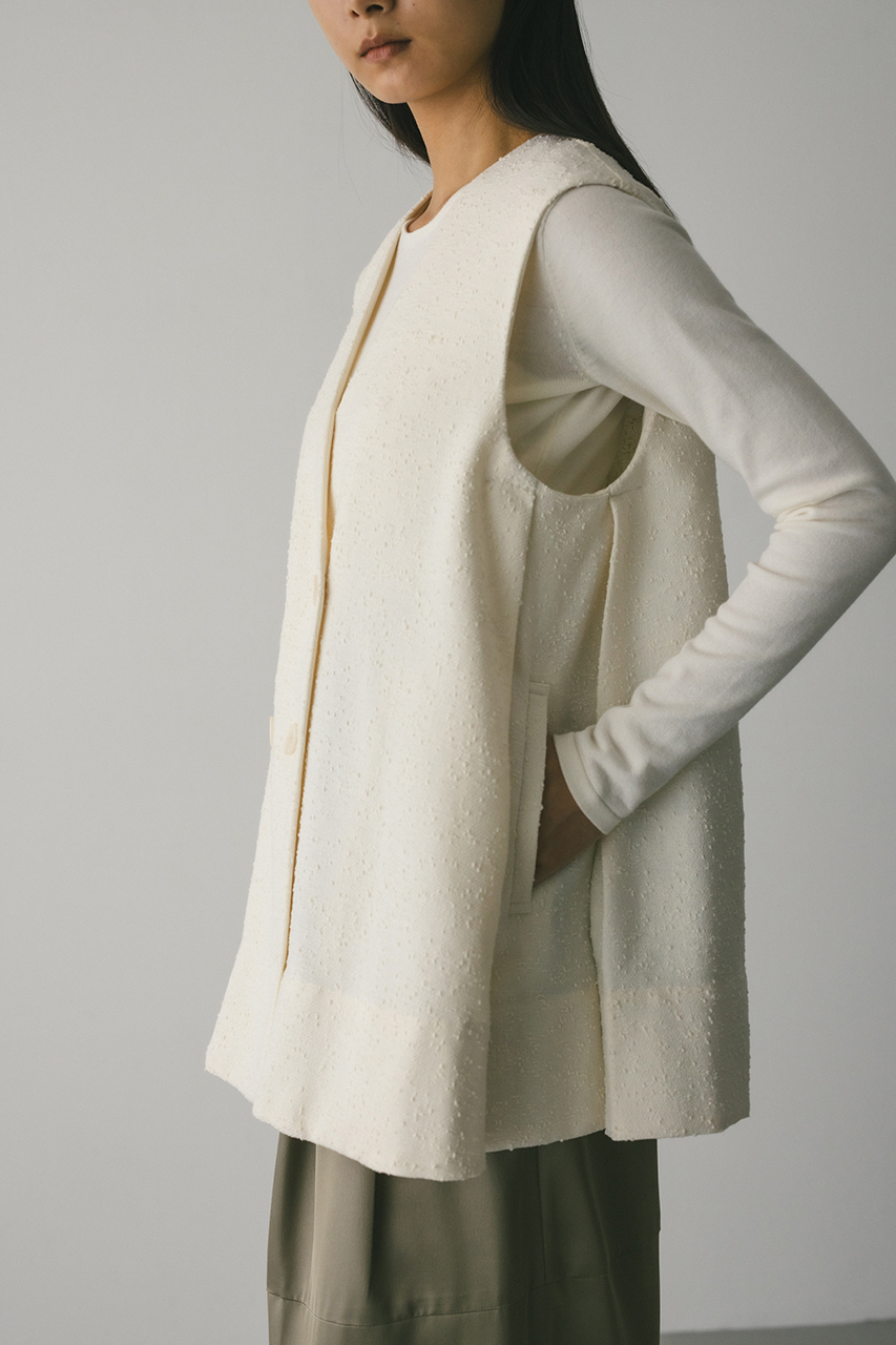 表面感が可愛いネップ生地を使用したベスト。たっぷりと入れたフレアが作るボリューム感のあるシルエットがポイント。すっきりとした深めのVネックで抜け感をプラス。長めの丈でさりげなく体型をカバーしてくれます。インナー次第でロングシーズン着用頂けます。透け感なし、ストレッチなし。