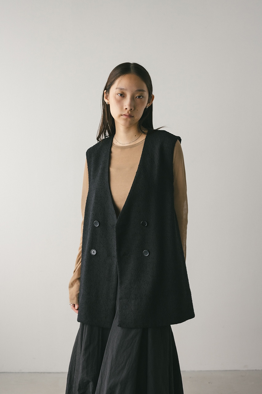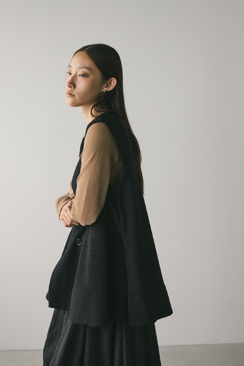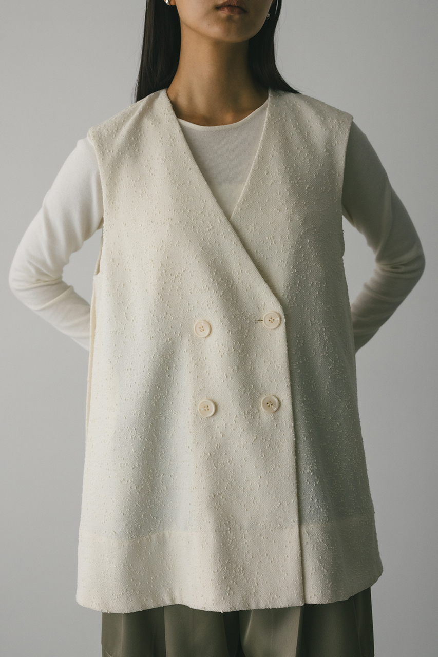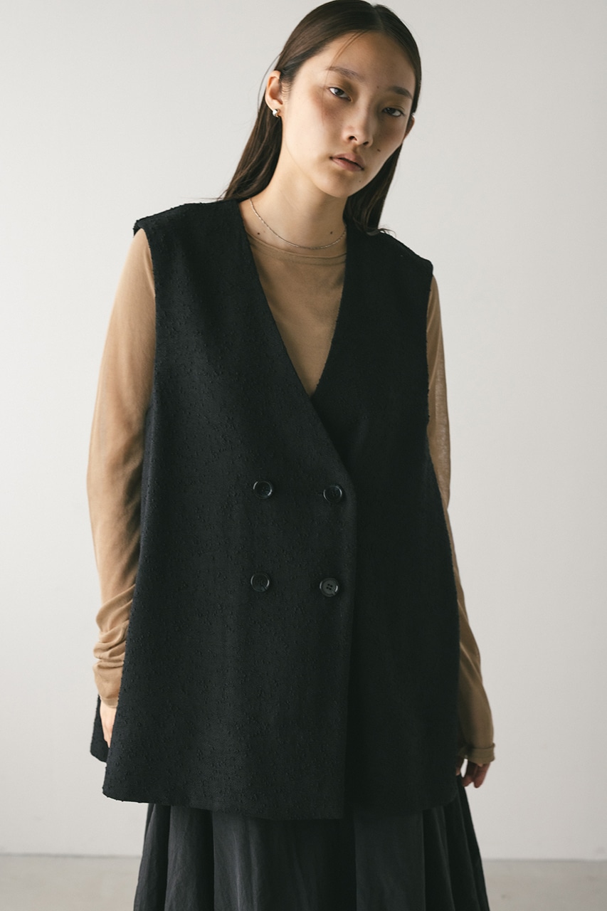 表面感が可愛いネップ生地を使用したベスト。たっぷりと入れたフレアが作るボリューム感のあるシルエットがポイント。すっきりとした深めのVネックで抜け感をプラス。長めの丈でさりげなく体型をカバーしてくれます。インナー次第でロングシーズン着用頂けます。透け感なし、ストレッチなし。