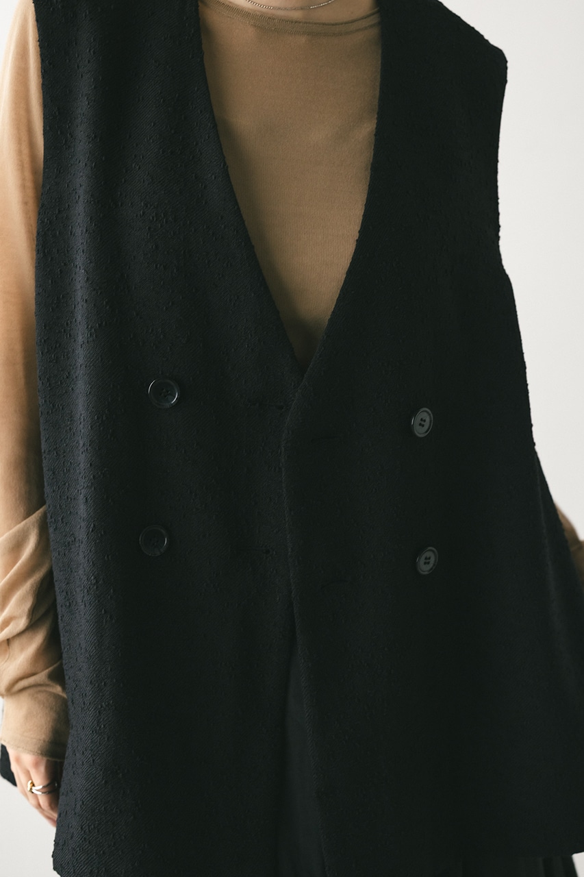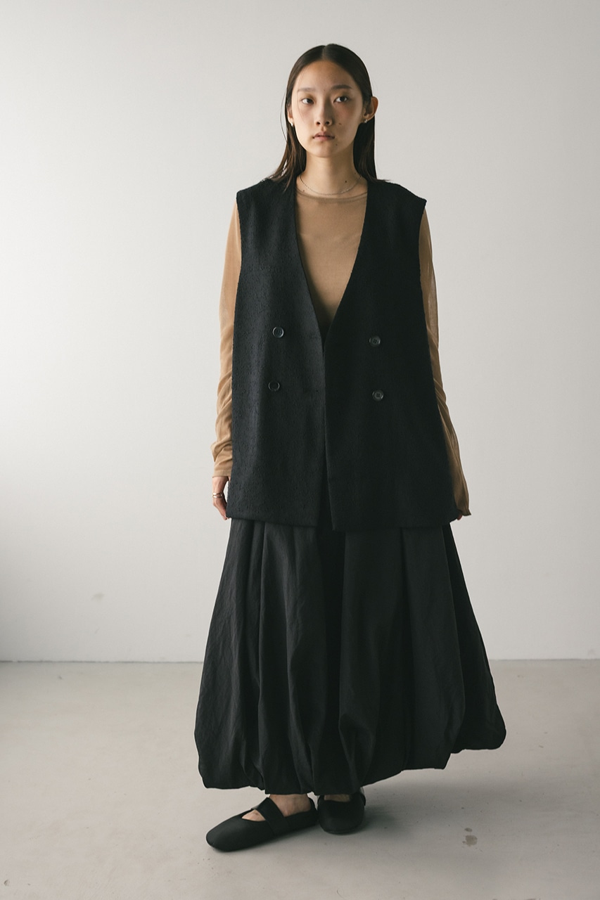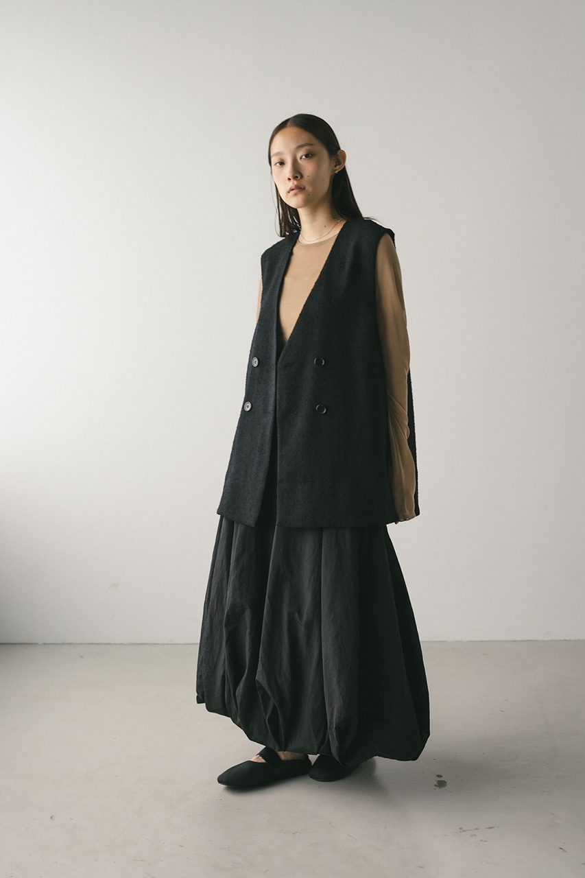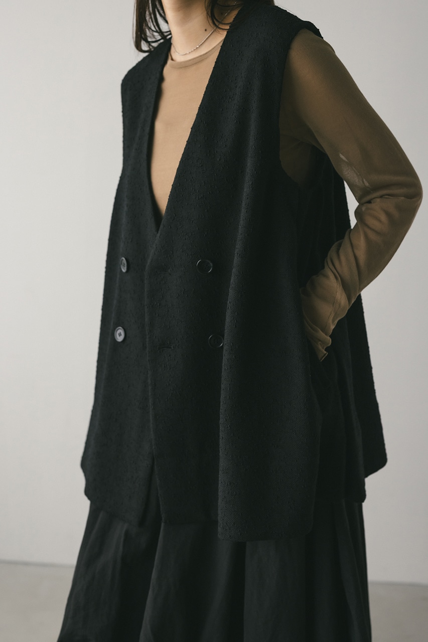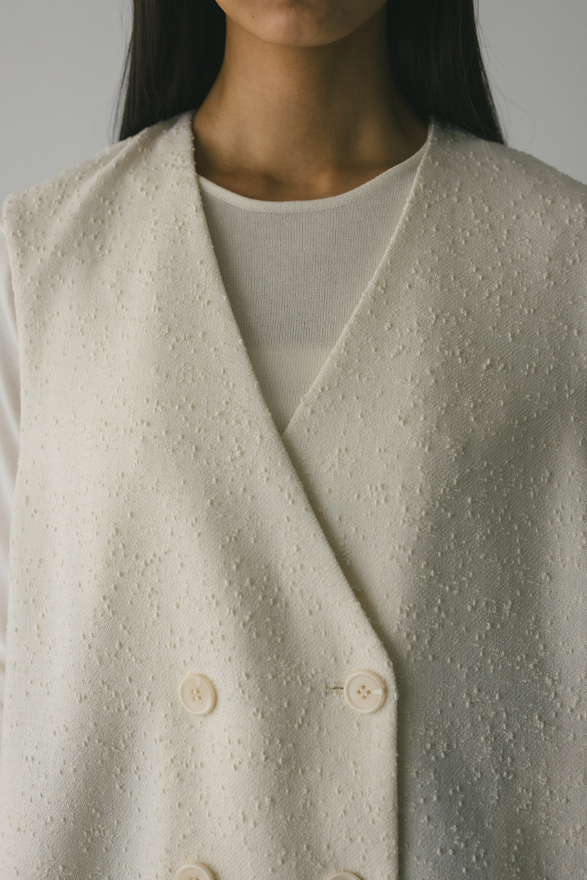 表面感が可愛いネップ生地を使用したベスト。たっぷりと入れたフレアが作るボリューム感のあるシルエットがポイント。すっきりとした深めのVネックで抜け感をプラス。長めの丈でさりげなく体型をカバーしてくれます。インナー次第でロングシーズン着用頂けます。透け感なし、ストレッチなし。