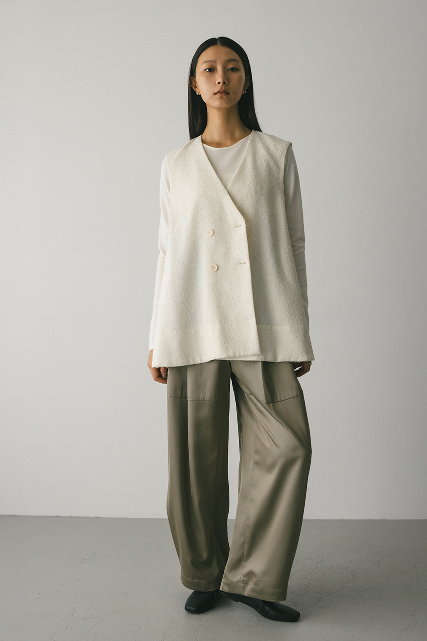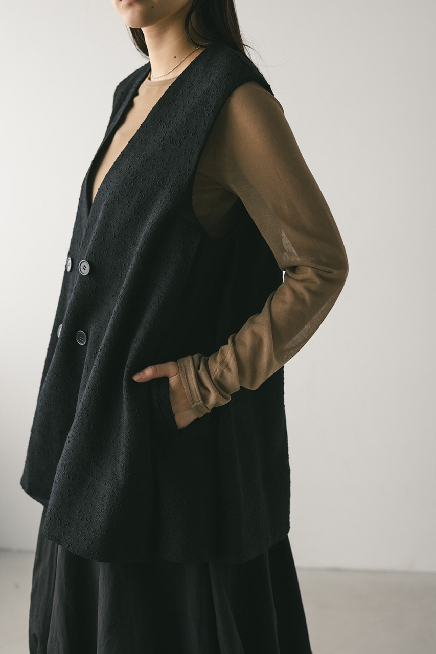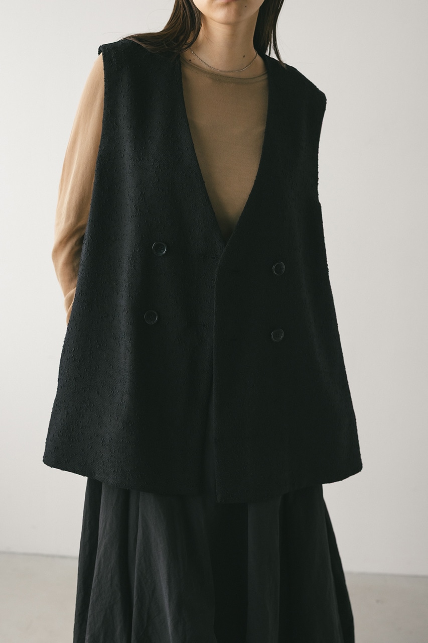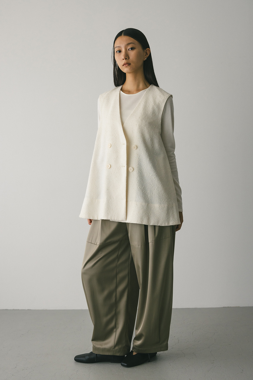 表面感が可愛いネップ生地を使用したベスト。たっぷりと入れたフレアが作るボリューム感のあるシルエットがポイント。すっきりとした深めのVネックで抜け感をプラス。長めの丈でさりげなく体型をカバーしてくれます。インナー次第でロングシーズン着用頂けます。透け感なし、ストレッチなし。
