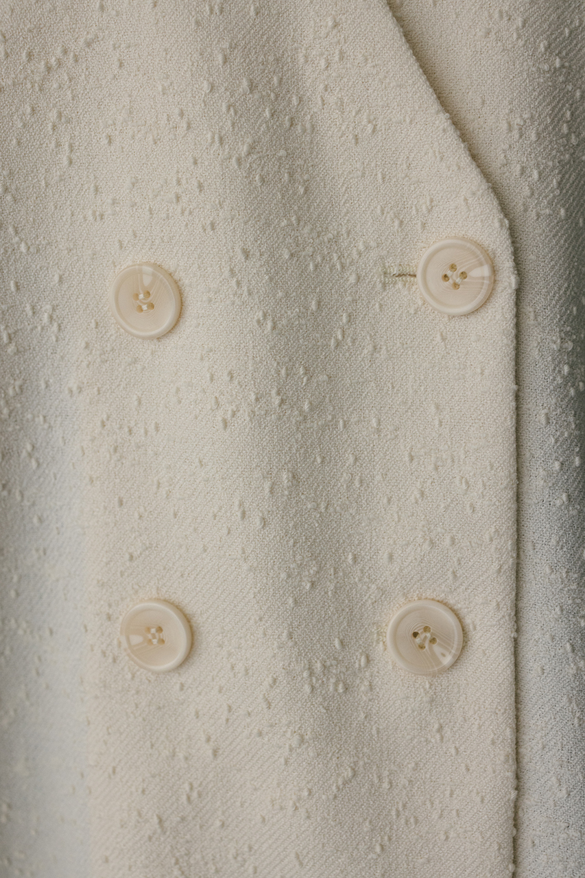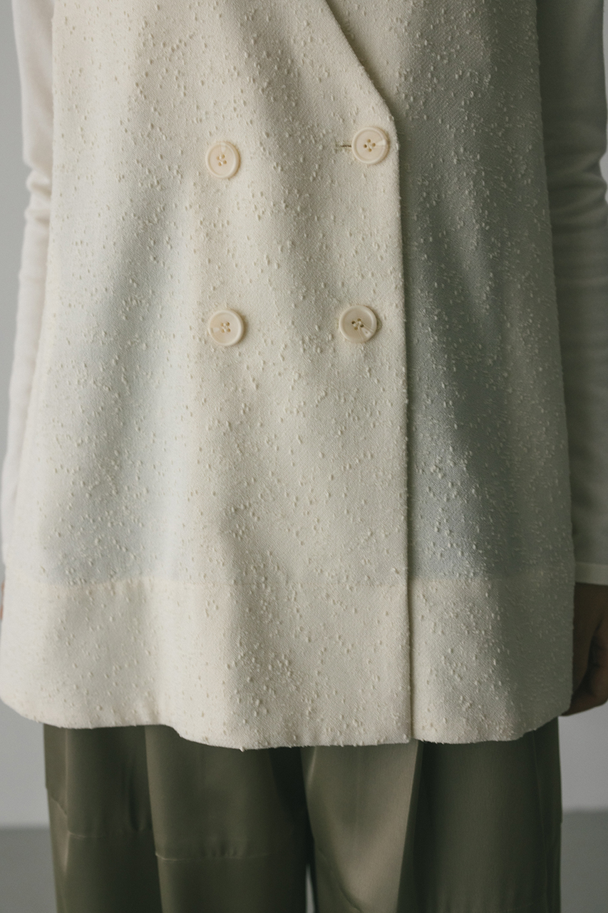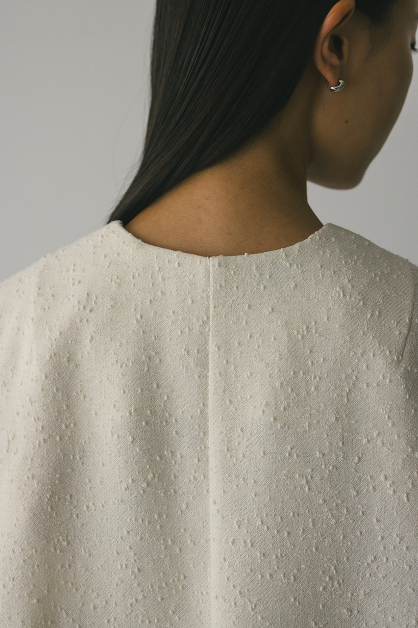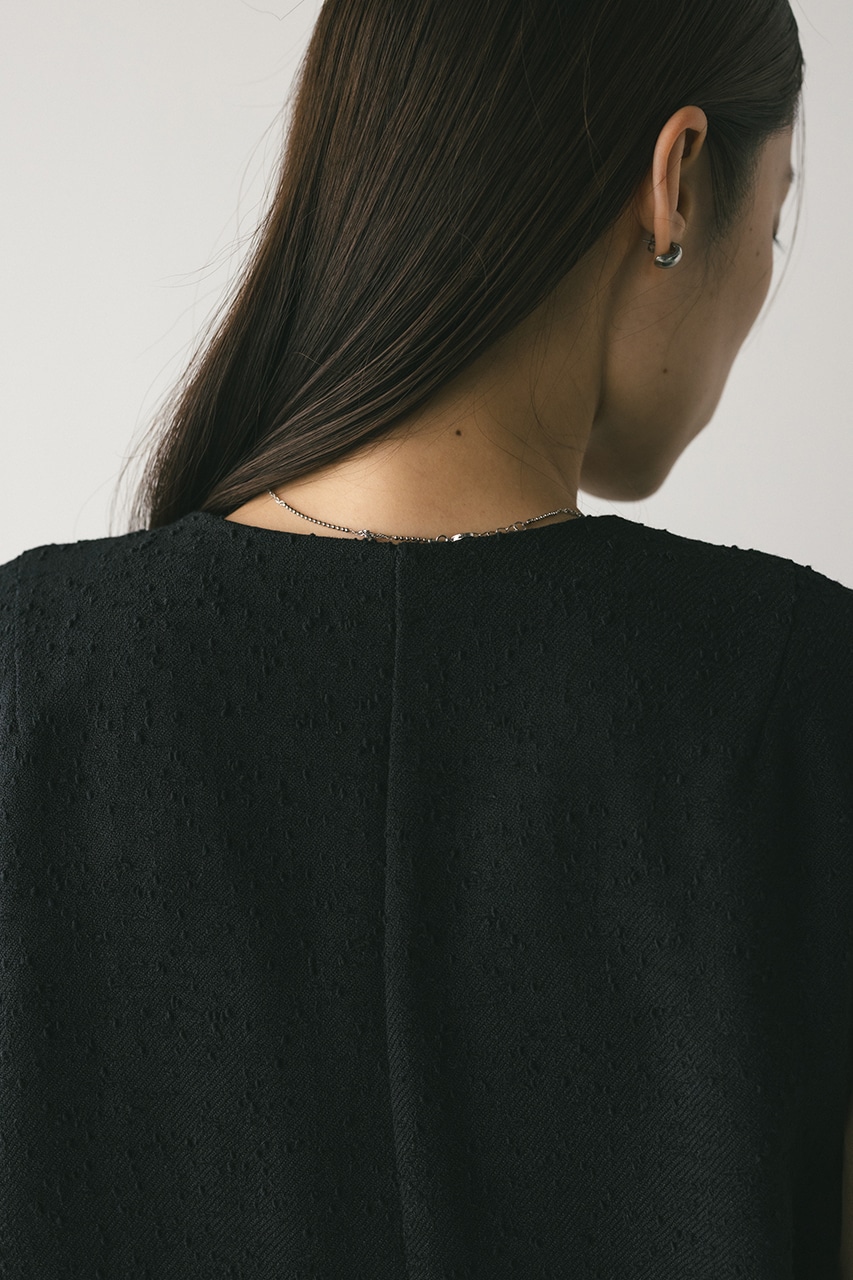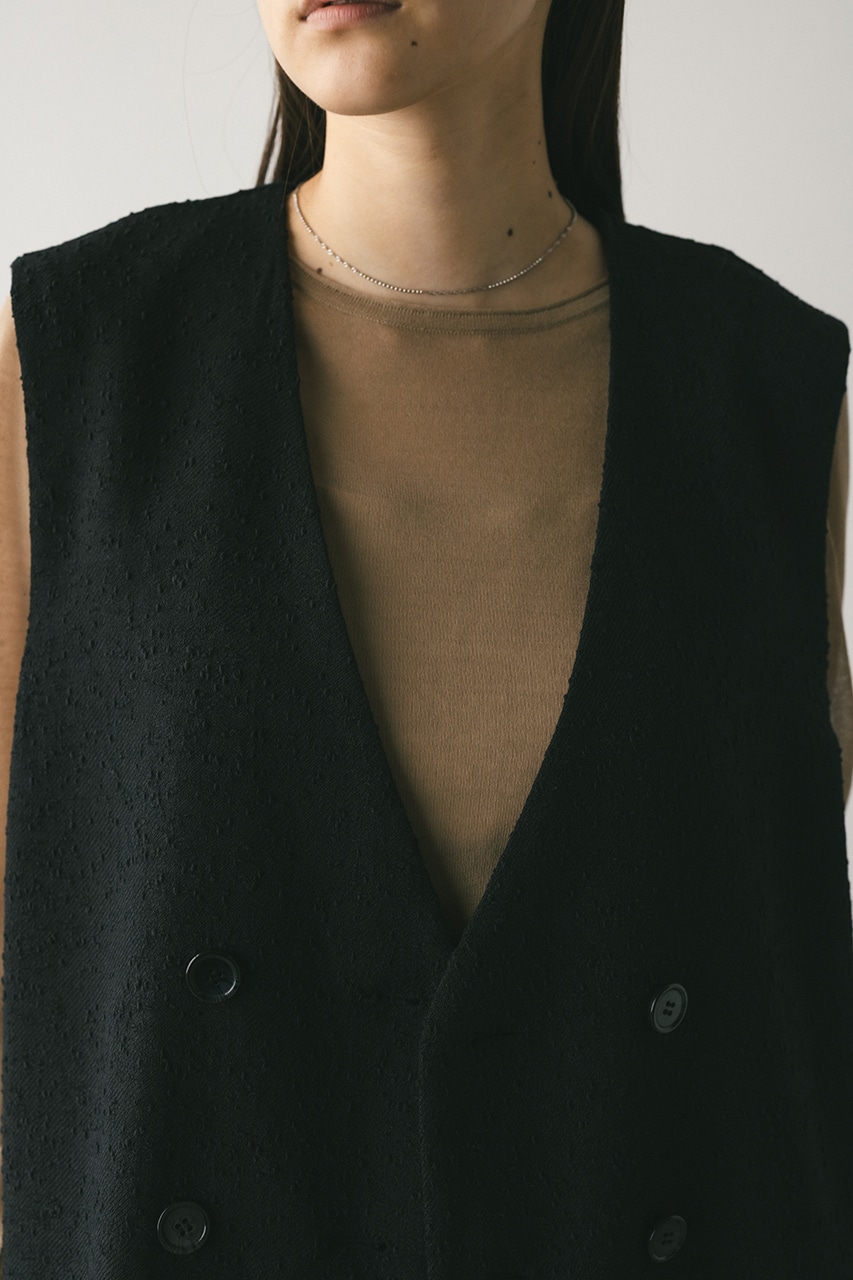 表面感が可愛いネップ生地を使用したベスト。たっぷりと入れたフレアが作るボリューム感のあるシルエットがポイント。すっきりとした深めのVネックで抜け感をプラス。長めの丈でさりげなく体型をカバーしてくれます。インナー次第でロングシーズン着用頂けます。透け感なし、ストレッチなし。