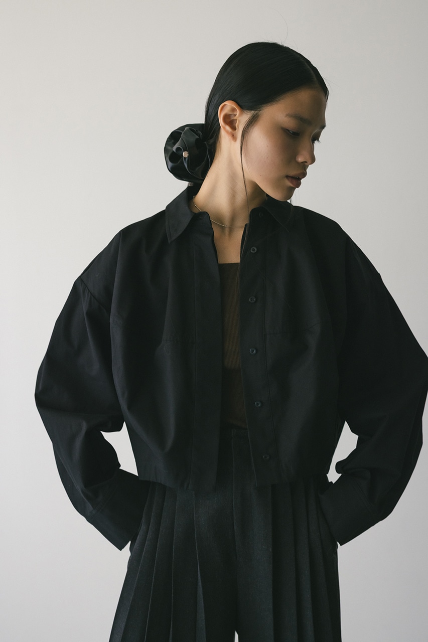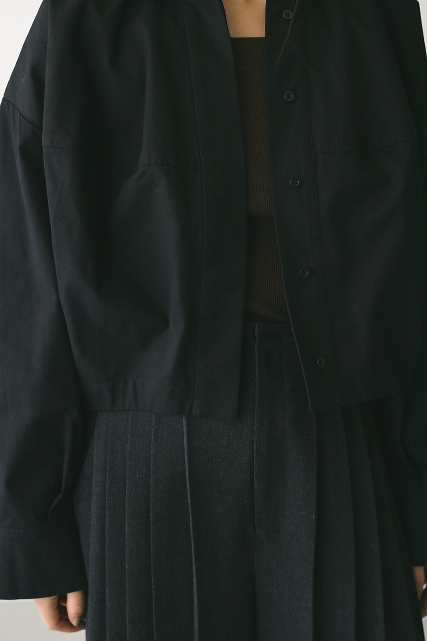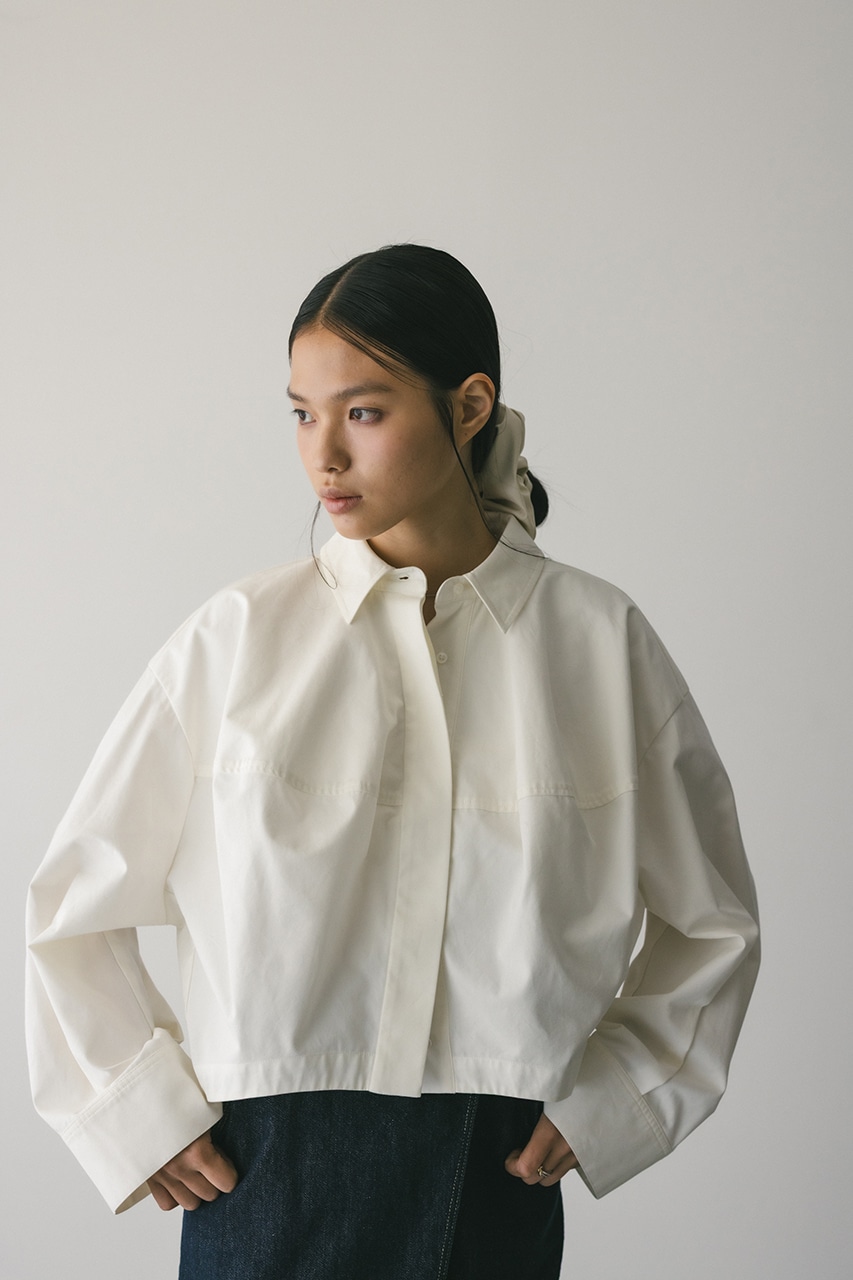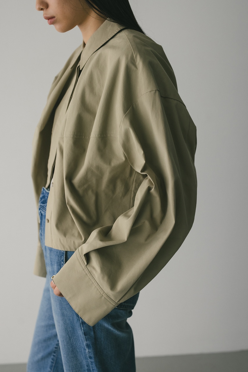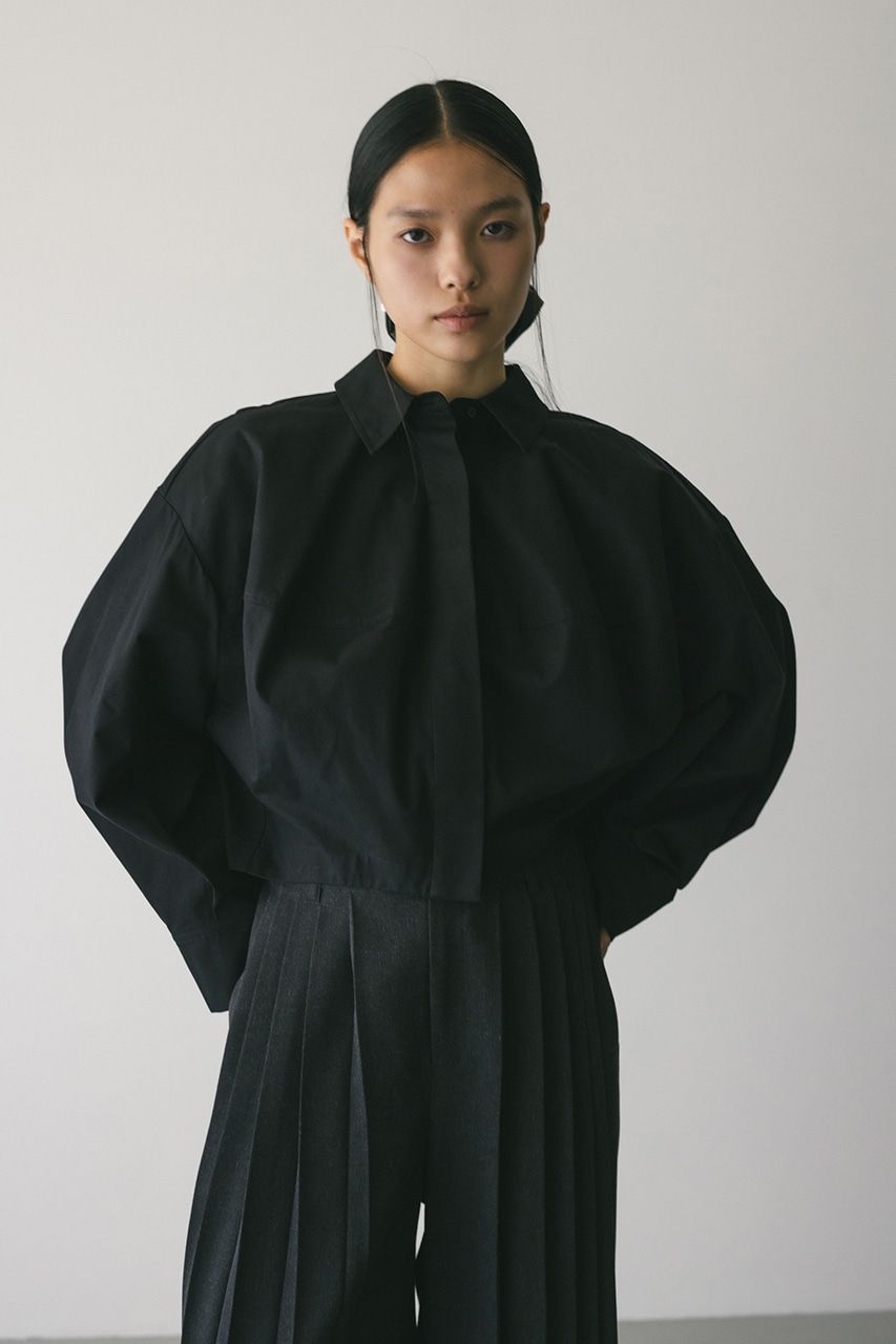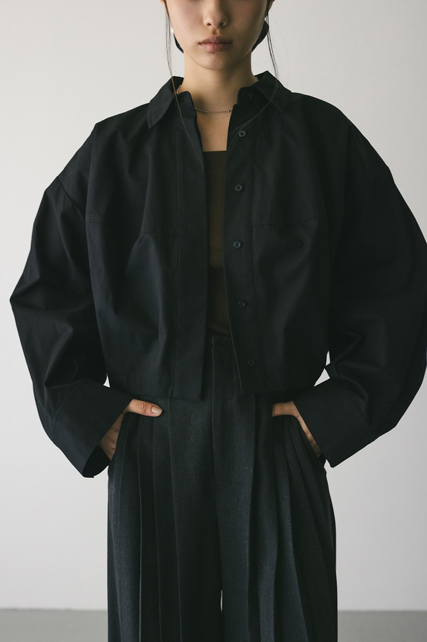 袖口のワイドスリーブと前にふったジャケットのような袖のシルエットがモードなショートシャツ。コンパクトな丈感とふくらみのあるパターンでつくる立体感のある丸いシルエットがポイント。前身頃は比翼仕立てですっきりとしたデザインに仕上げました。しっかりとした張り感のあるシャツ生地を使用しているのでトップスとしてはもちろん、羽織としても着用いただけます。ストレッチなし、透け感なし。