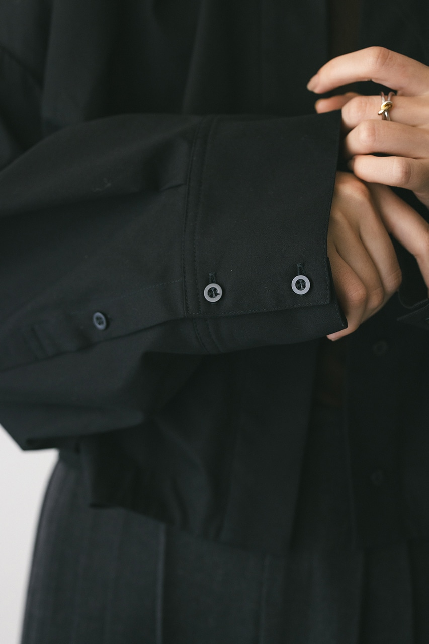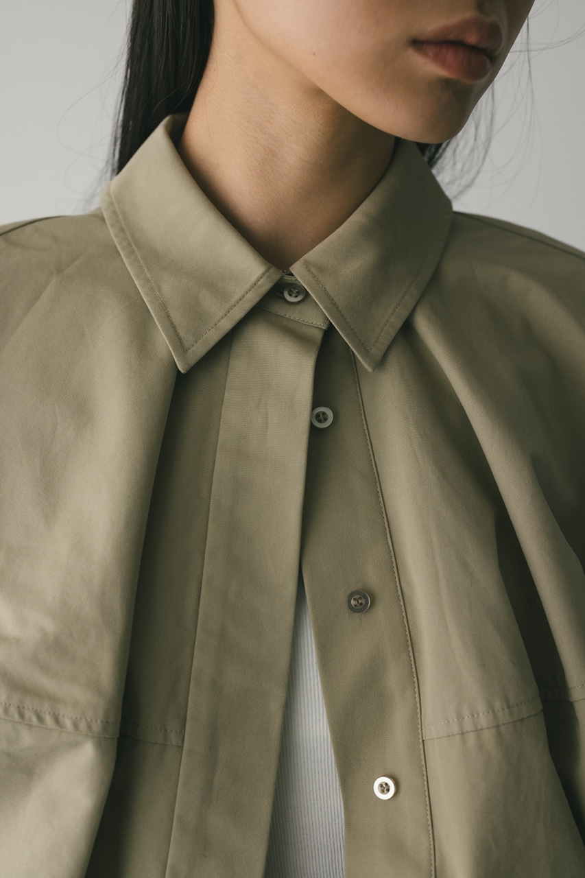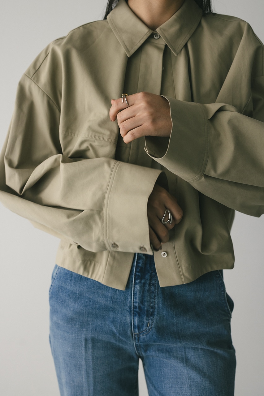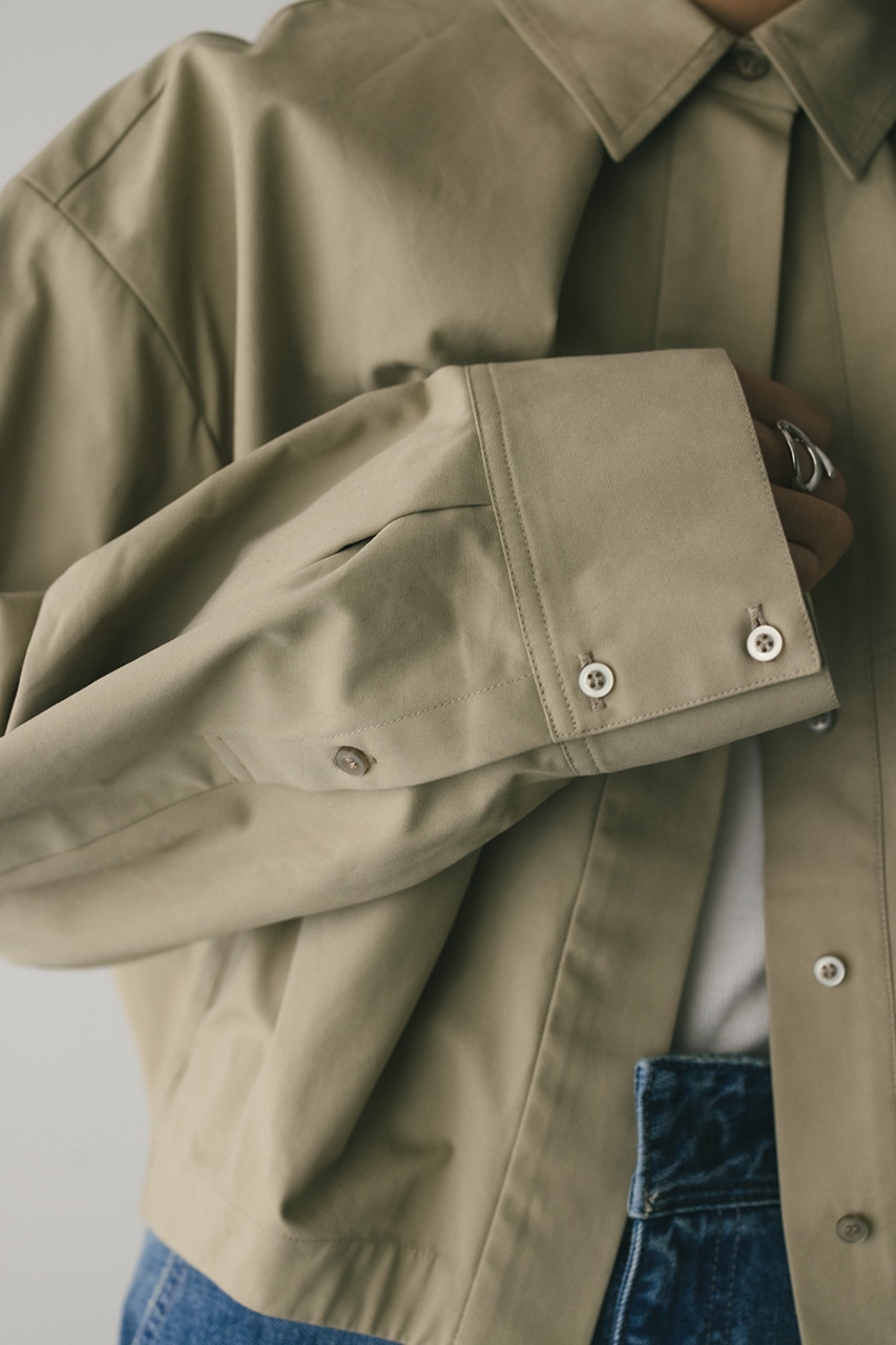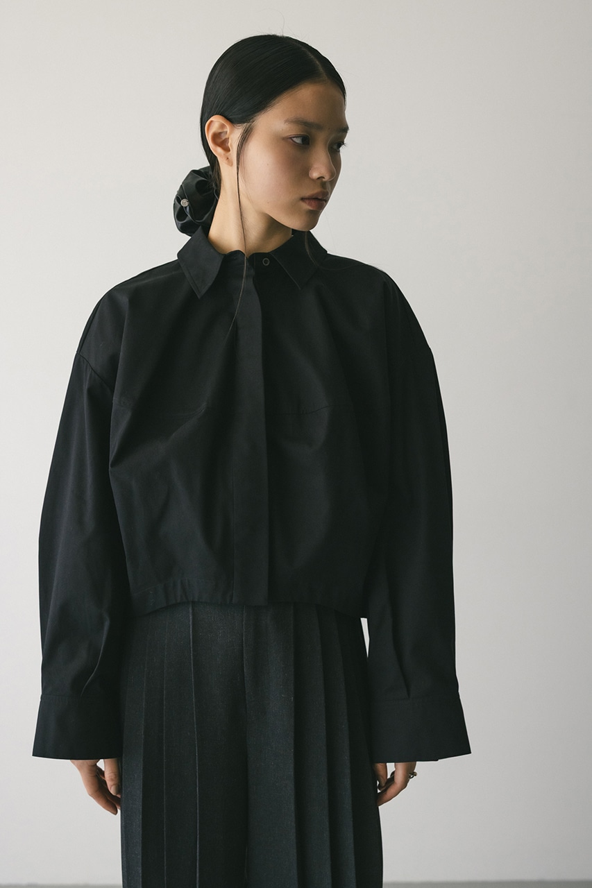 袖口のワイドスリーブと前にふったジャケットのような袖のシルエットがモードなショートシャツ。コンパクトな丈感とふくらみのあるパターンでつくる立体感のある丸いシルエットがポイント。前身頃は比翼仕立てですっきりとしたデザインに仕上げました。しっかりとした張り感のあるシャツ生地を使用しているのでトップスとしてはもちろん、羽織としても着用いただけます。ストレッチなし、透け感なし。