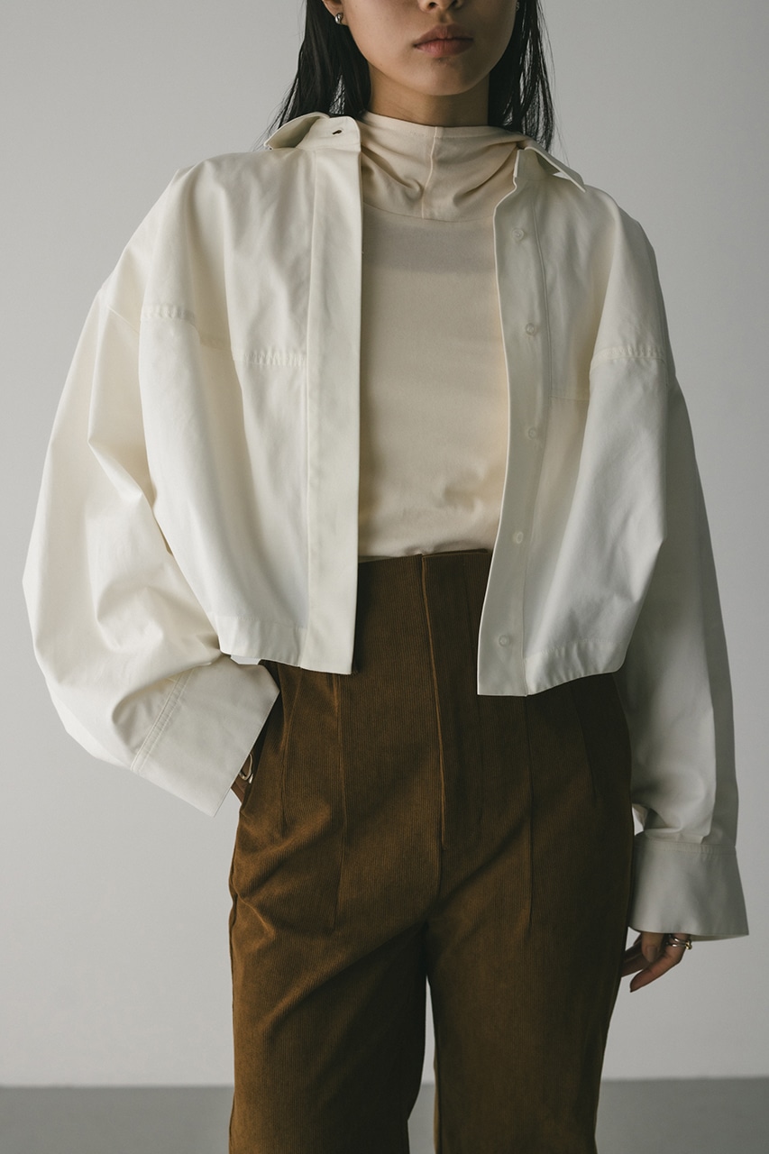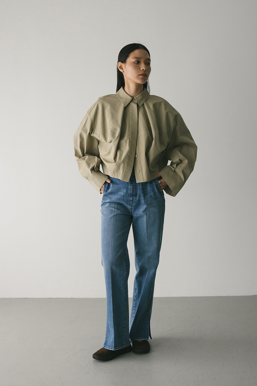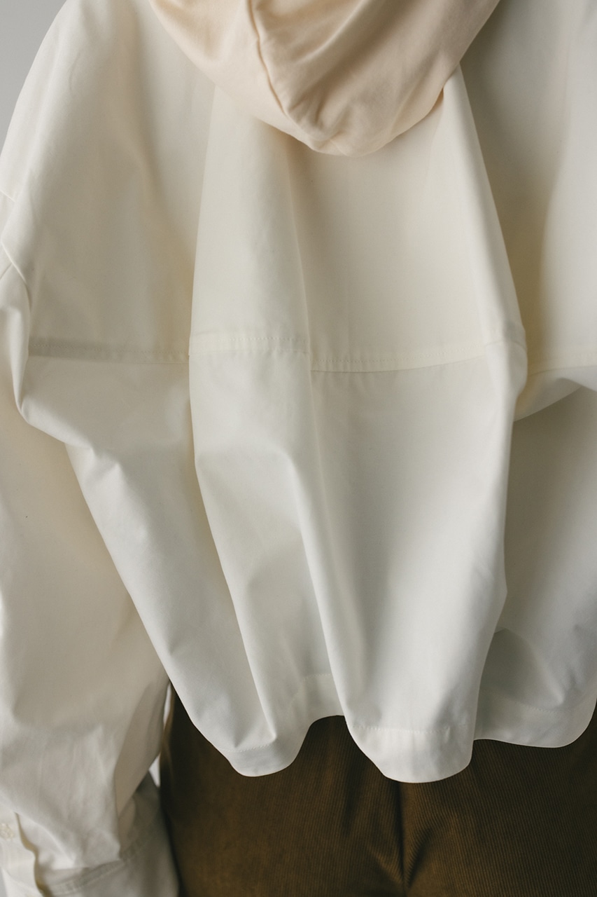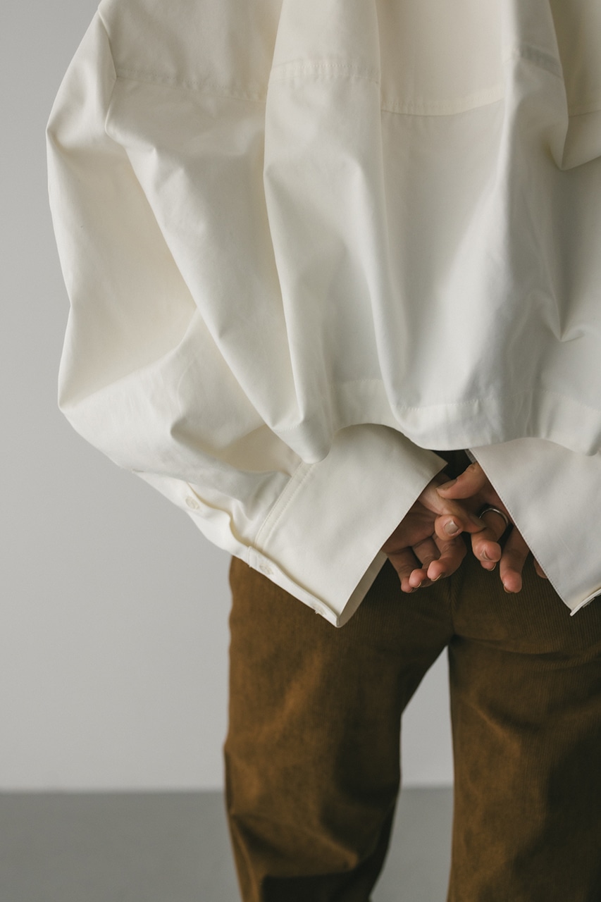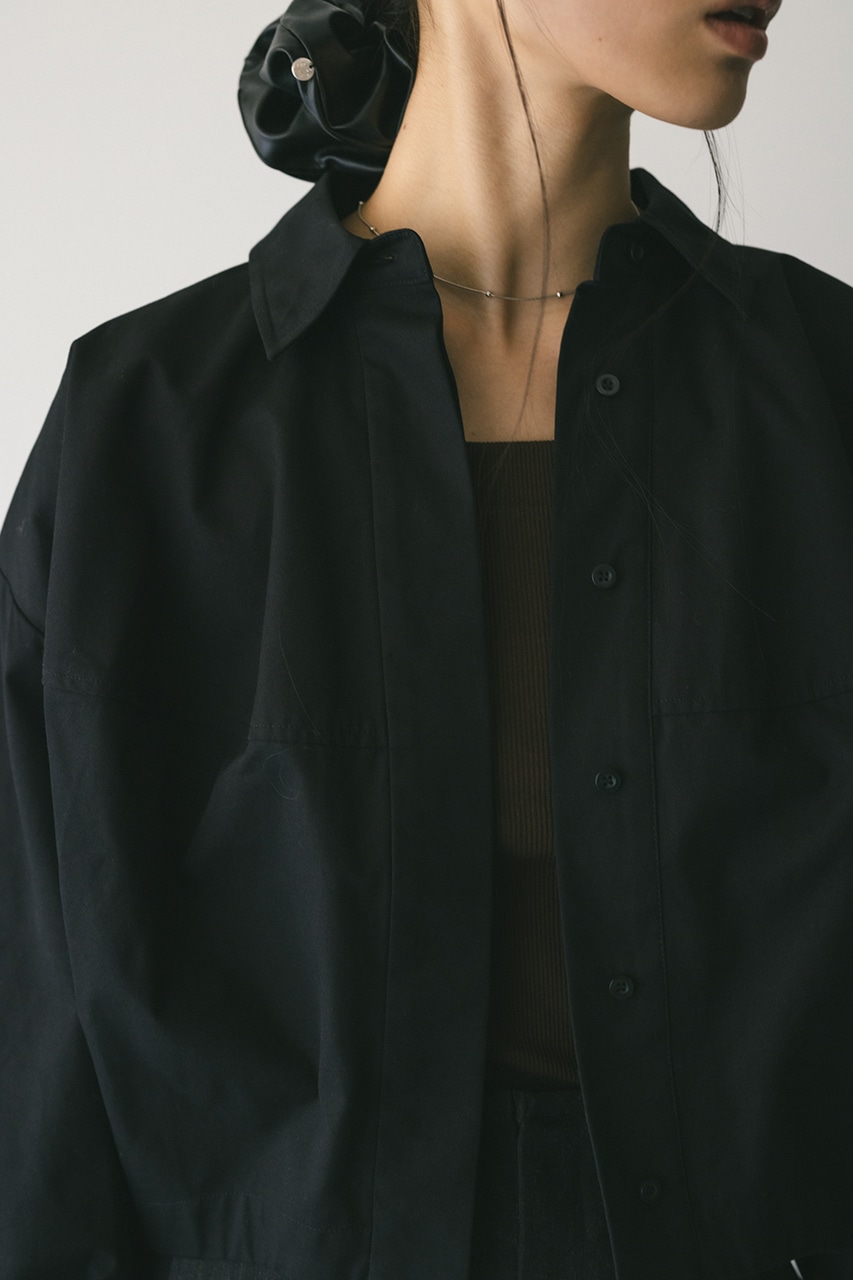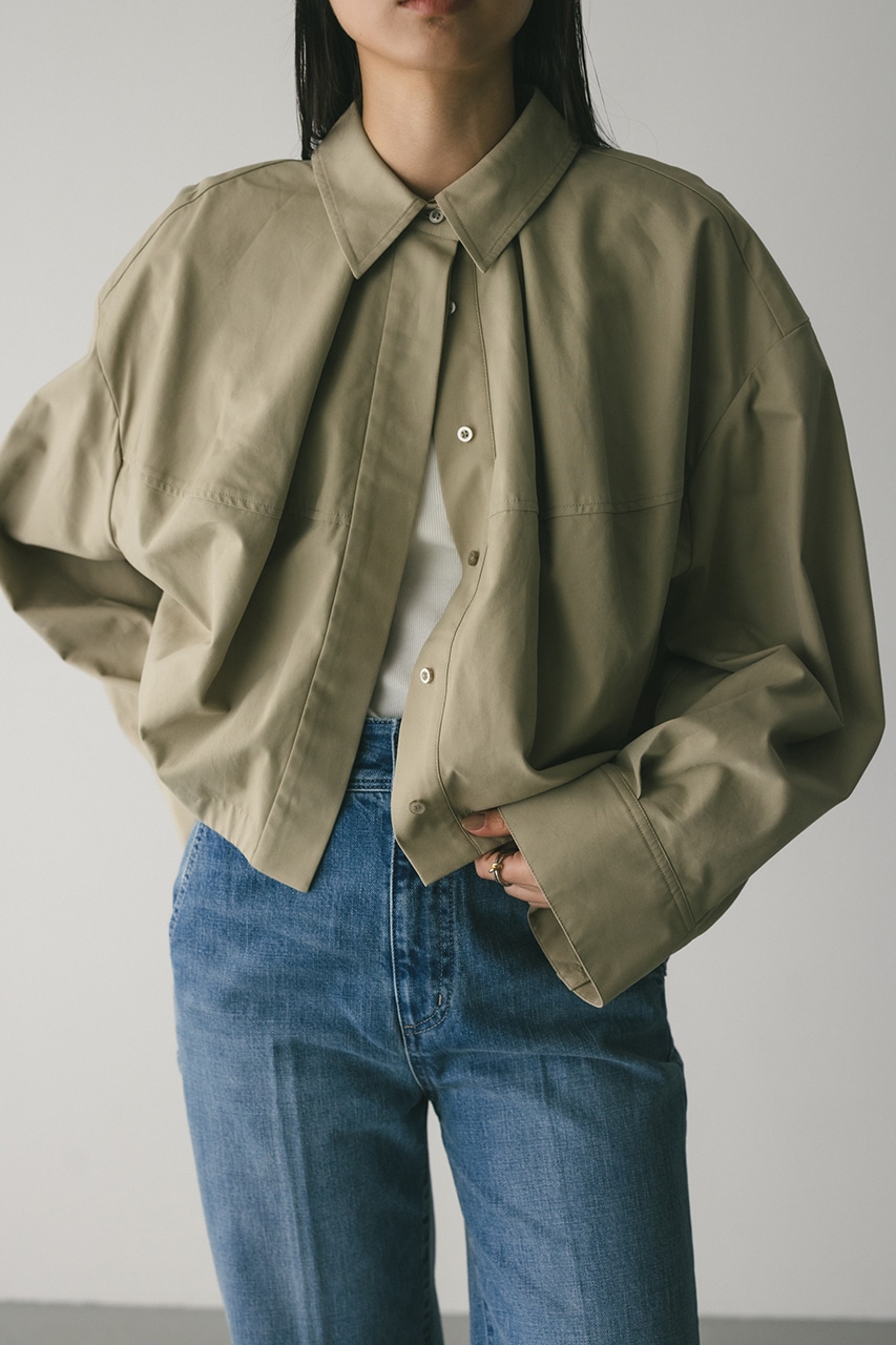 袖口のワイドスリーブと前にふったジャケットのような袖のシルエットがモードなショートシャツ。コンパクトな丈感とふくらみのあるパターンでつくる立体感のある丸いシルエットがポイント。前身頃は比翼仕立てですっきりとしたデザインに仕上げました。しっかりとした張り感のあるシャツ生地を使用しているのでトップスとしてはもちろん、羽織としても着用いただけます。ストレッチなし、透け感なし。