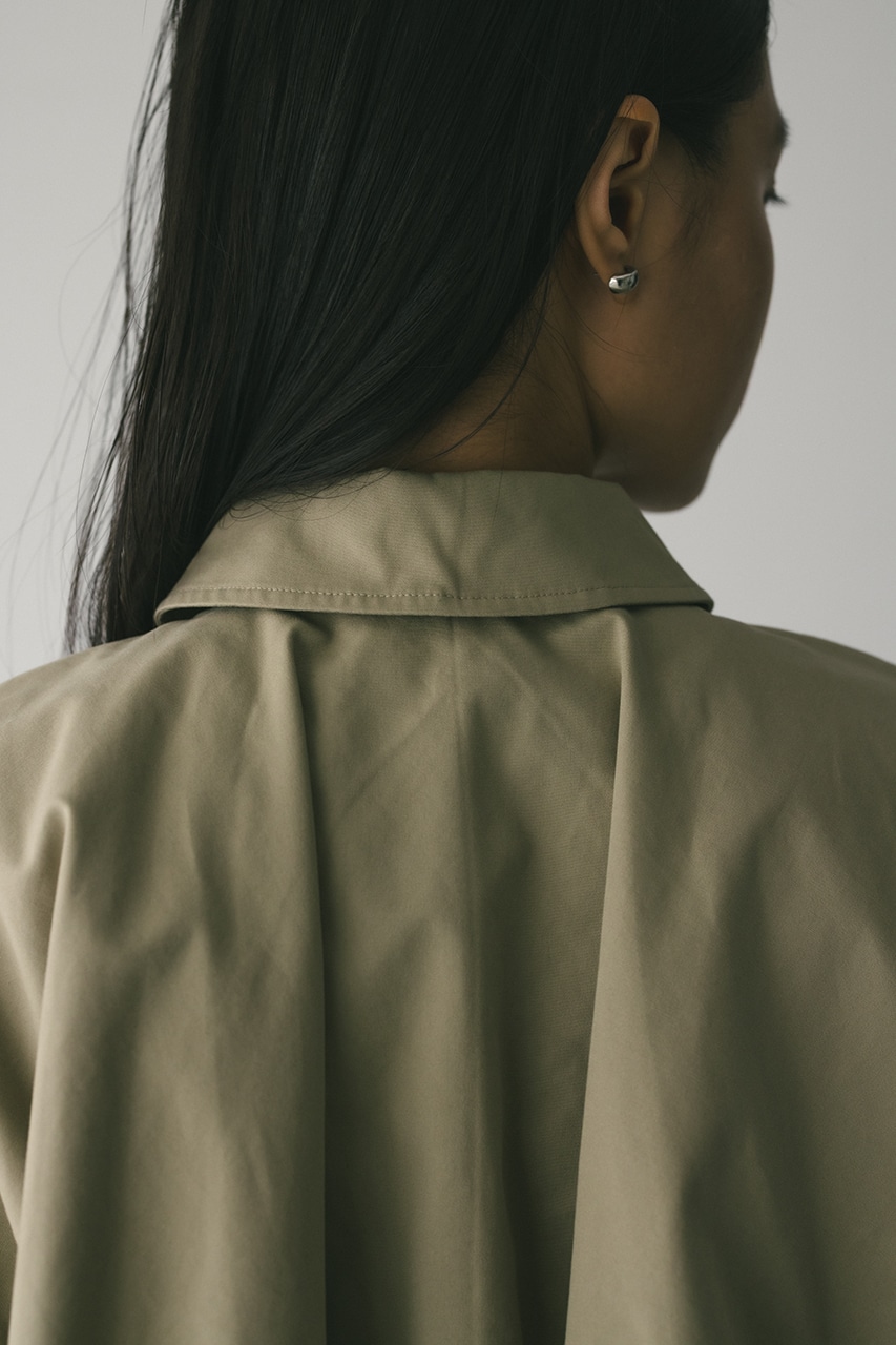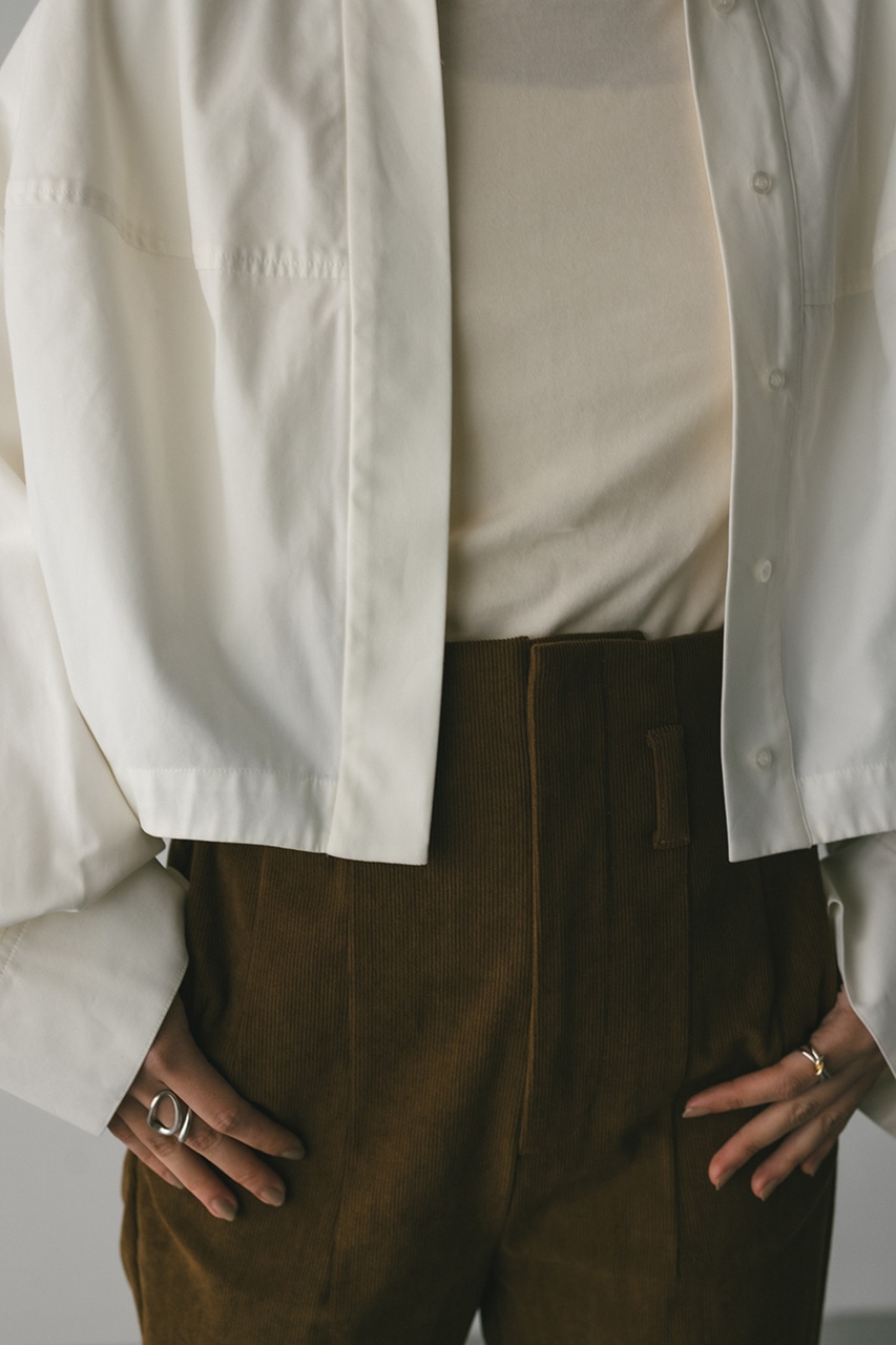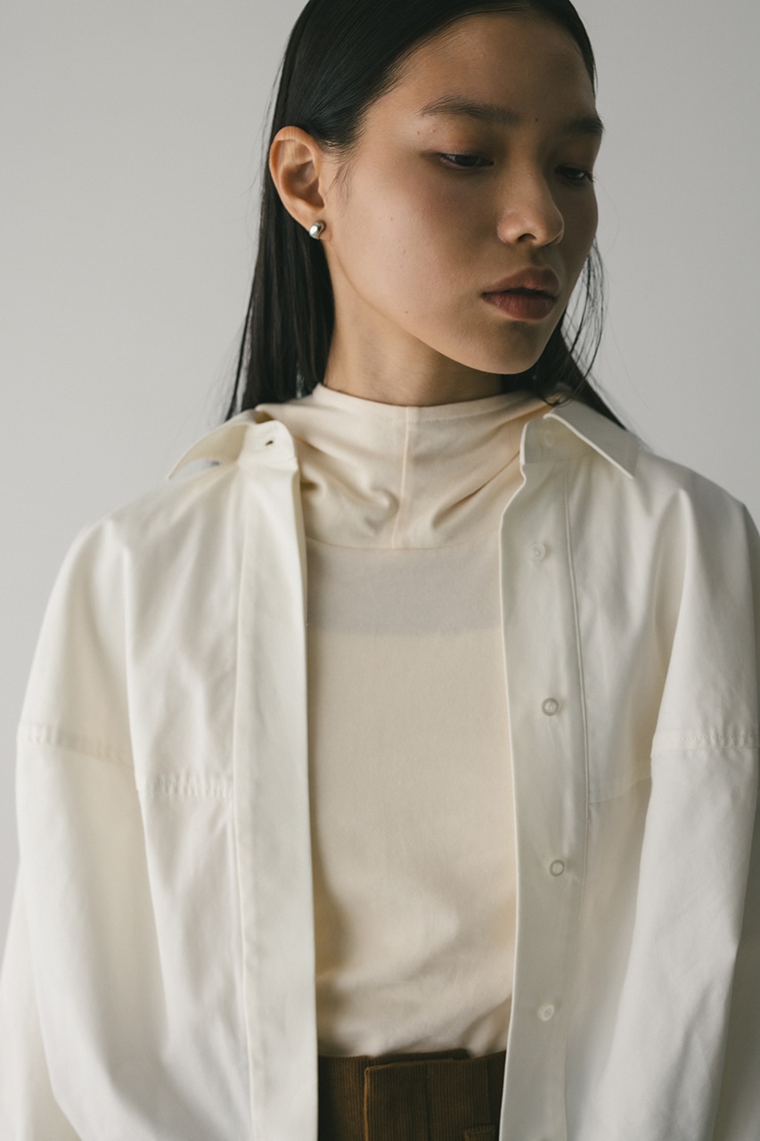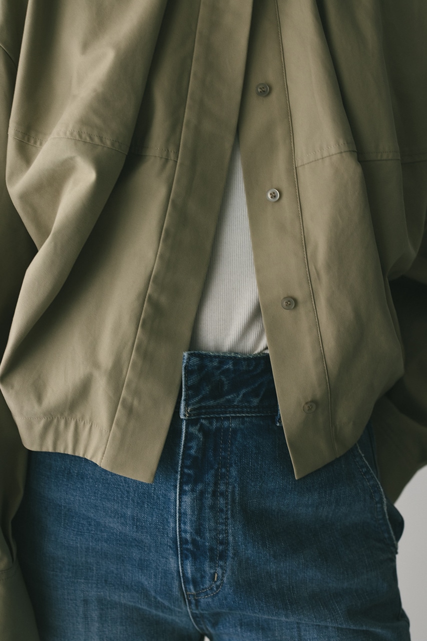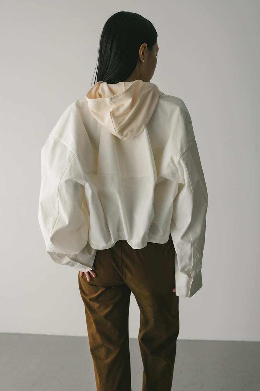 袖口のワイドスリーブと前にふったジャケットのような袖のシルエットがモードなショートシャツ。コンパクトな丈感とふくらみのあるパターンでつくる立体感のある丸いシルエットがポイント。前身頃は比翼仕立てですっきりとしたデザインに仕上げました。しっかりとした張り感のあるシャツ生地を使用しているのでトップスとしてはもちろん、羽織としても着用いただけます。ストレッチなし、透け感なし。