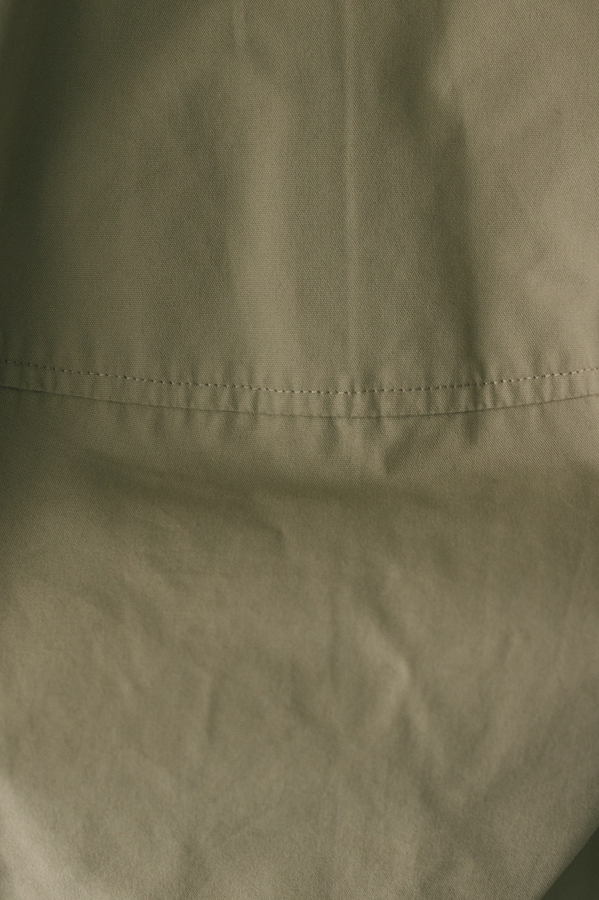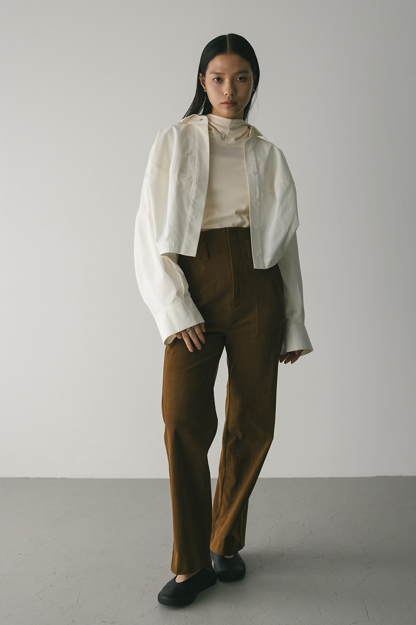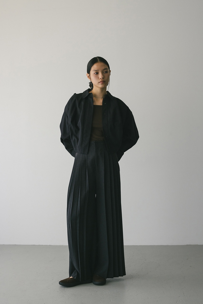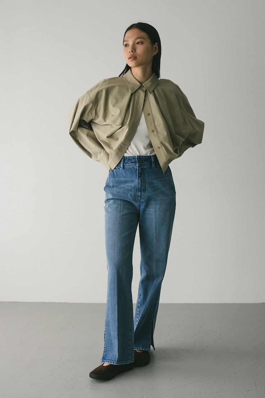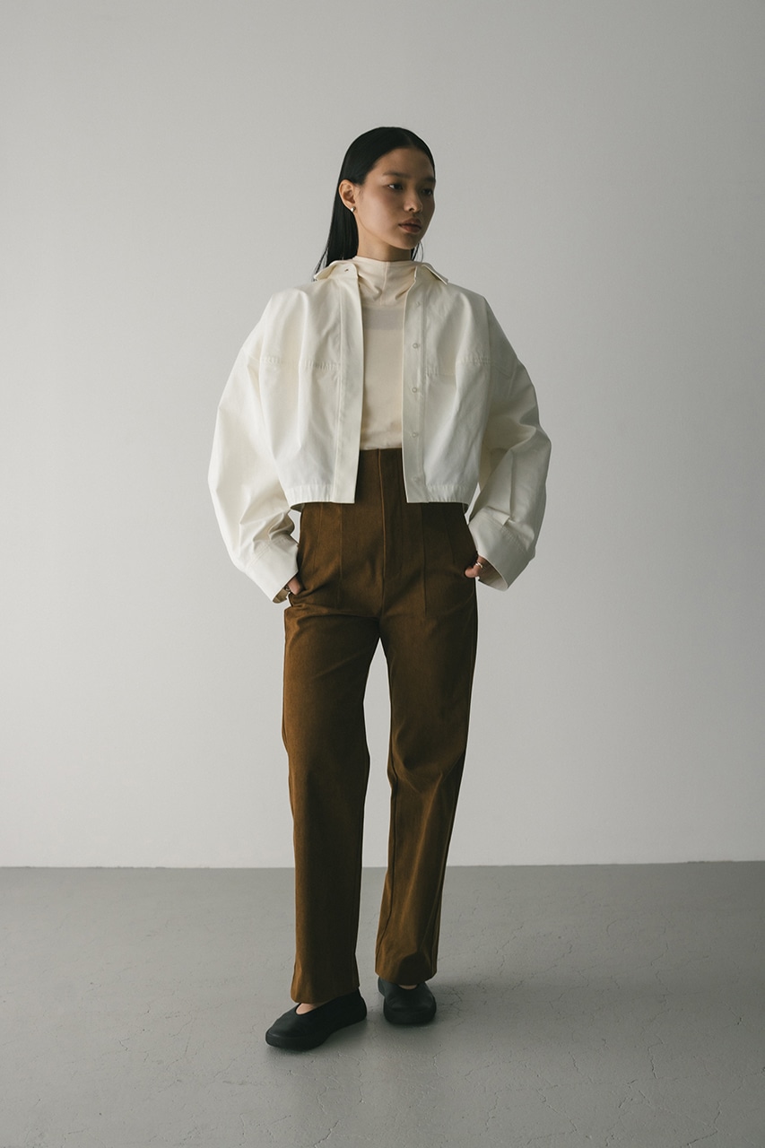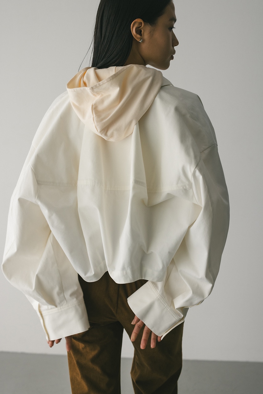 袖口のワイドスリーブと前にふったジャケットのような袖のシルエットがモードなショートシャツ。コンパクトな丈感とふくらみのあるパターンでつくる立体感のある丸いシルエットがポイント。前身頃は比翼仕立てですっきりとしたデザインに仕上げました。しっかりとした張り感のあるシャツ生地を使用しているのでトップスとしてはもちろん、羽織としても着用いただけます。ストレッチなし、透け感なし。