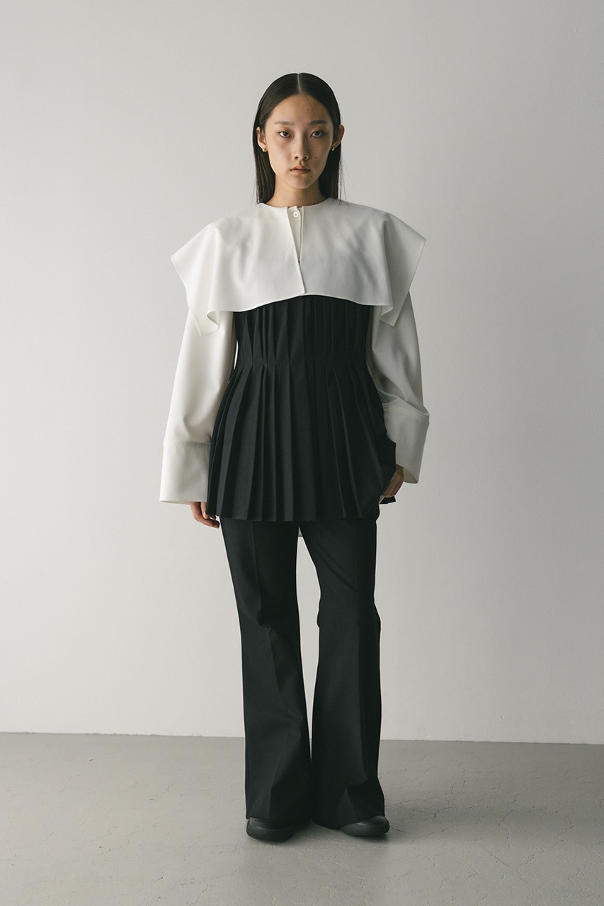 ランダムにタッキングしたデザインがポイントのペプラムキャミトップ。動きのあるイレギュラーなタックが他にはないデザイン。脇部分はあえてタック部分を縫い止めて、腕周りがもたつかずに動きやすくしています。やや長めの丈感なのでヒップ周りもカバーしてくれます。肩紐は調節可能。500IAT31-3901(センタープレスフレアパンツ)とセットアップ着用可能。ストレッチあり、透け感なし。