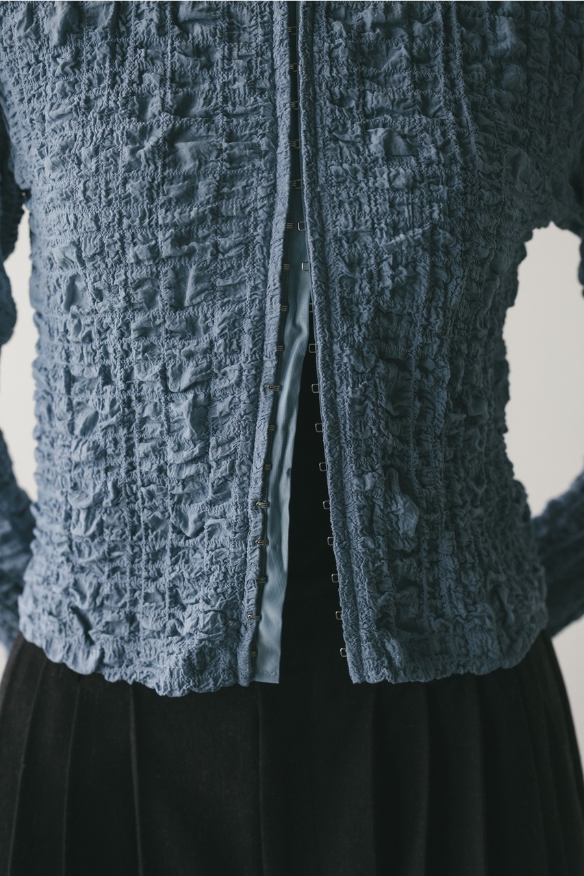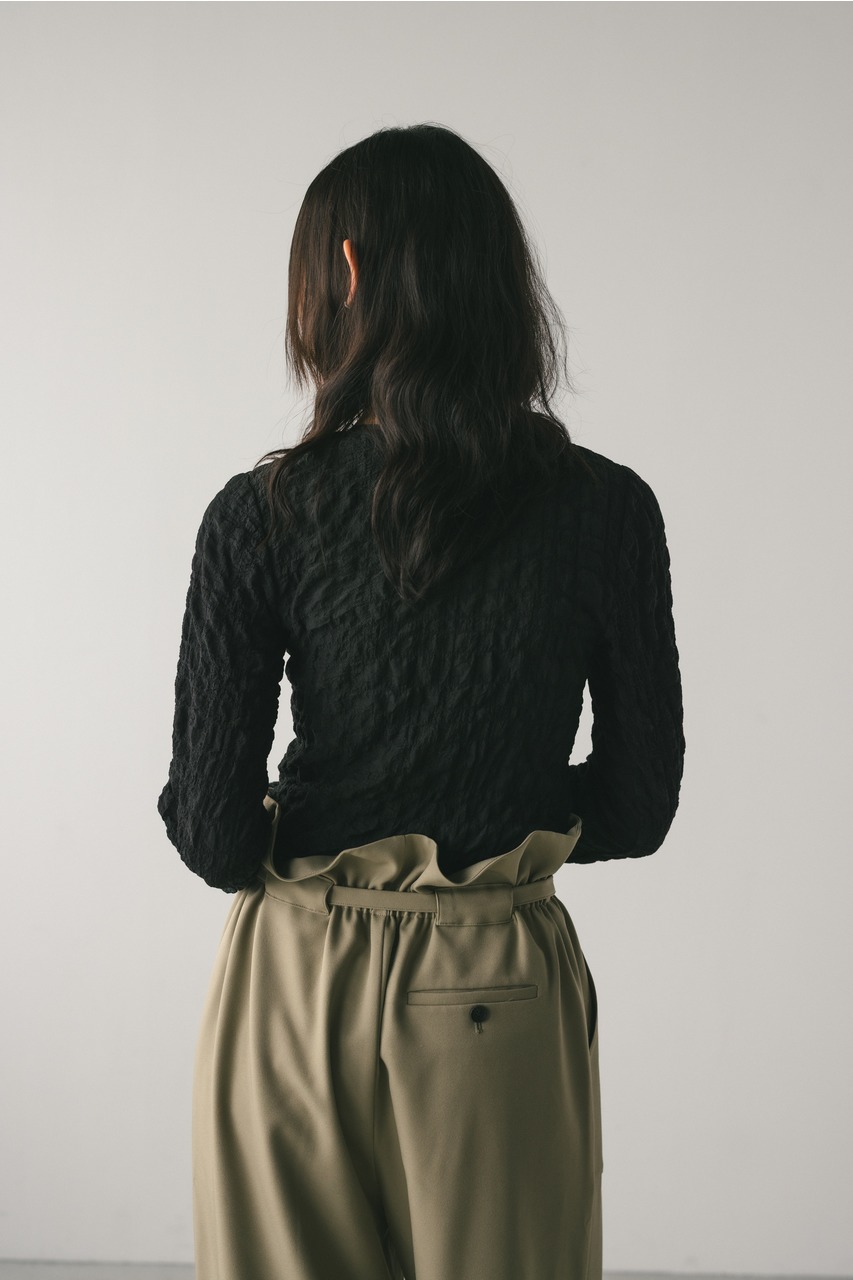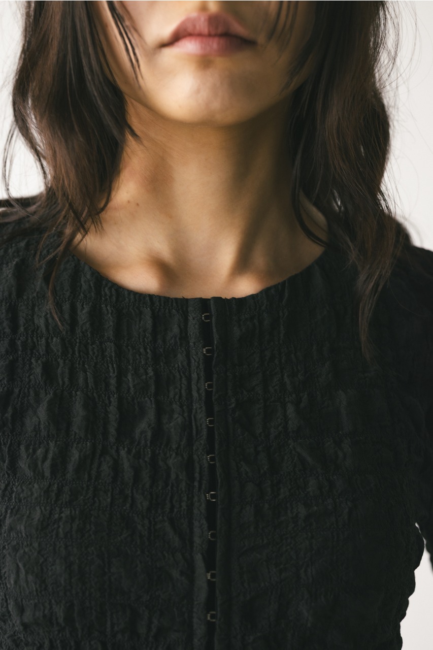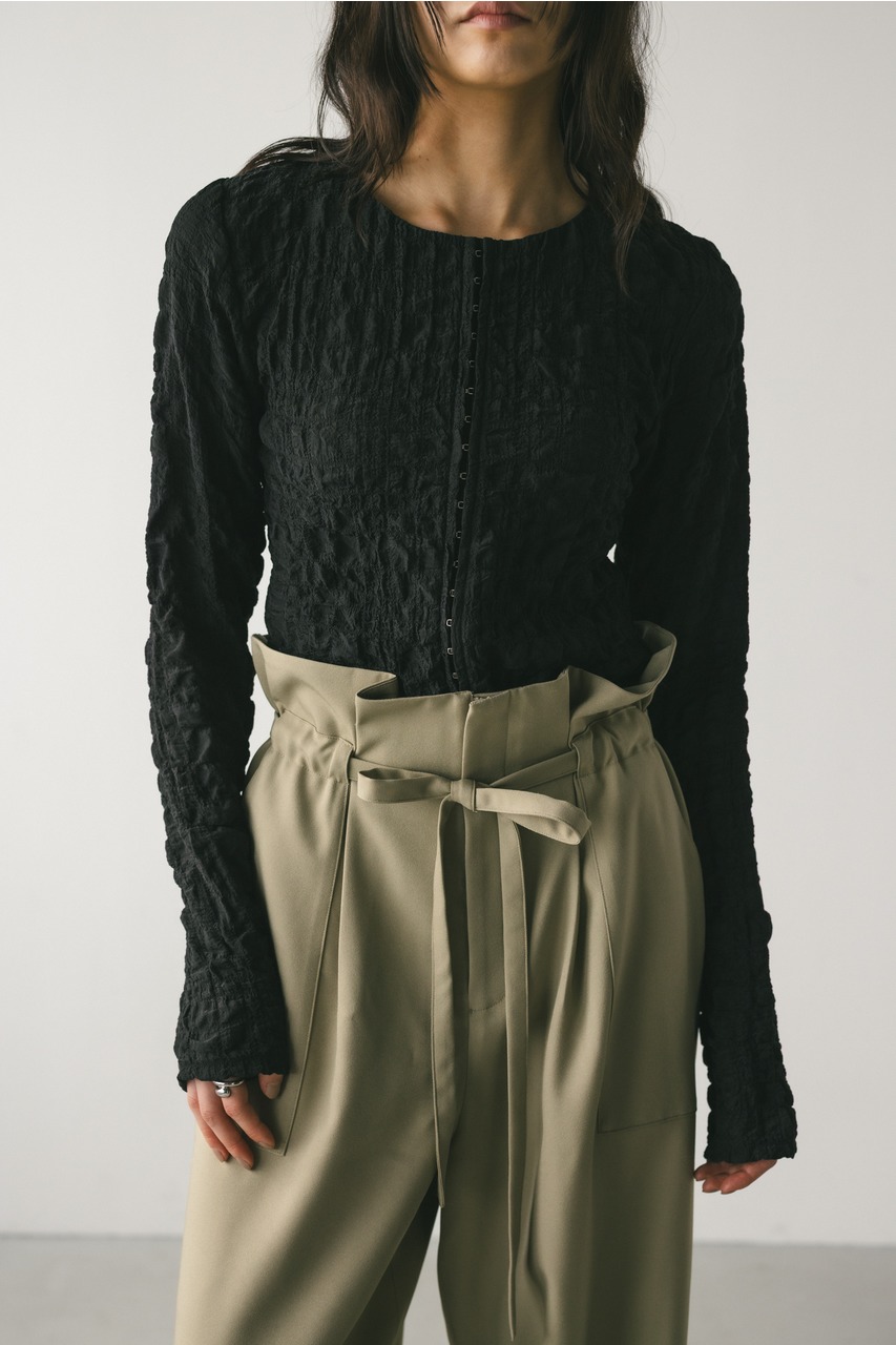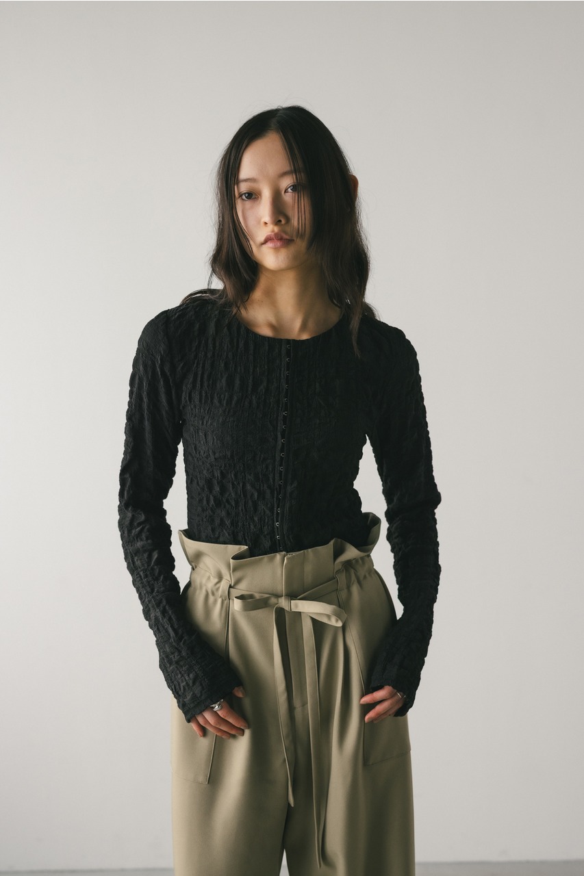 フロントのコルセットテープがデザインポイントのコンパクトトップ。着心地が良く伸縮性に優れた膨らみのあるシャーリング生地を使用しています。ストレッチあり、透け感ややあり