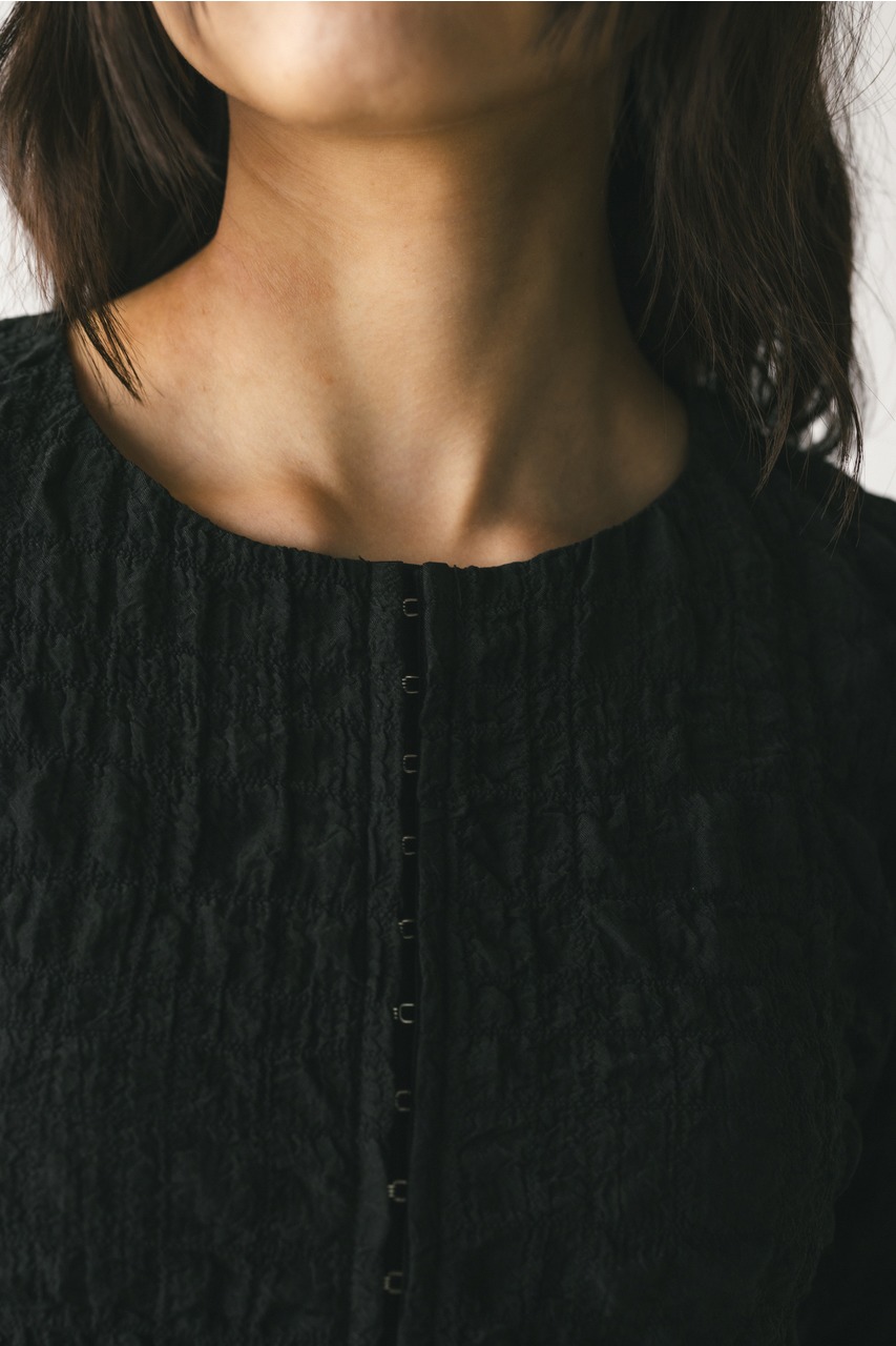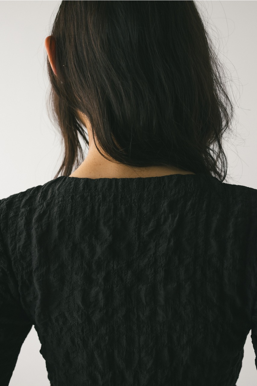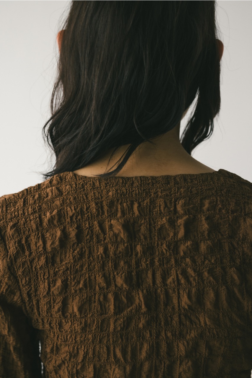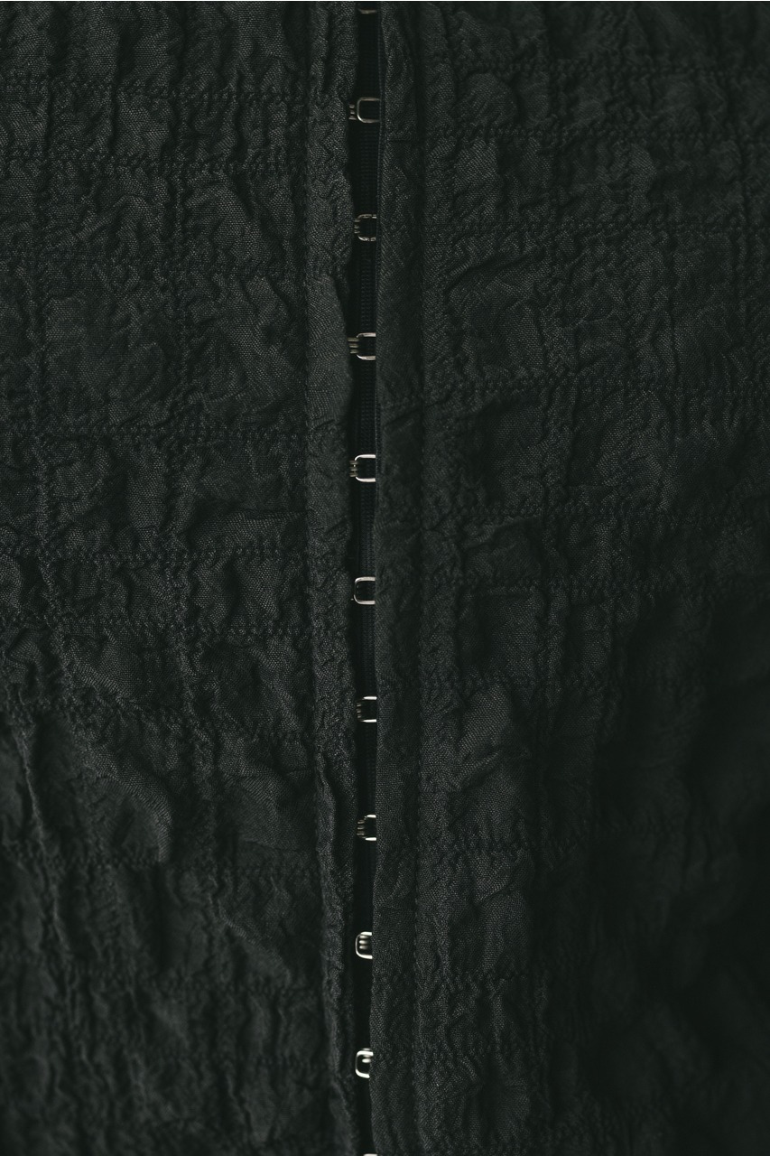 フロントのコルセットテープがデザインポイントのコンパクトトップ。着心地が良く伸縮性に優れた膨らみのあるシャーリング生地を使用しています。ストレッチあり、透け感ややあり
