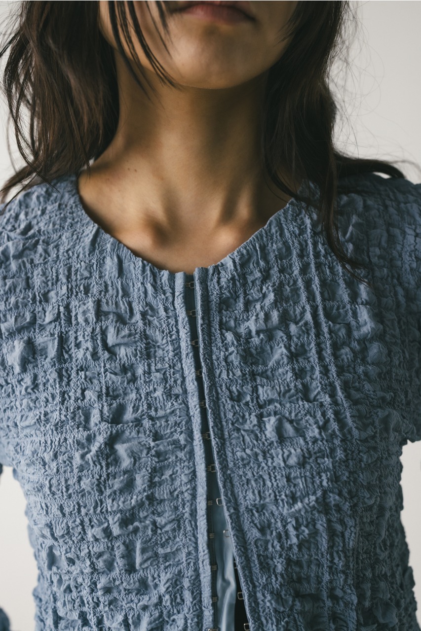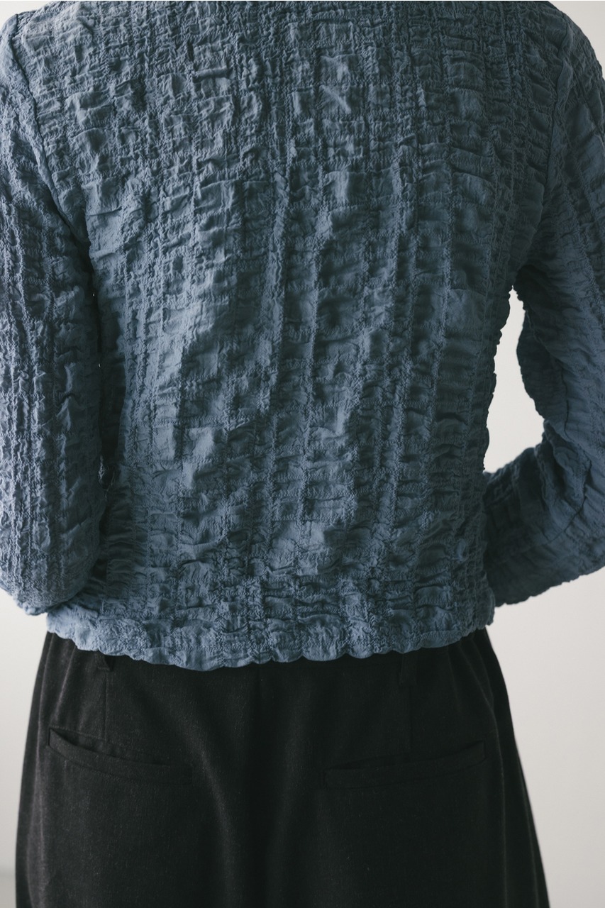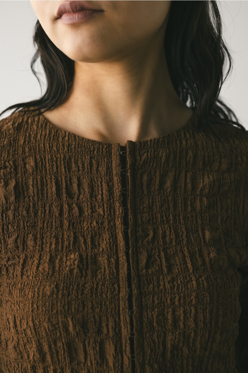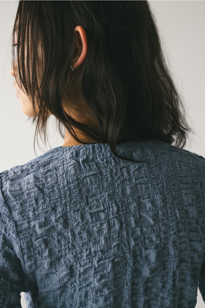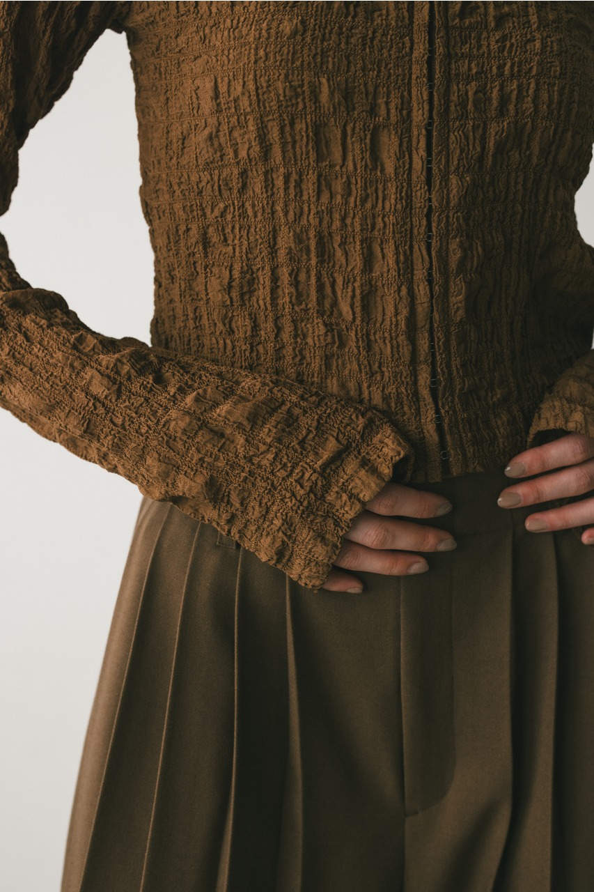 フロントのコルセットテープがデザインポイントのコンパクトトップ。着心地が良く伸縮性に優れた膨らみのあるシャーリング生地を使用しています。ストレッチあり、透け感ややあり