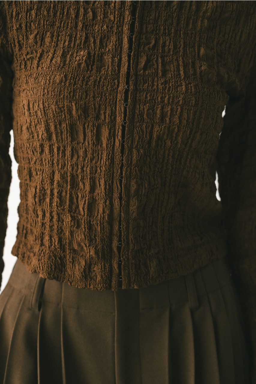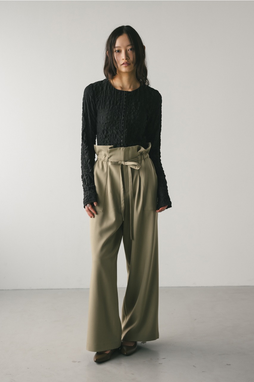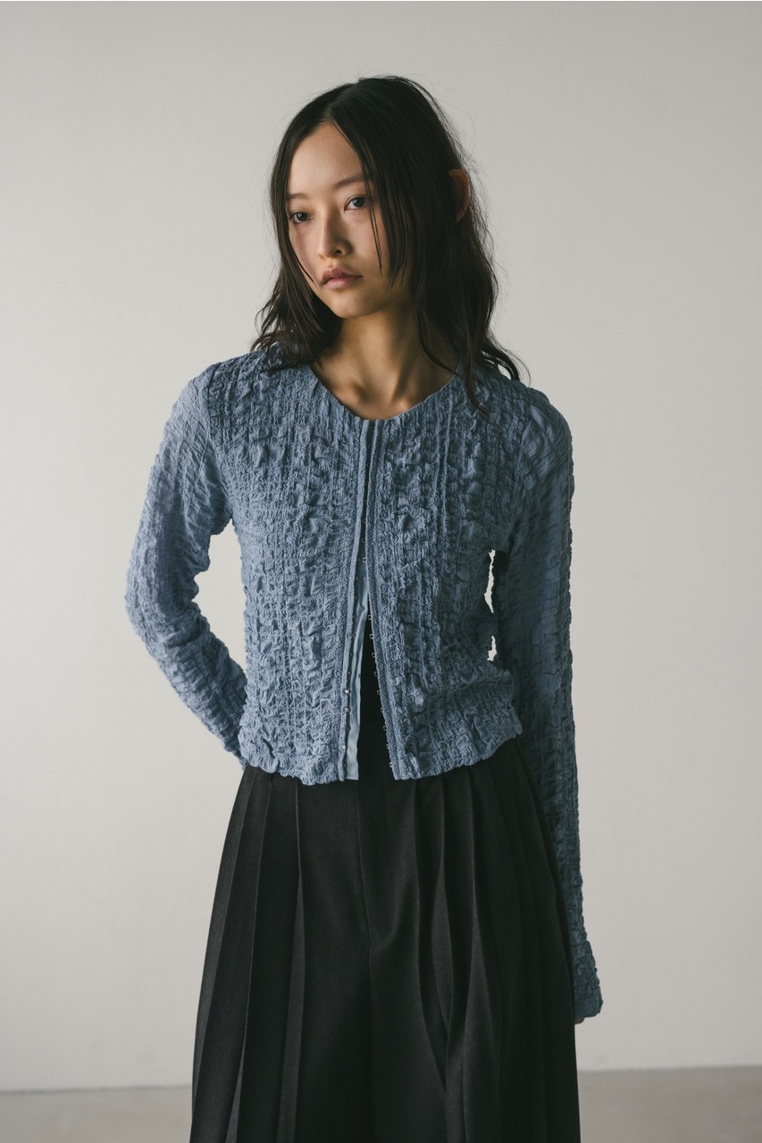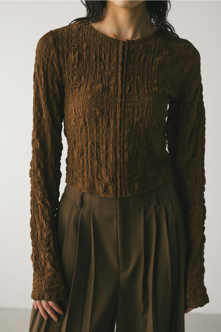 フロントのコルセットテープがデザインポイントのコンパクトトップ。着心地が良く伸縮性に優れた膨らみのあるシャーリング生地を使用しています。ストレッチあり、透け感ややあり