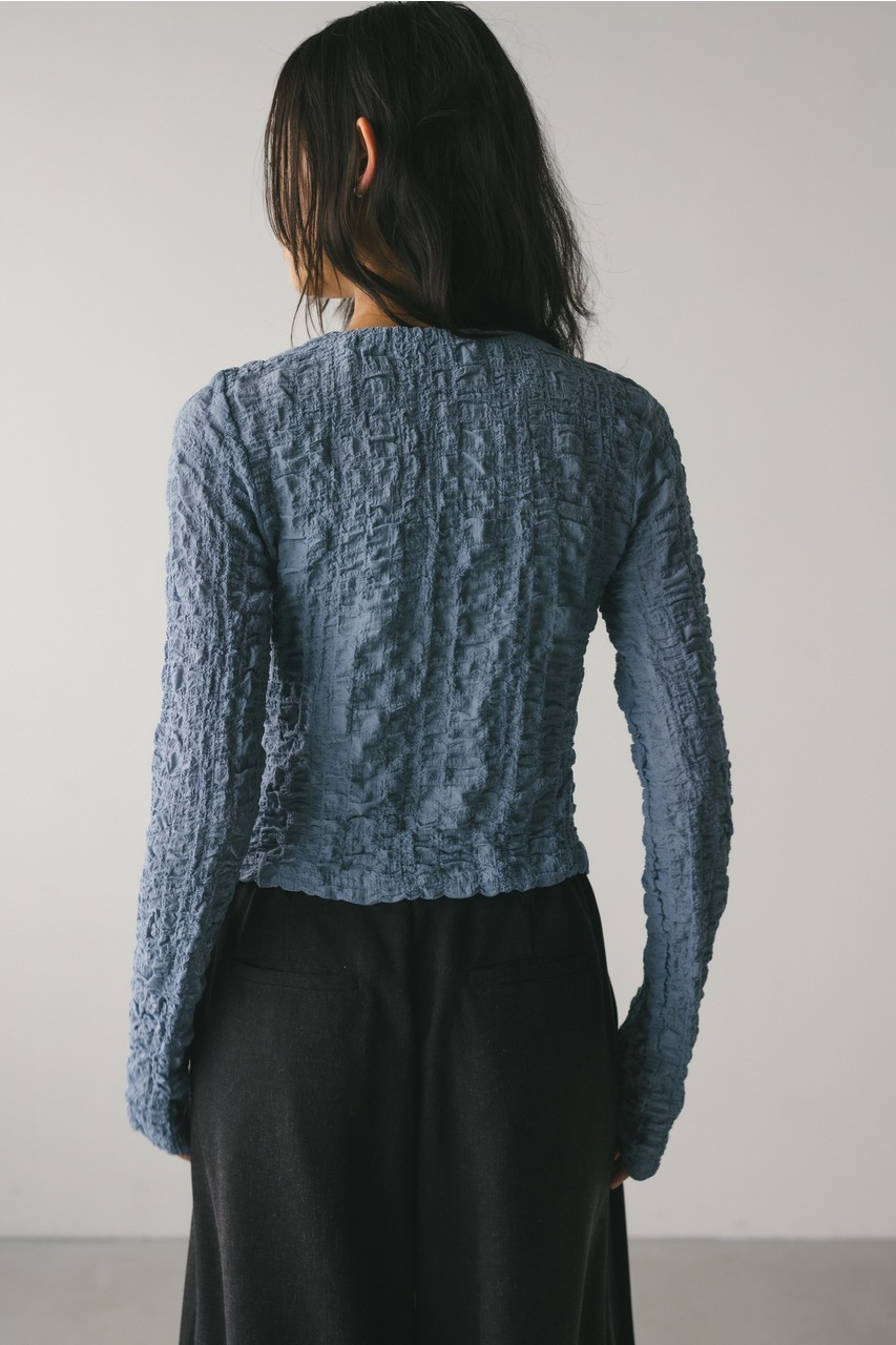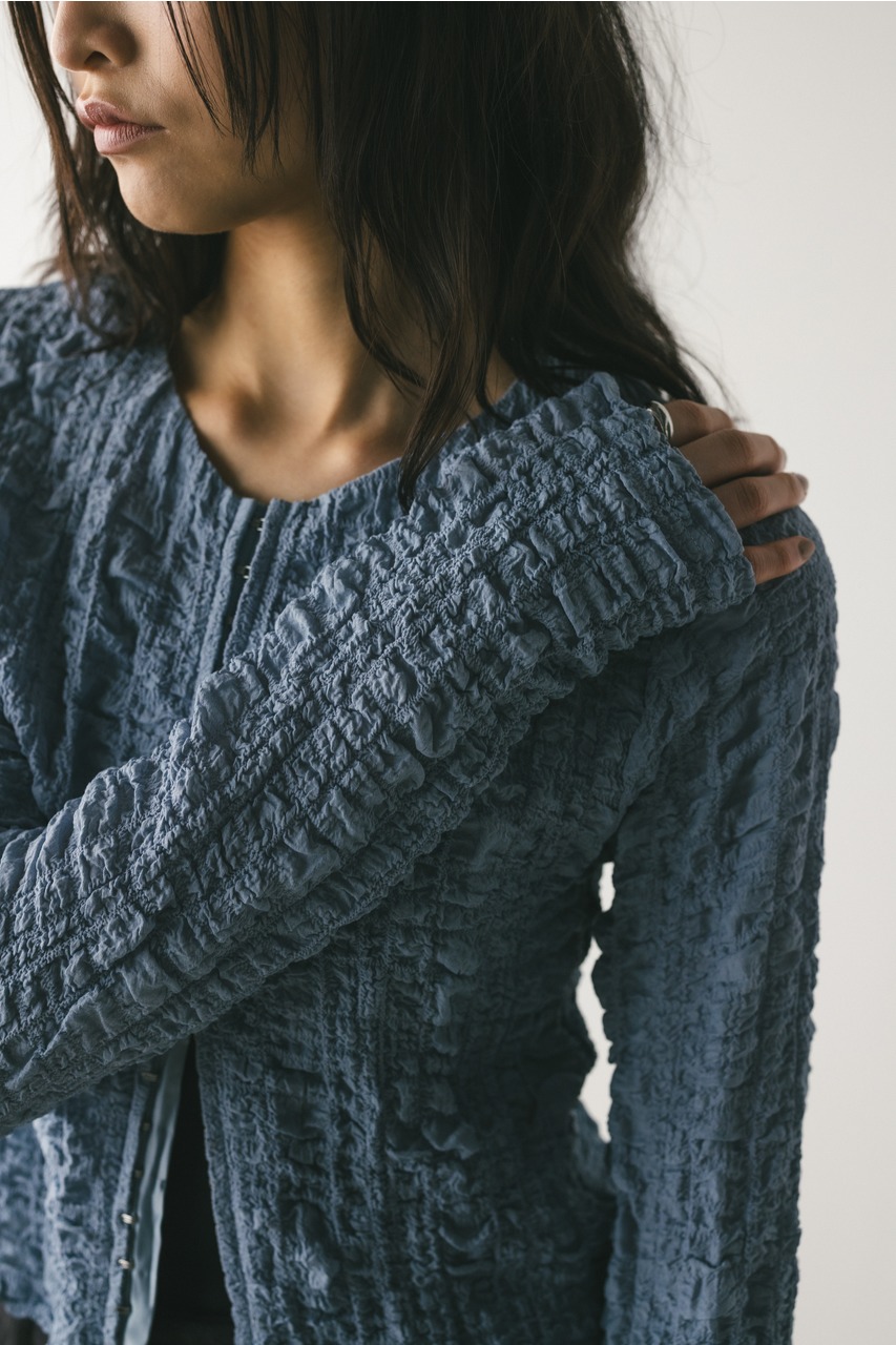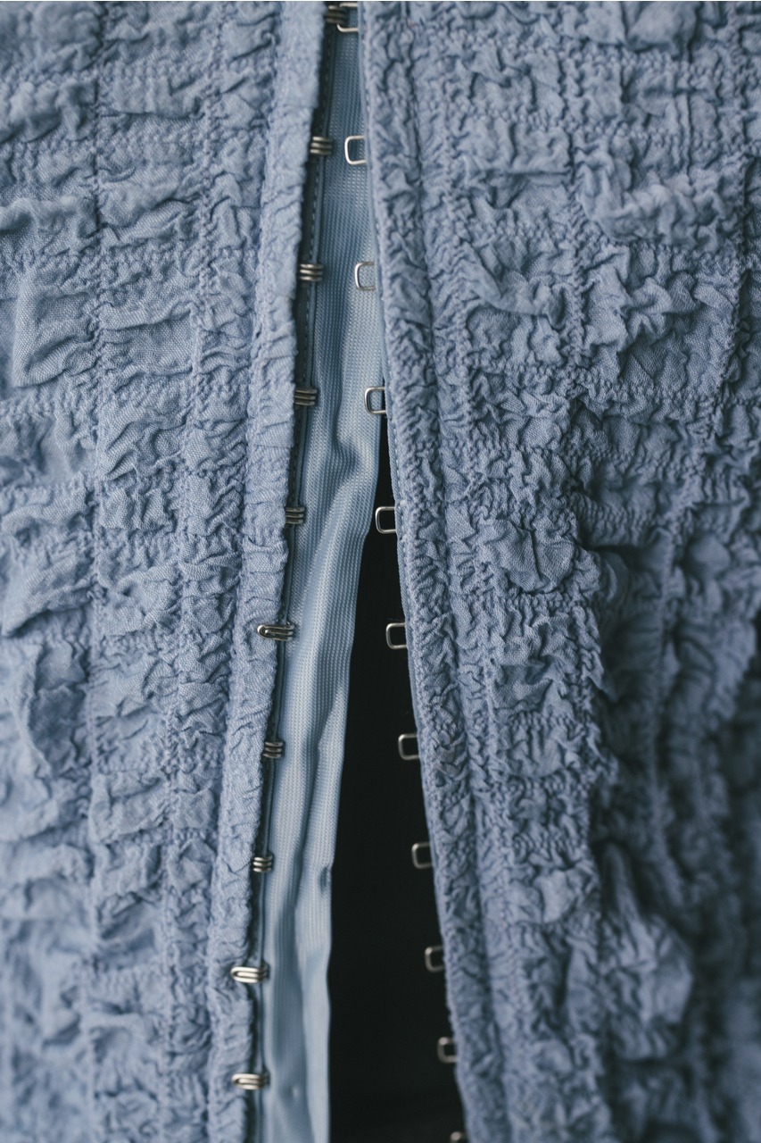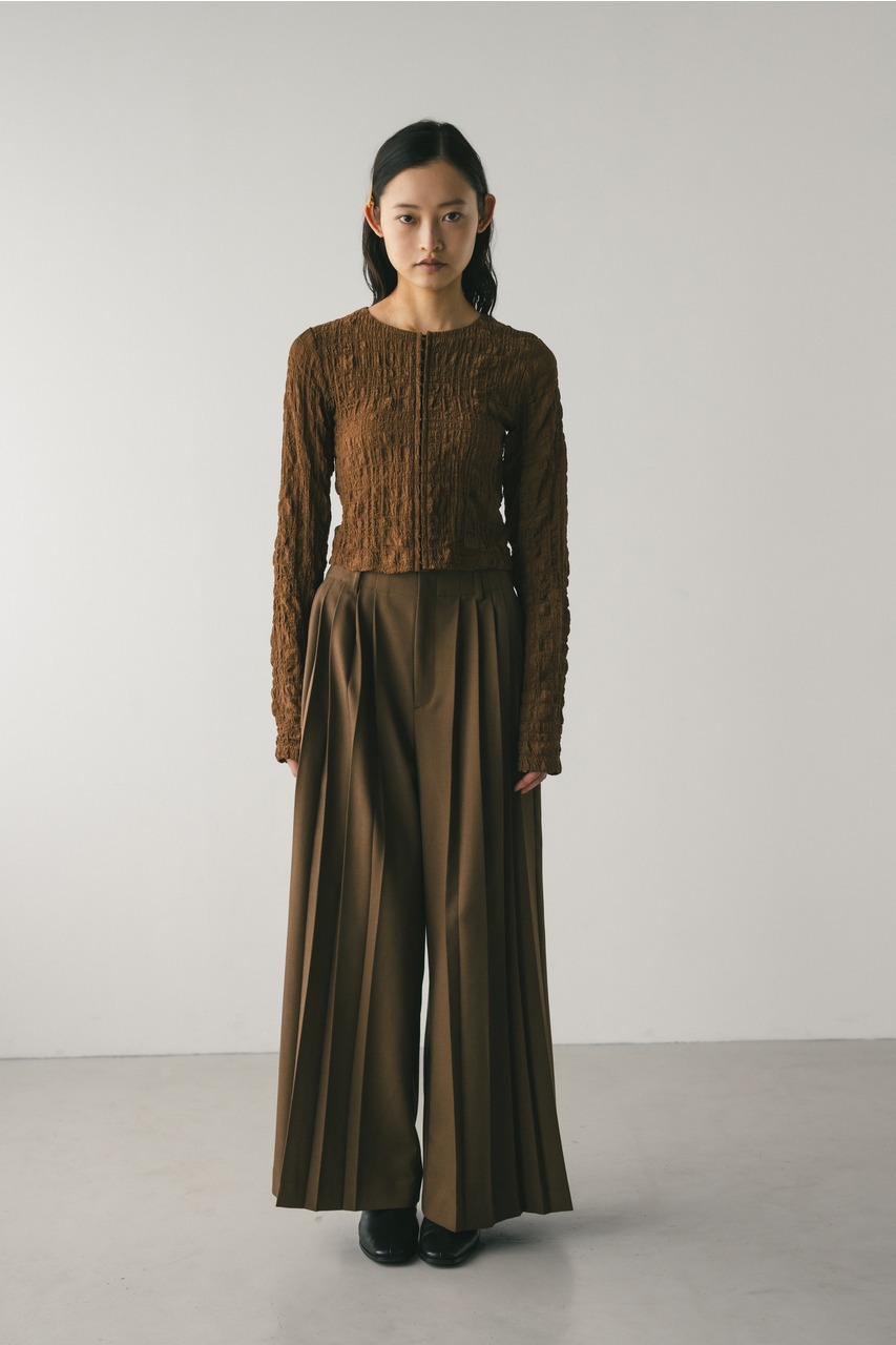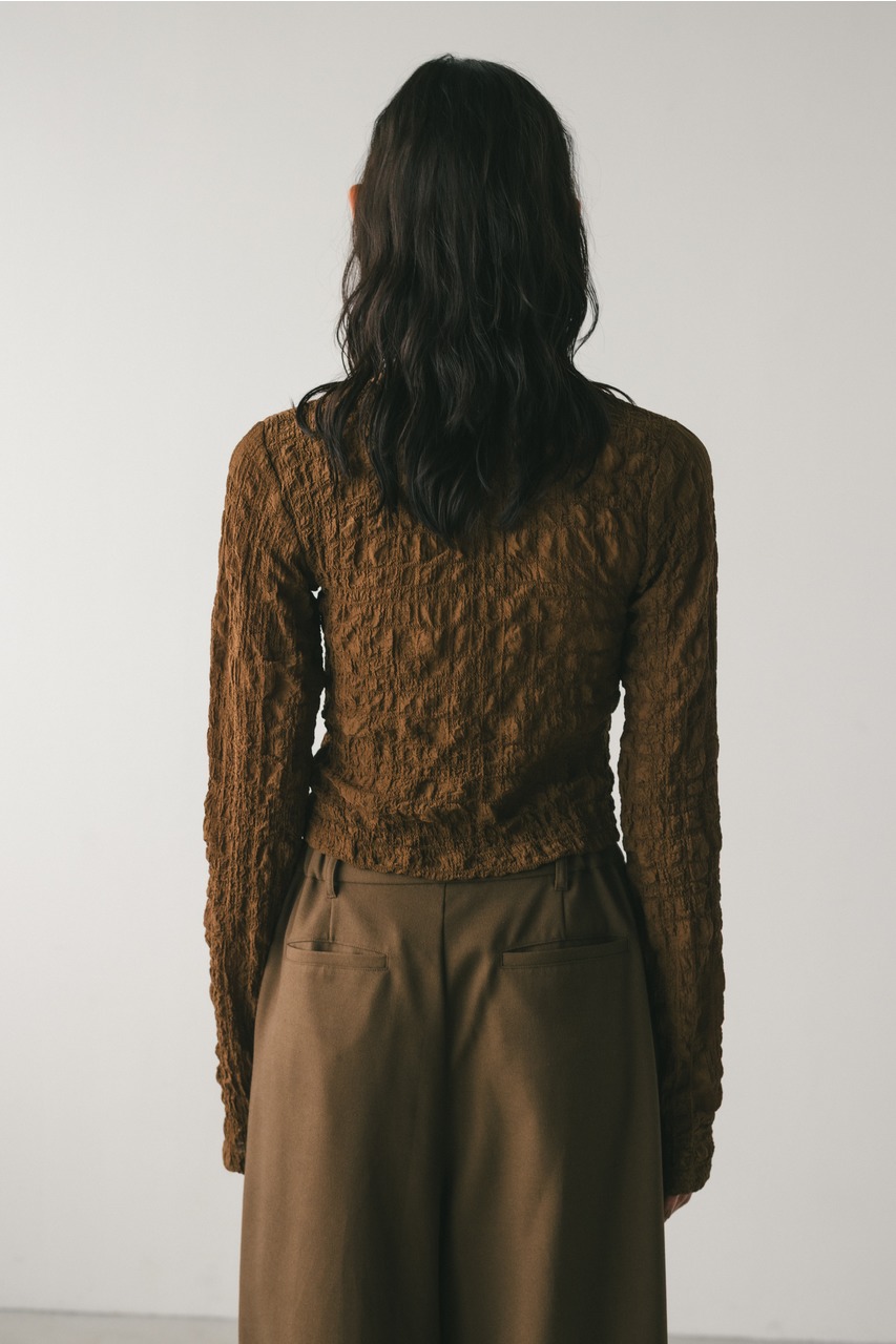 フロントのコルセットテープがデザインポイントのコンパクトトップ。着心地が良く伸縮性に優れた膨らみのあるシャーリング生地を使用しています。ストレッチあり、透け感ややあり