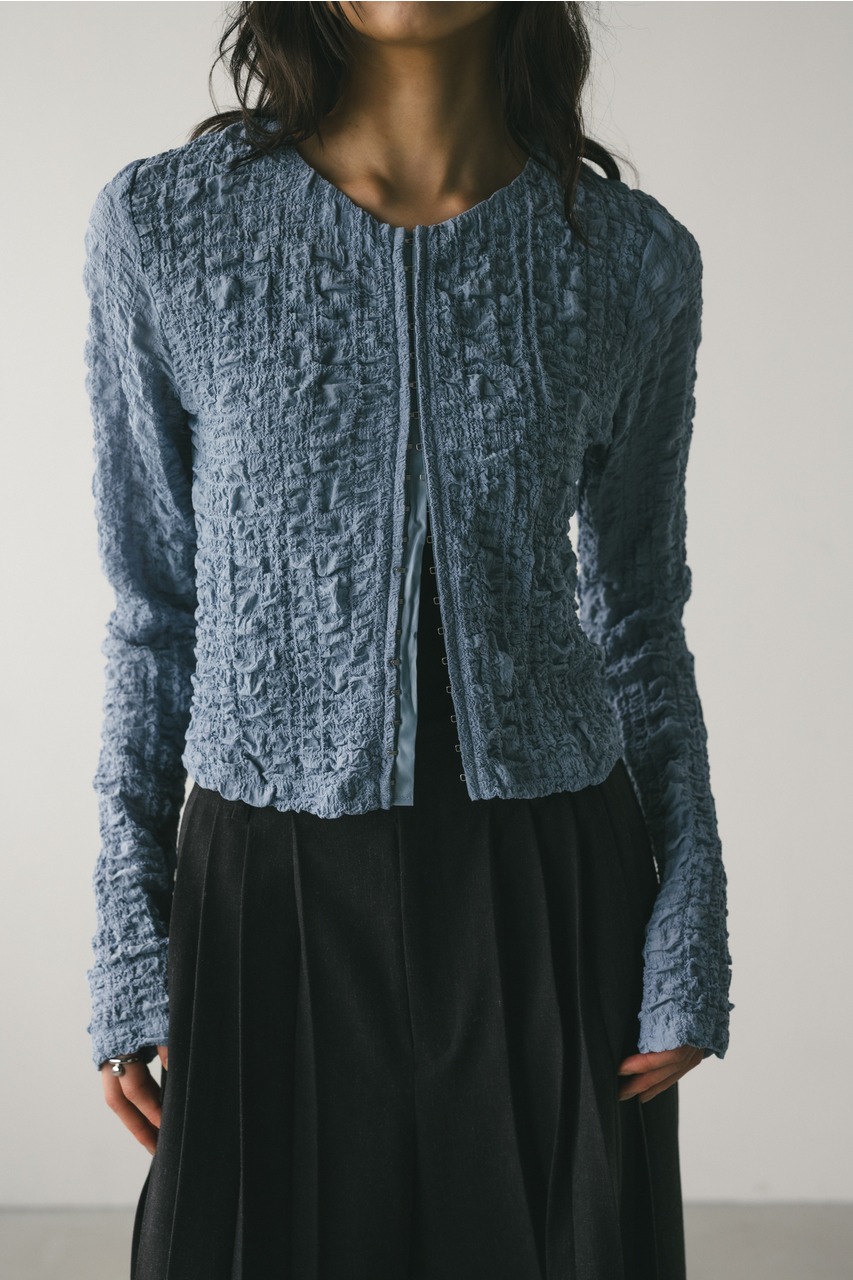 フロントのコルセットテープがデザインポイントのコンパクトトップ。着心地が良く伸縮性に優れた膨らみのあるシャーリング生地を使用しています。ストレッチあり、透け感ややあり
