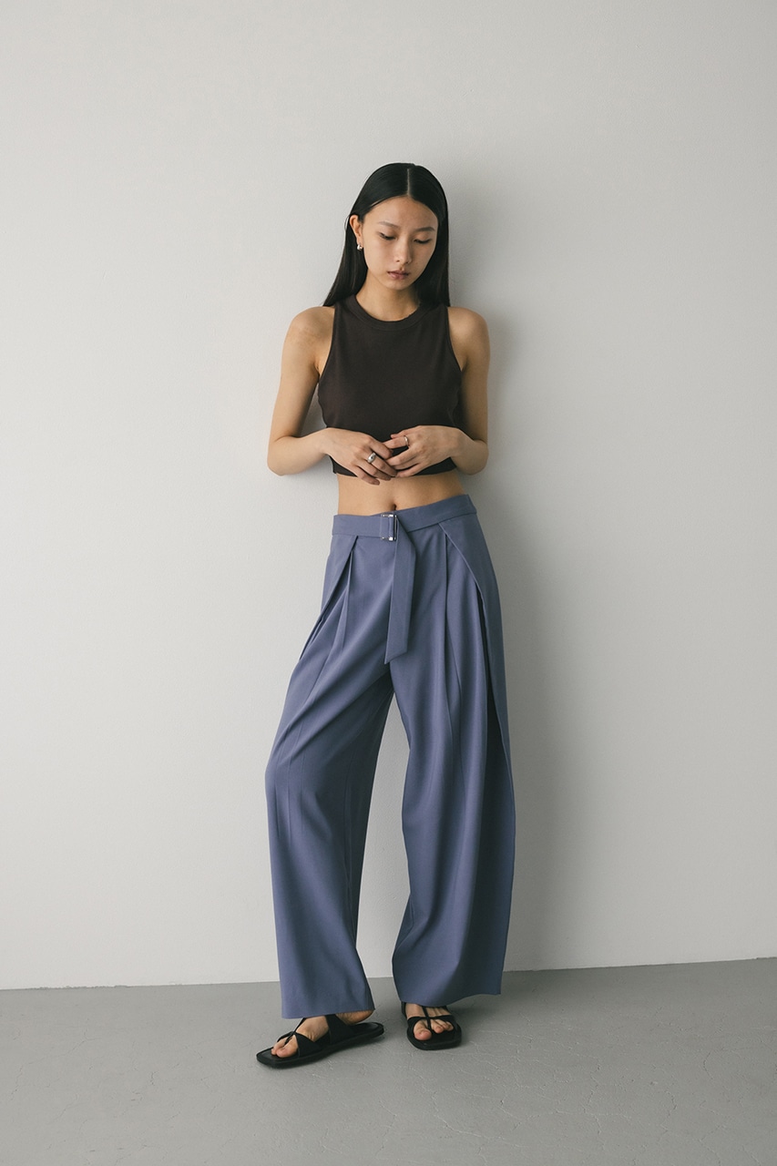両サイドがラップデザインになっているシルエットがポイントのパンツ。フロントのバックルデザインで、トップスをインした時もスタイリングのアクセントになる一枚です。ストンと落ちるボトムスラインとワイドシルエットが脚のラインを拾わずスタイルアップ見せしてくれます。ローウエスト設定で腰回りをすっきりとした印象に導きます。ストレッチあり、透け感なし。