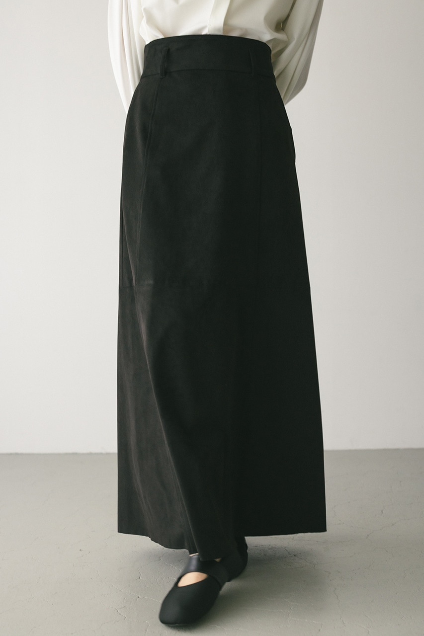 ストレッチの効いたやわらかいフェイクスウェードを使用したフレアスカート。縦と横に入ったパネルがアクセントになる一枚。やや太めのウエストベルトでウエストをしっかりとマークし、スタイルアップに導きます。深めに入ったスリットで足さばきもしやすいです。ウエストバックゴム仕様。透け感なし、ストレッチあり。