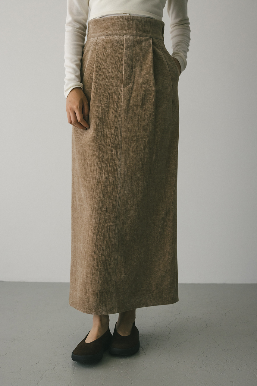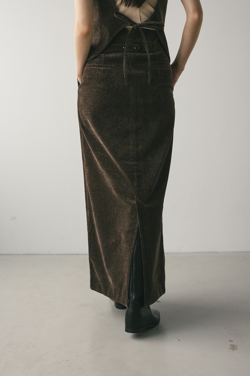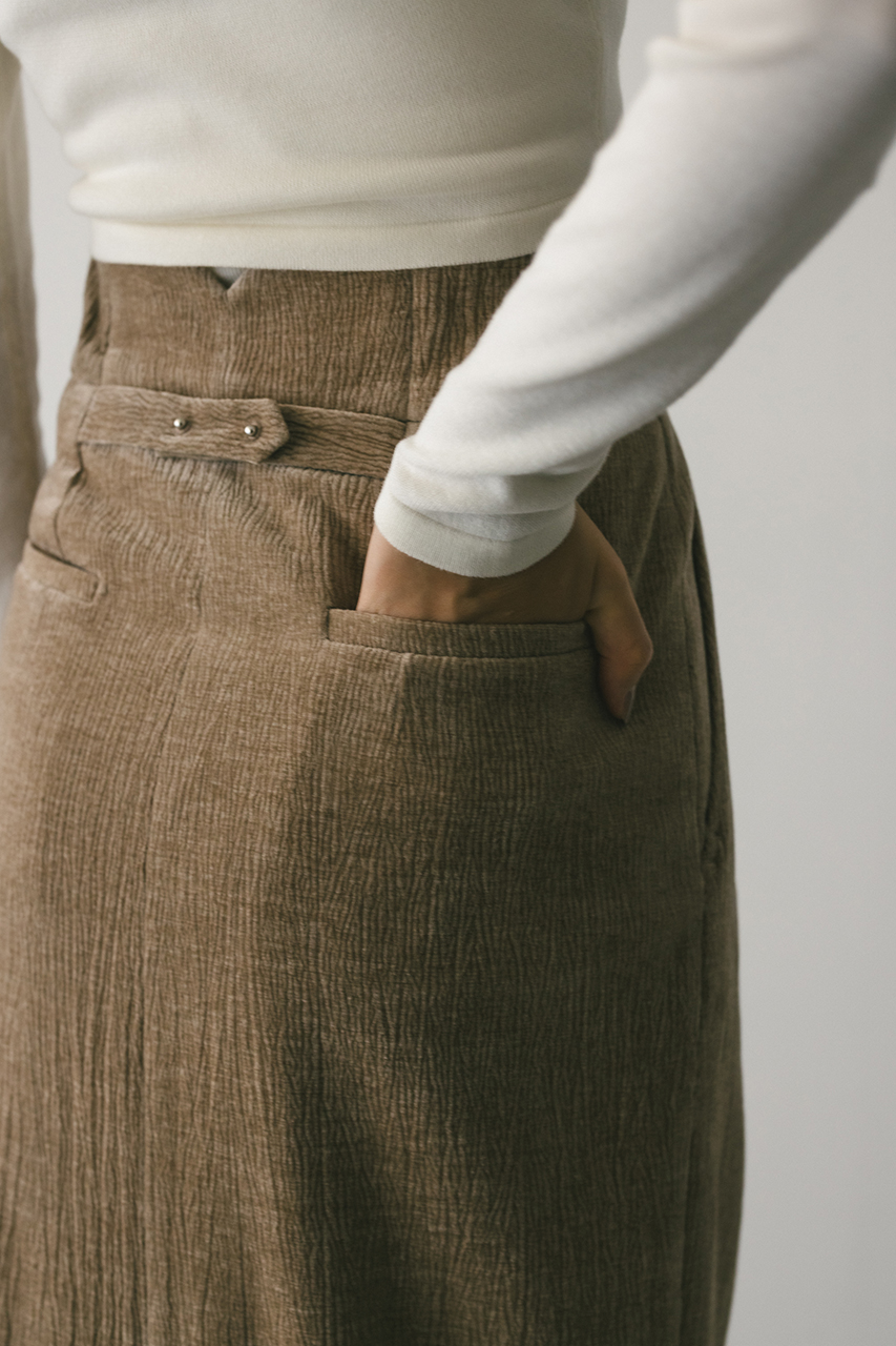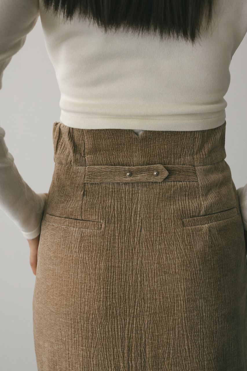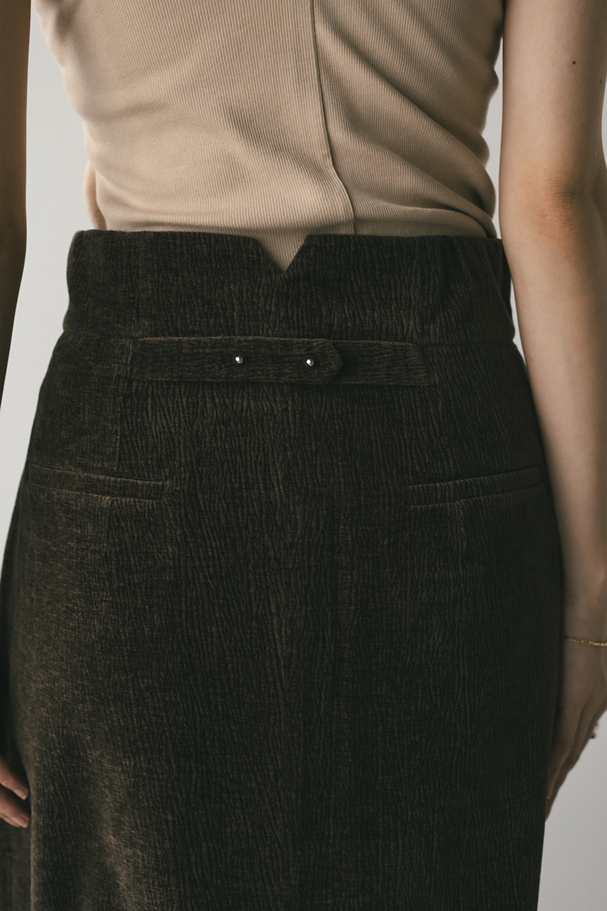 凹凸感のあるめずらしいベロア生地を使用したスカート。しっかりとマークしてくれるワイドベルトで、ウエストにメリハリができてスタイルアップが叶います。フロントに入ったタックでヒップ周りもすっきりと見せてくます。バックスリット入り。ストレッチあり、透け感なし。500IAT30-0721(バックオープンベロアベスト)とセットアップ着用可能。