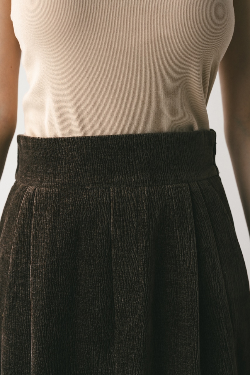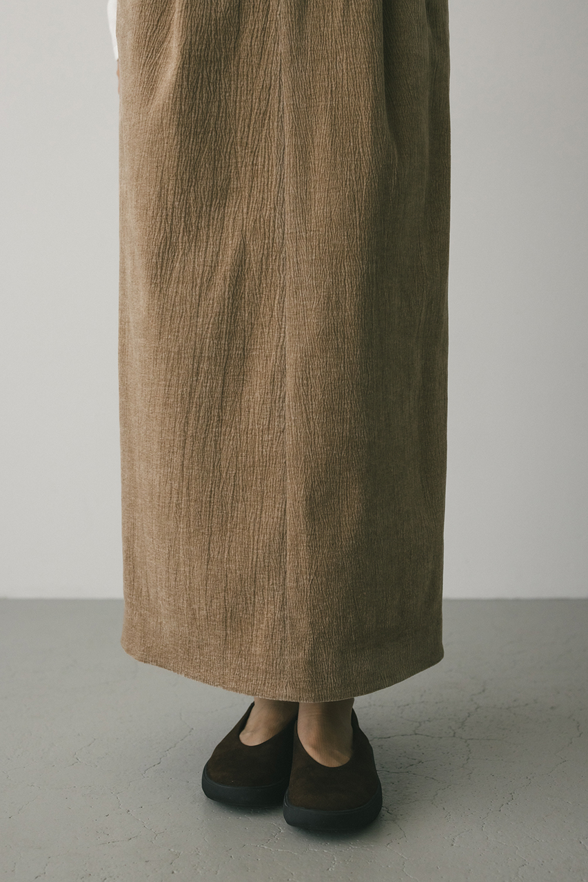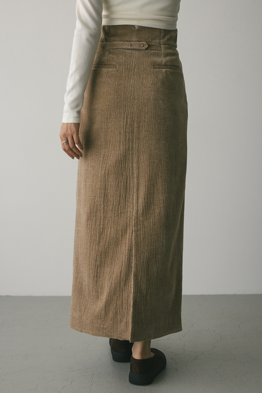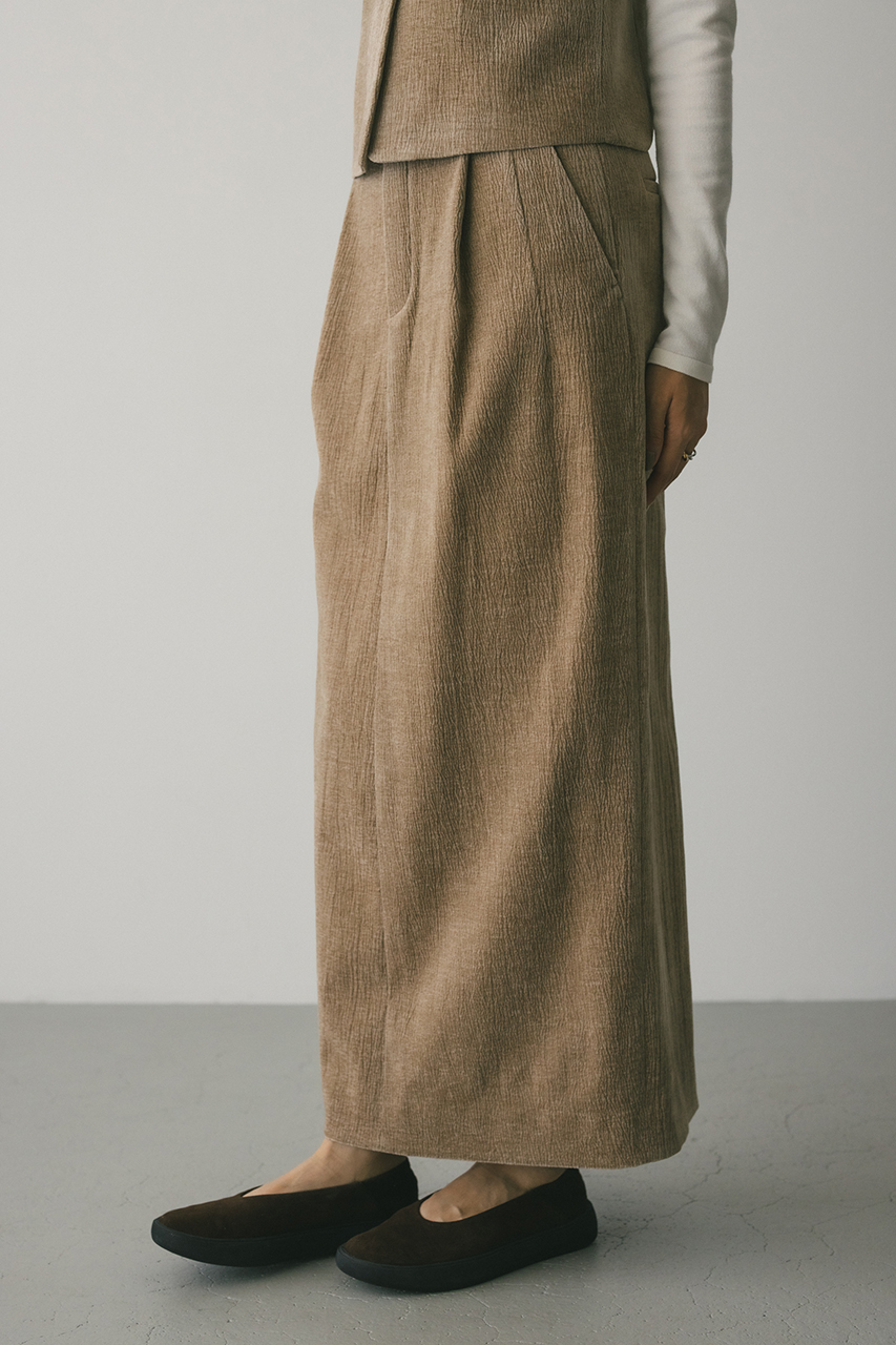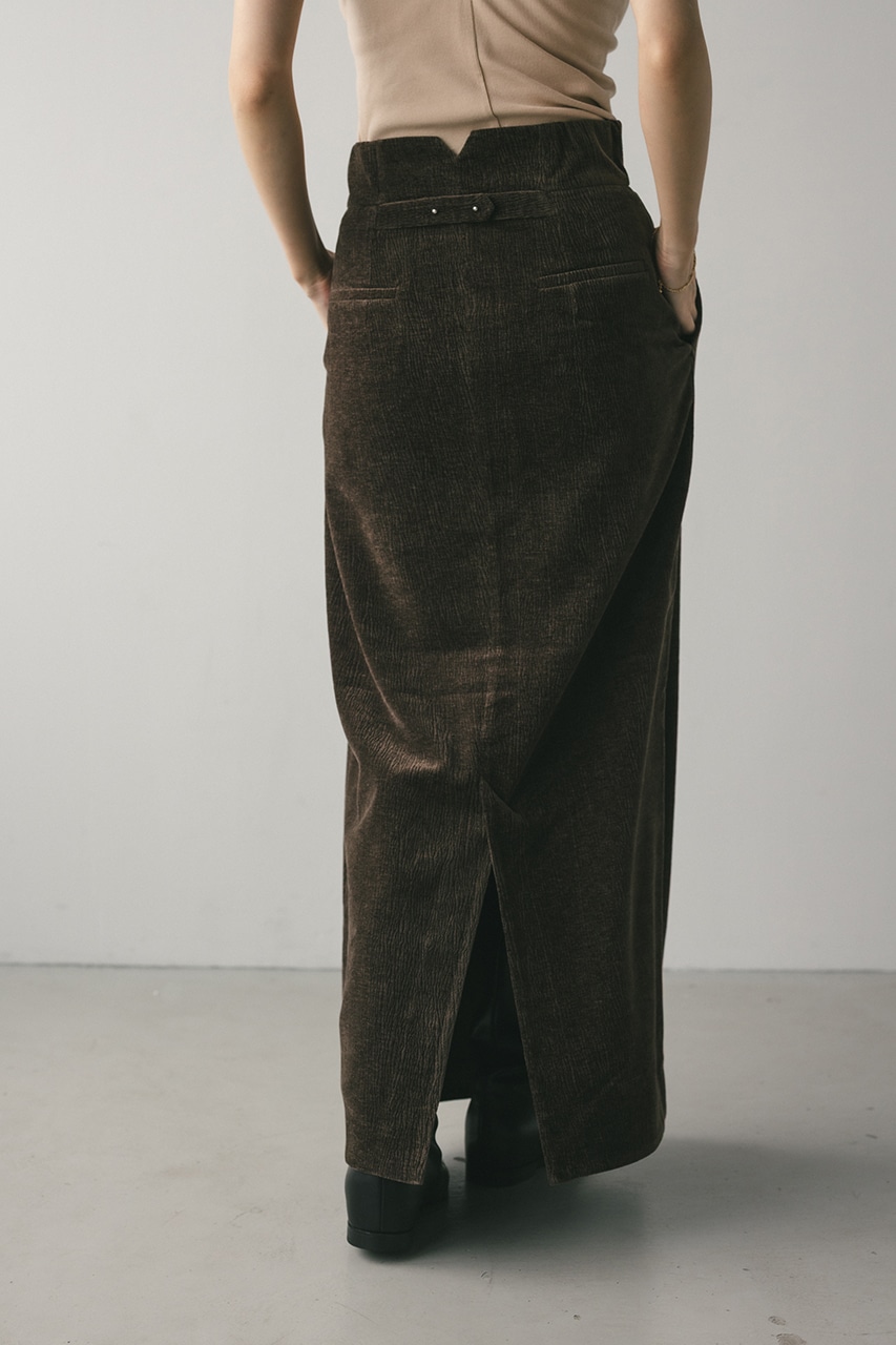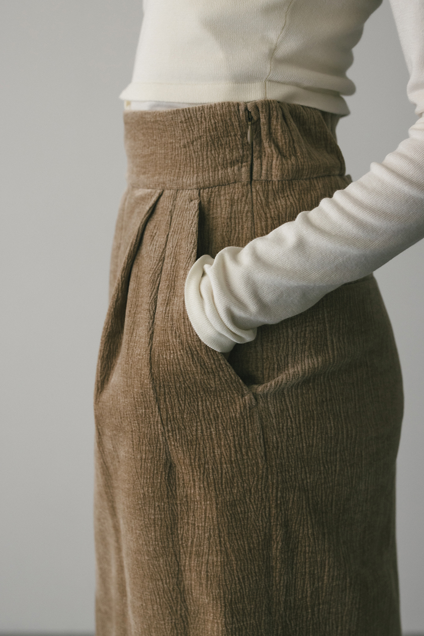 凹凸感のあるめずらしいベロア生地を使用したスカート。しっかりとマークしてくれるワイドベルトで、ウエストにメリハリができてスタイルアップが叶います。フロントに入ったタックでヒップ周りもすっきりと見せてくます。バックスリット入り。ストレッチあり、透け感なし。500IAT30-0721(バックオープンベロアベスト)とセットアップ着用可能。