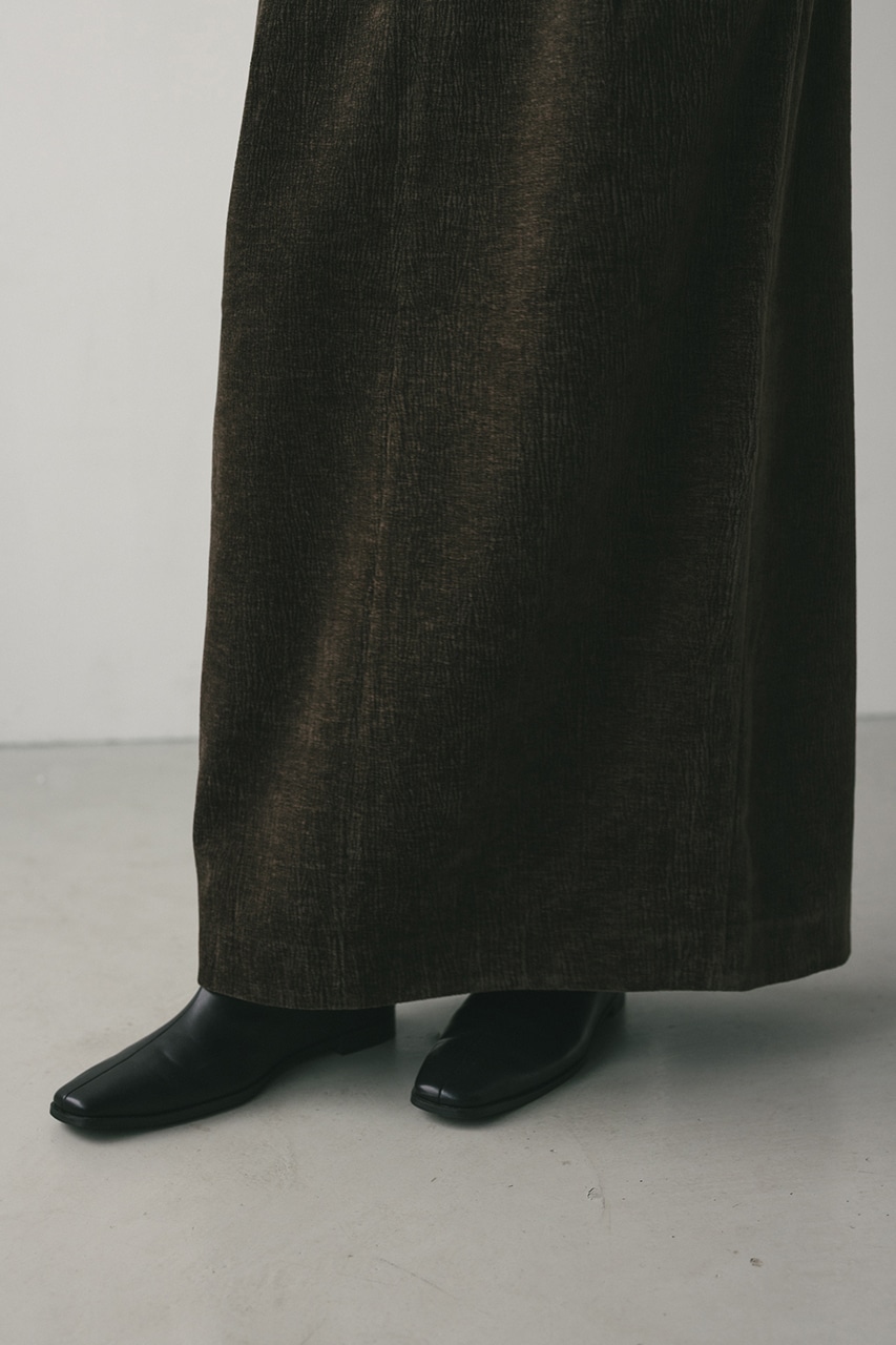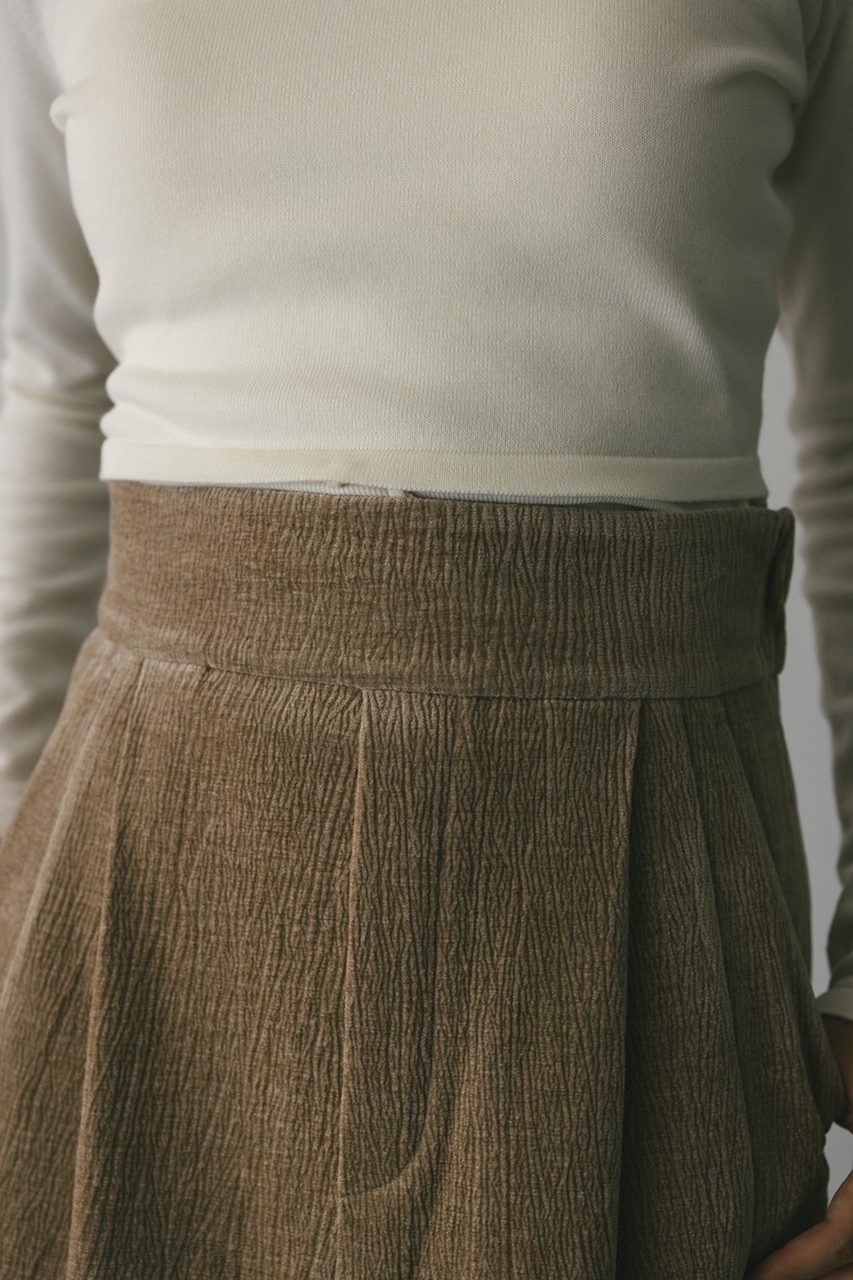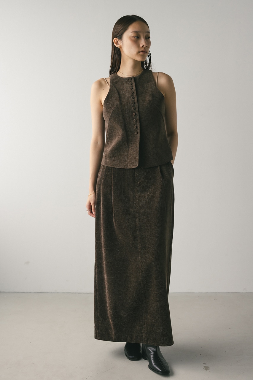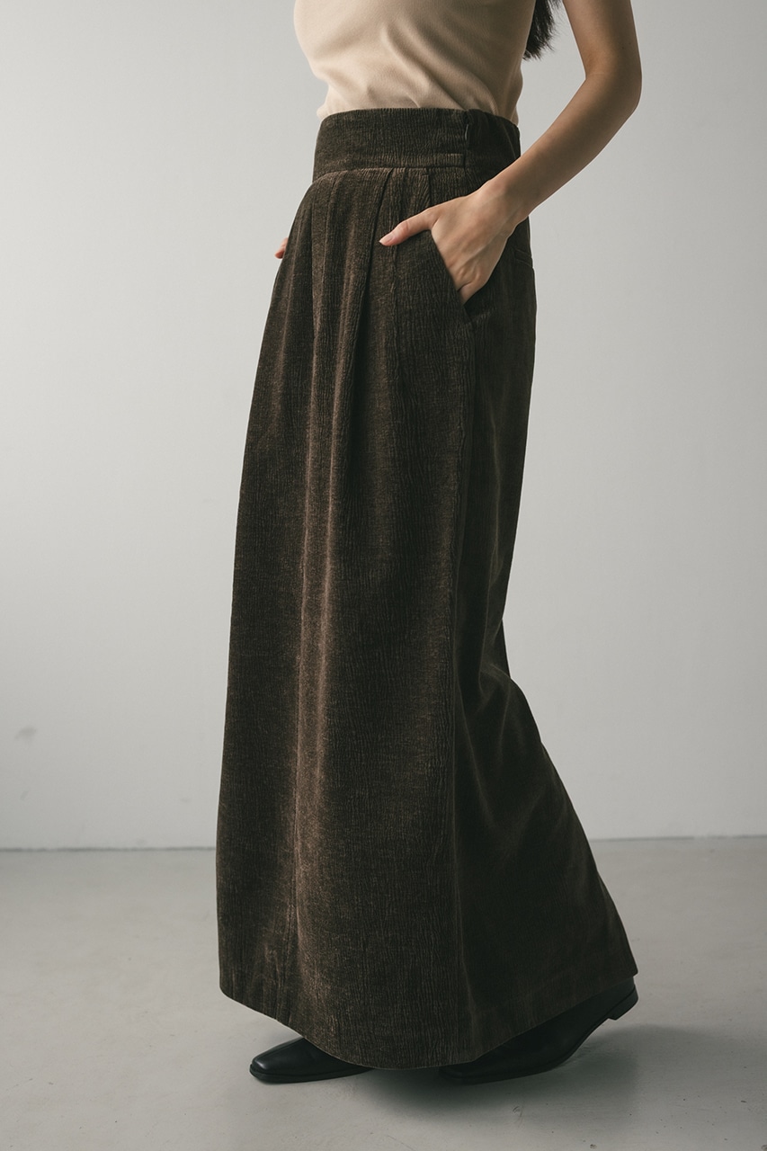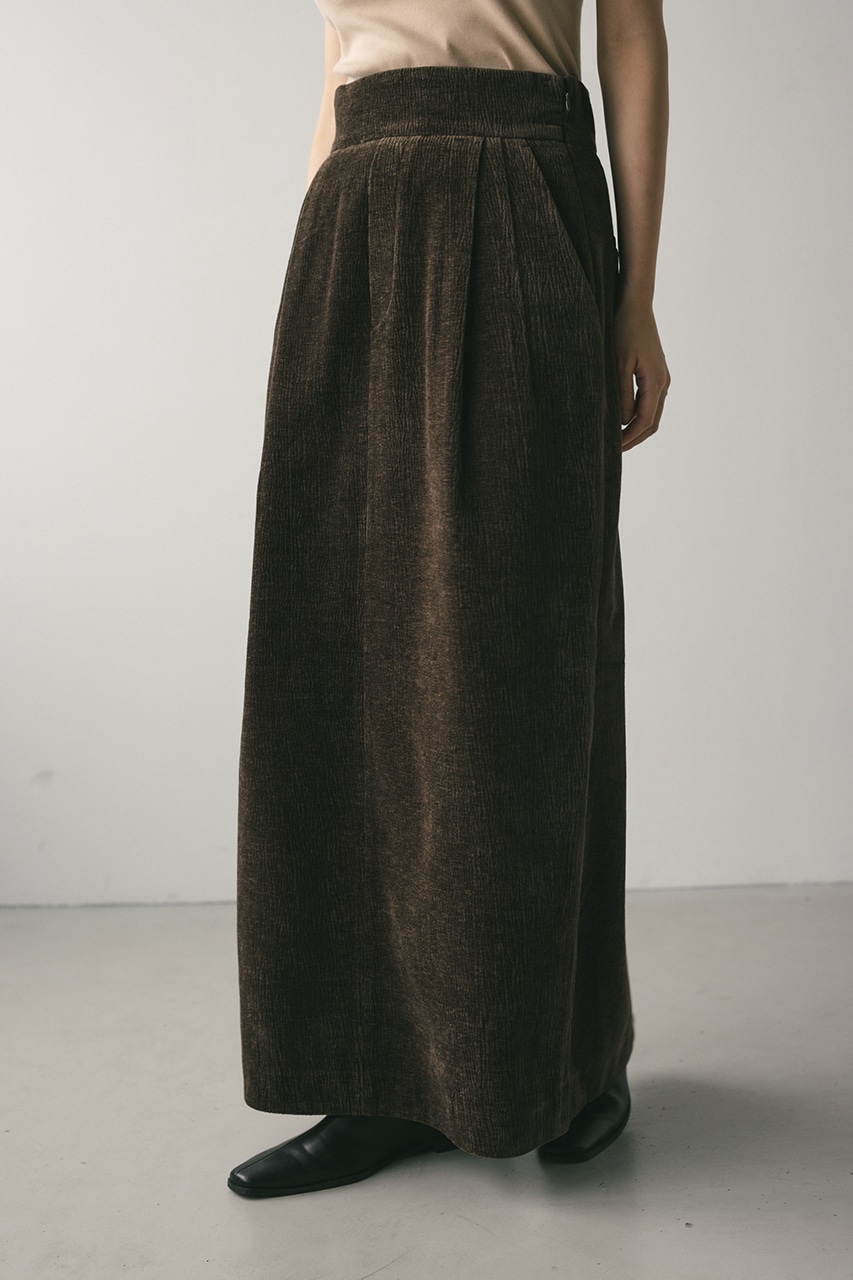 凹凸感のあるめずらしいベロア生地を使用したスカート。しっかりとマークしてくれるワイドベルトで、ウエストにメリハリができてスタイルアップが叶います。フロントに入ったタックでヒップ周りもすっきりと見せてくます。バックスリット入り。ストレッチあり、透け感なし。500IAT30-0721(バックオープンベロアベスト)とセットアップ着用可能。