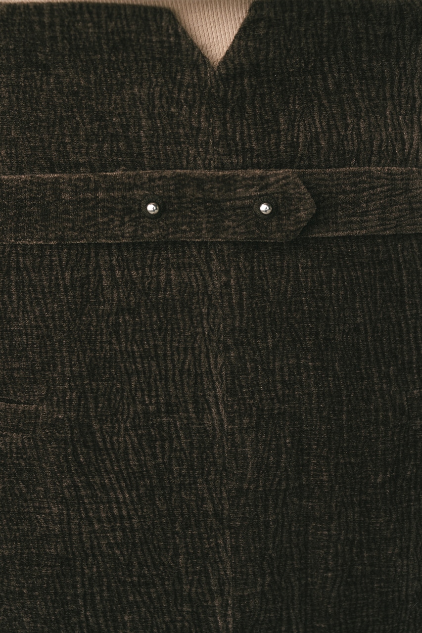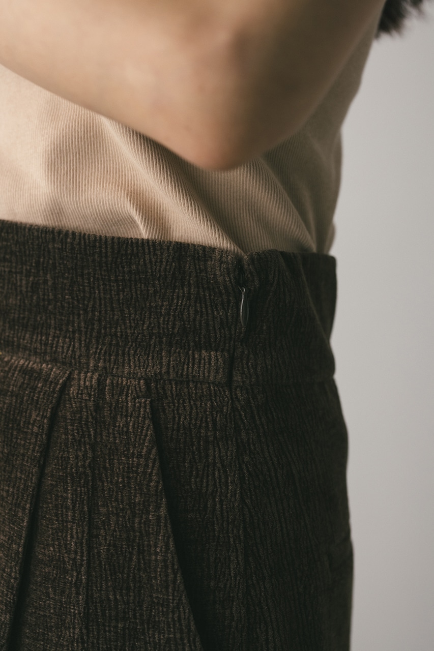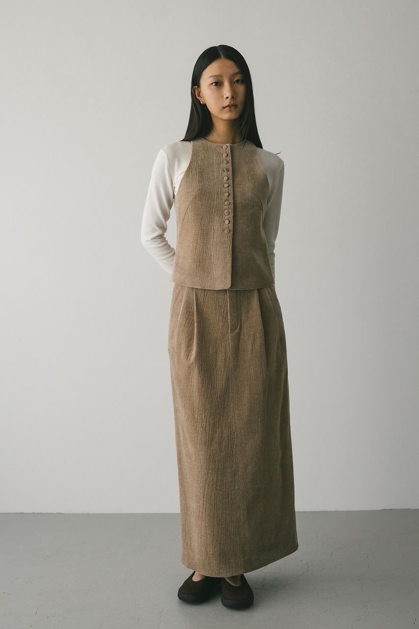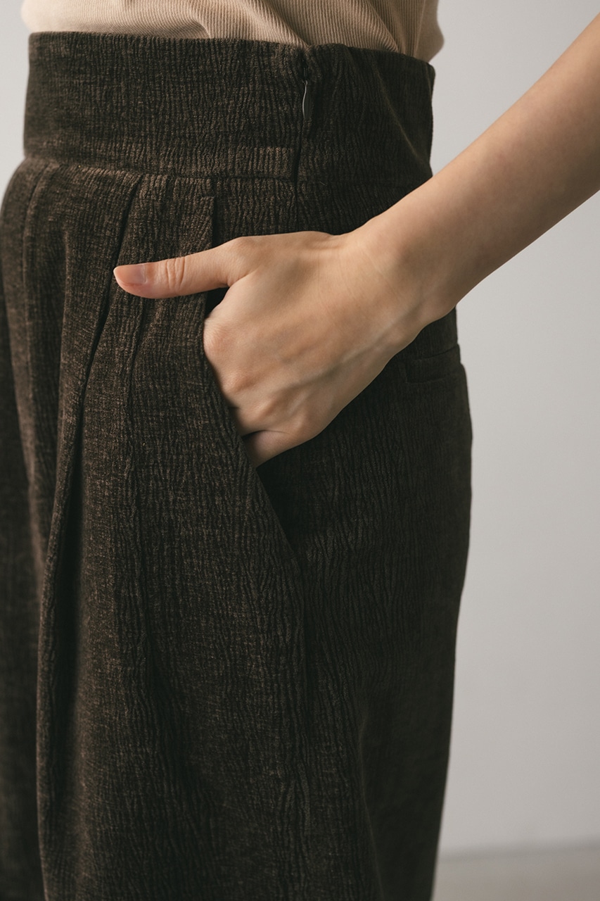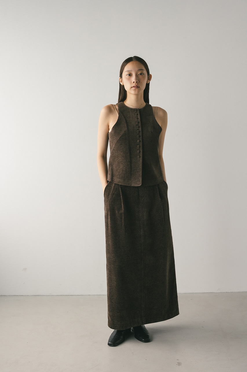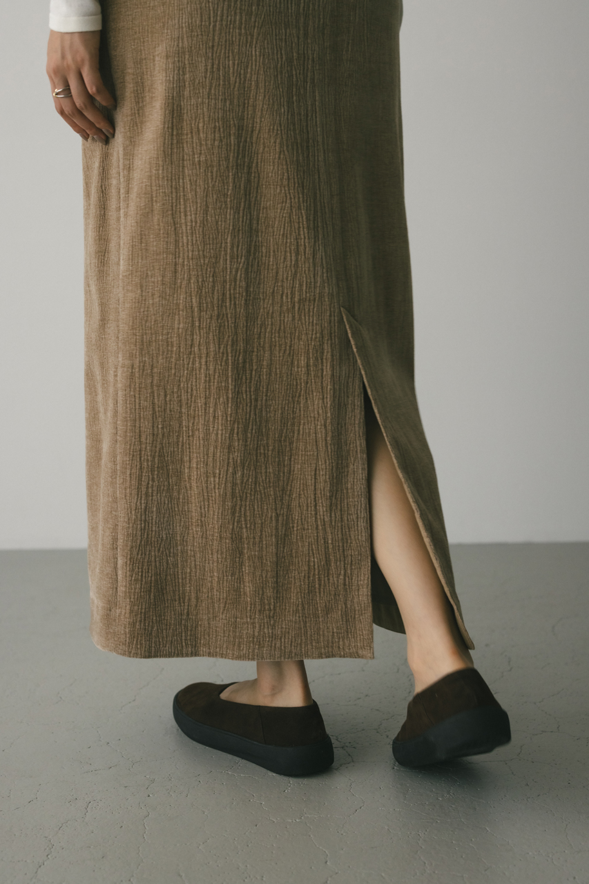 凹凸感のあるめずらしいベロア生地を使用したスカート。しっかりとマークしてくれるワイドベルトで、ウエストにメリハリができてスタイルアップが叶います。フロントに入ったタックでヒップ周りもすっきりと見せてくます。バックスリット入り。ストレッチあり、透け感なし。500IAT30-0721(バックオープンベロアベスト)とセットアップ着用可能。
