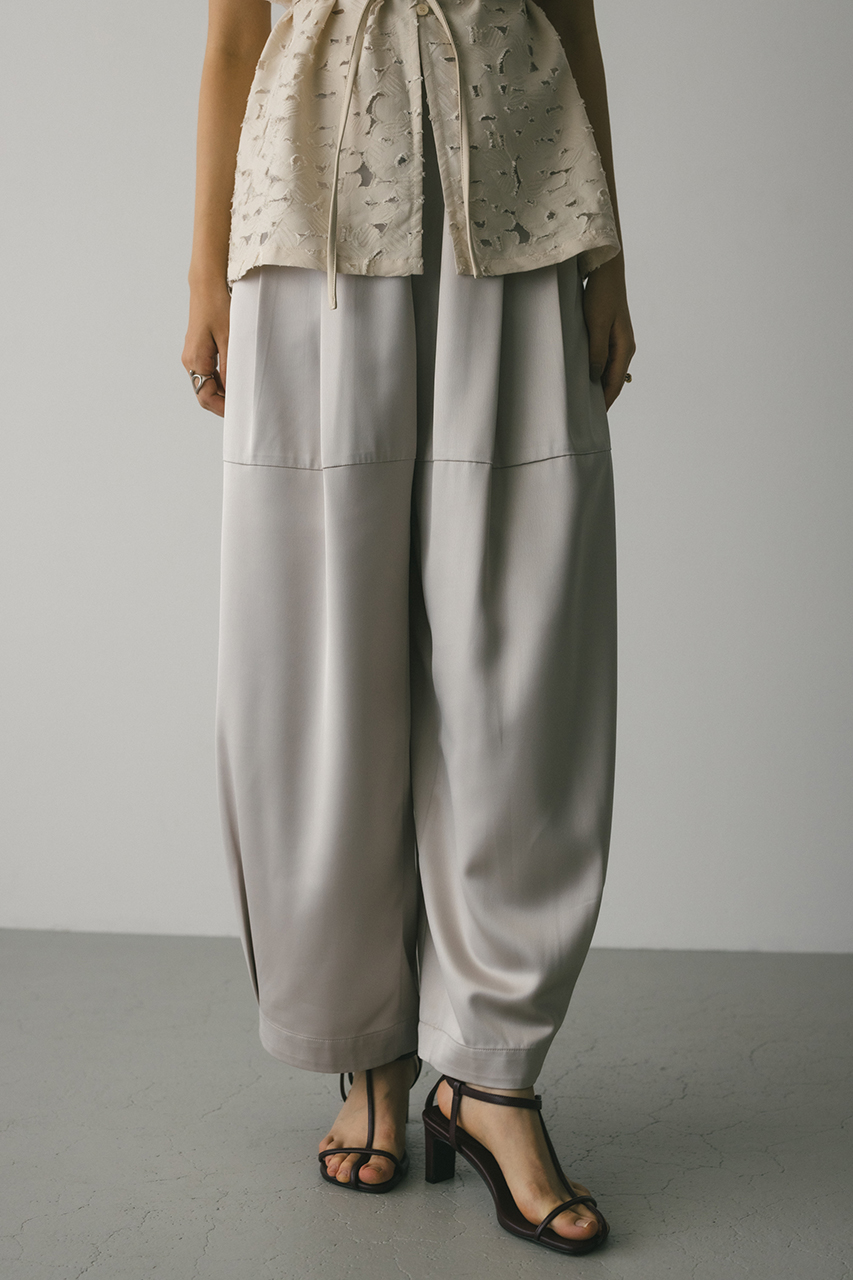 上品でモードな鈍い光沢感のあるサテン生地を使用したパンツ。フロントに大きく入ったダブルタックデザインとウエストゴムでリラックスして着用していただけます。美脚見せするためにパンツ部分には横パネルを入れ、ヘム部分には長めのダーツとタックを施した一枚。サイドパネルをあえて入れてないので、独特なコクーンシルエットに導きます。ウエストゴム仕様、内側紐付き。透け感なし、ストレッチなし。