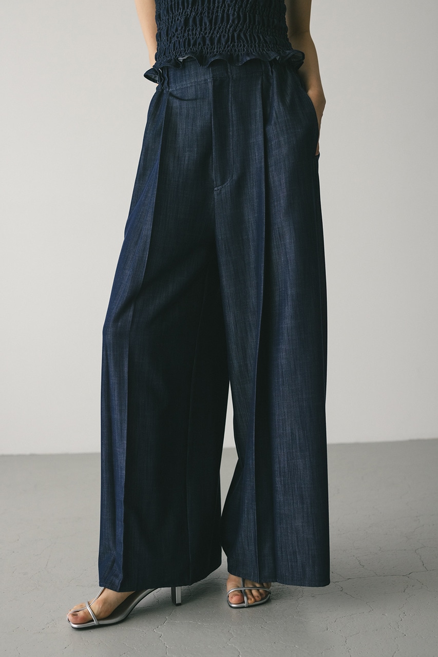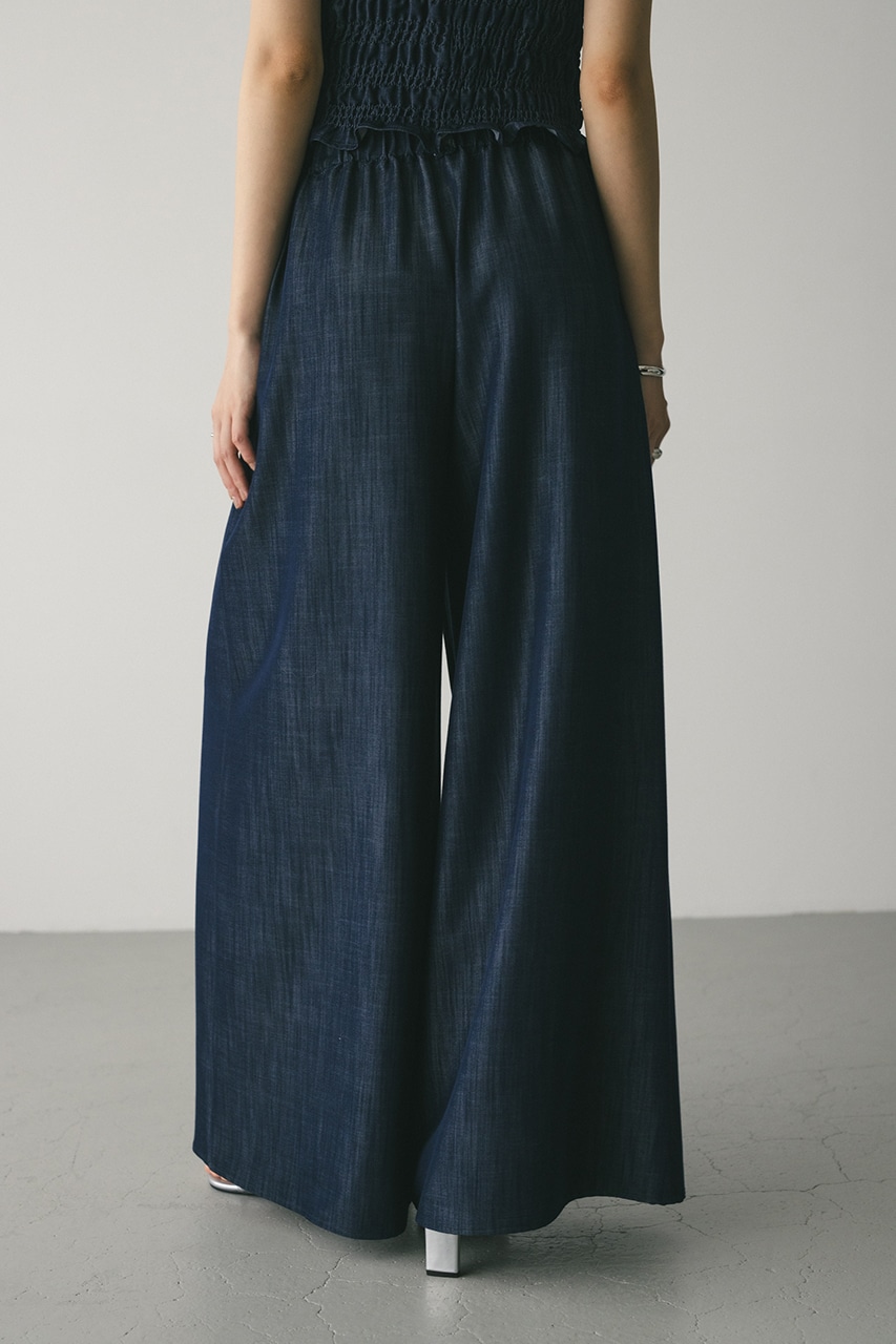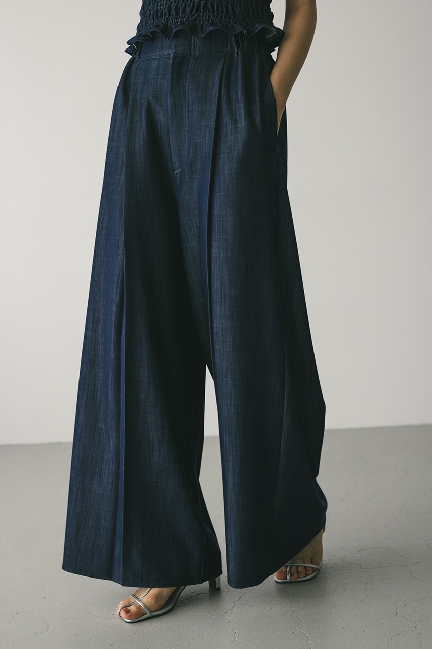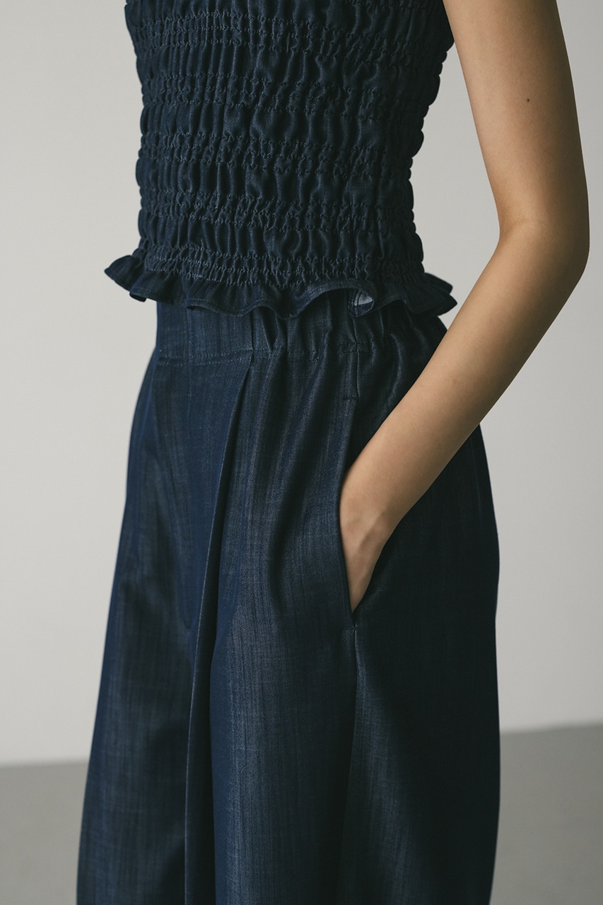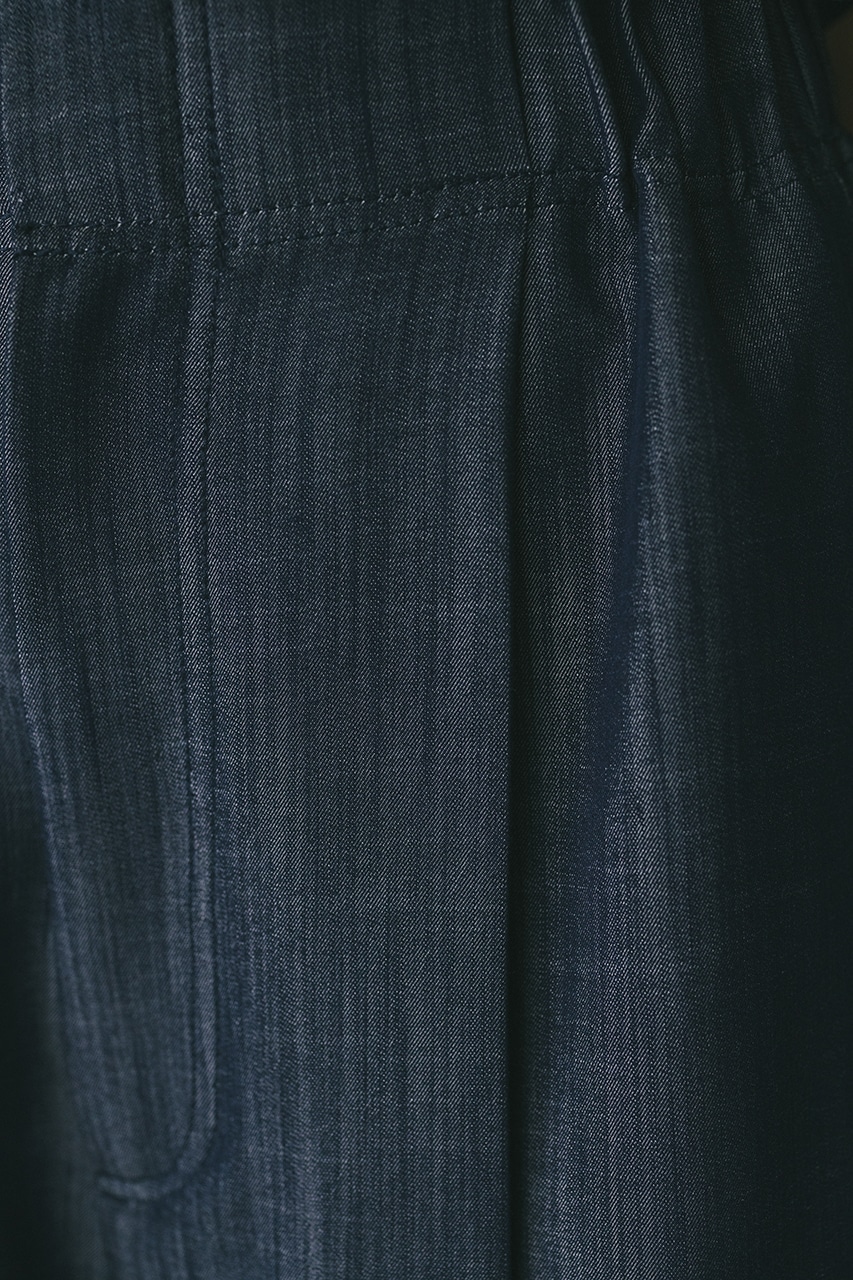 柔らかな肌触りやシルクのような光沢感、吸湿性や速乾性に優れているテンセル混デニム生地を使用したワイドパンツ。軽くさらりとした履き心地がポイント。カジュアル過ぎない大人なデニムです。500IAT30-1281(シャーリングトップ)とセットアップ着用可能。ストレッチあり、透け感なし。