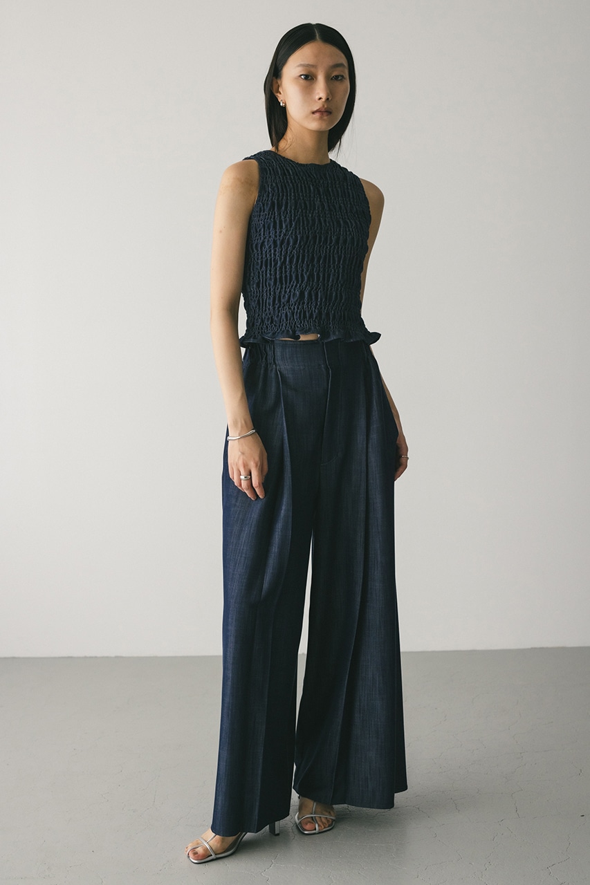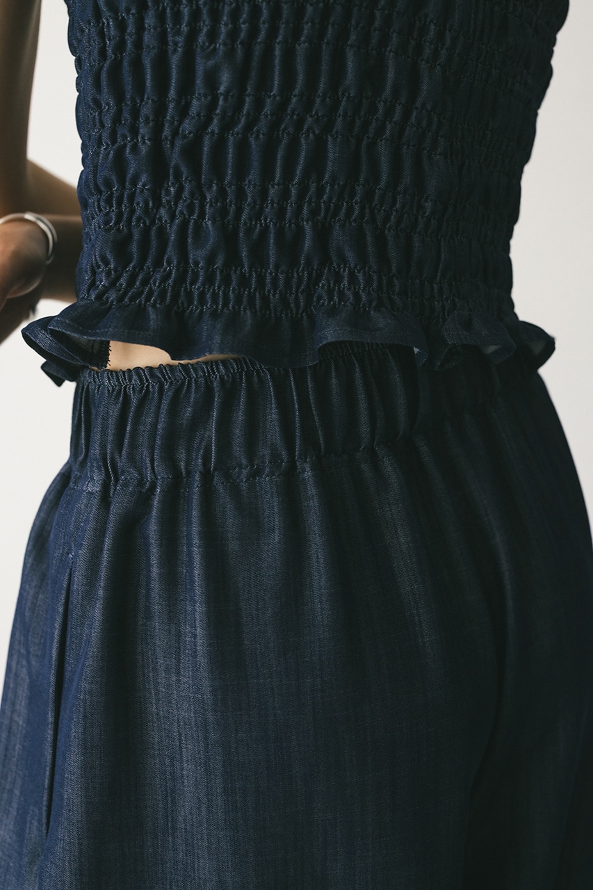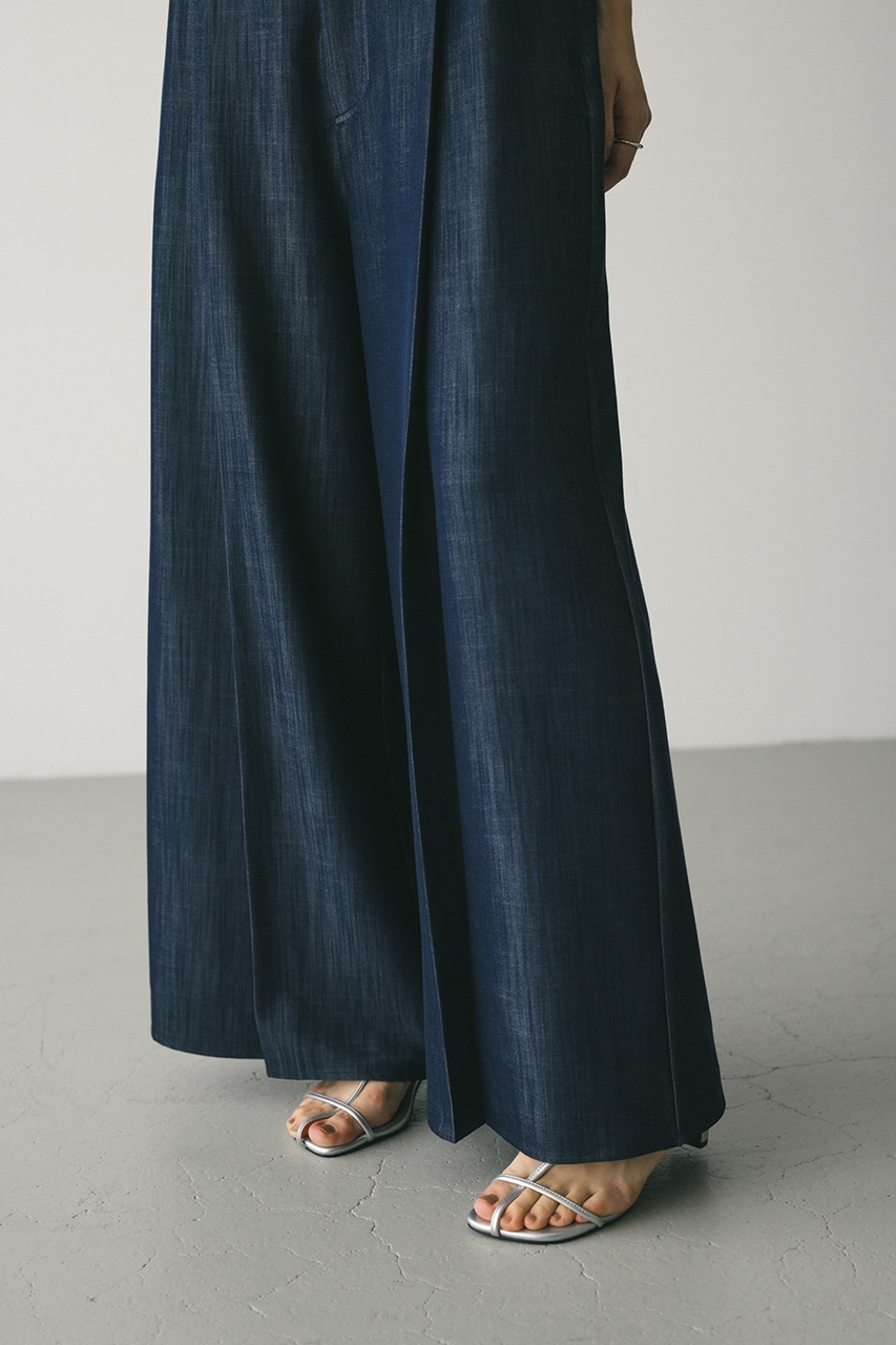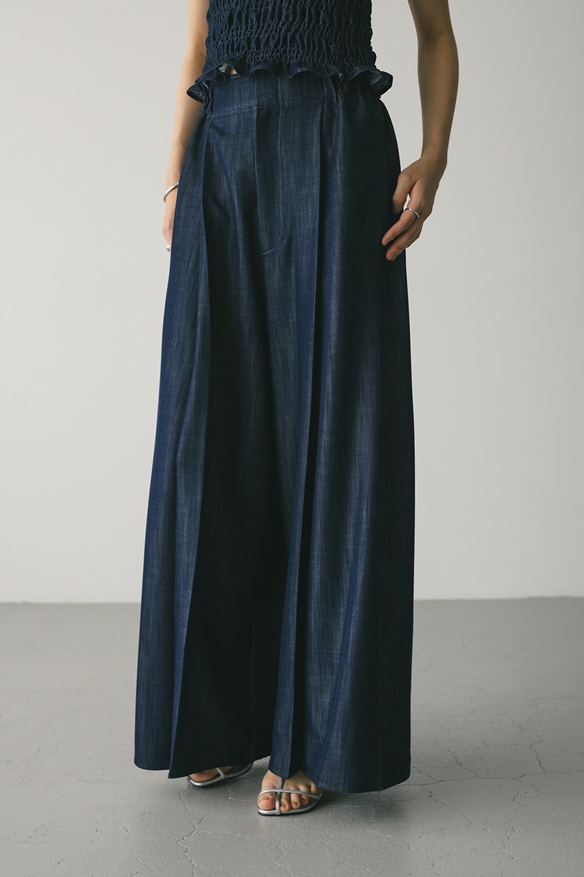 柔らかな肌触りやシルクのような光沢感、吸湿性や速乾性に優れているテンセル混デニム生地を使用したワイドパンツ。軽くさらりとした履き心地がポイント。カジュアル過ぎない大人なデニムです。500IAT30-1281(シャーリングトップ)とセットアップ着用可能。ストレッチあり、透け感なし。