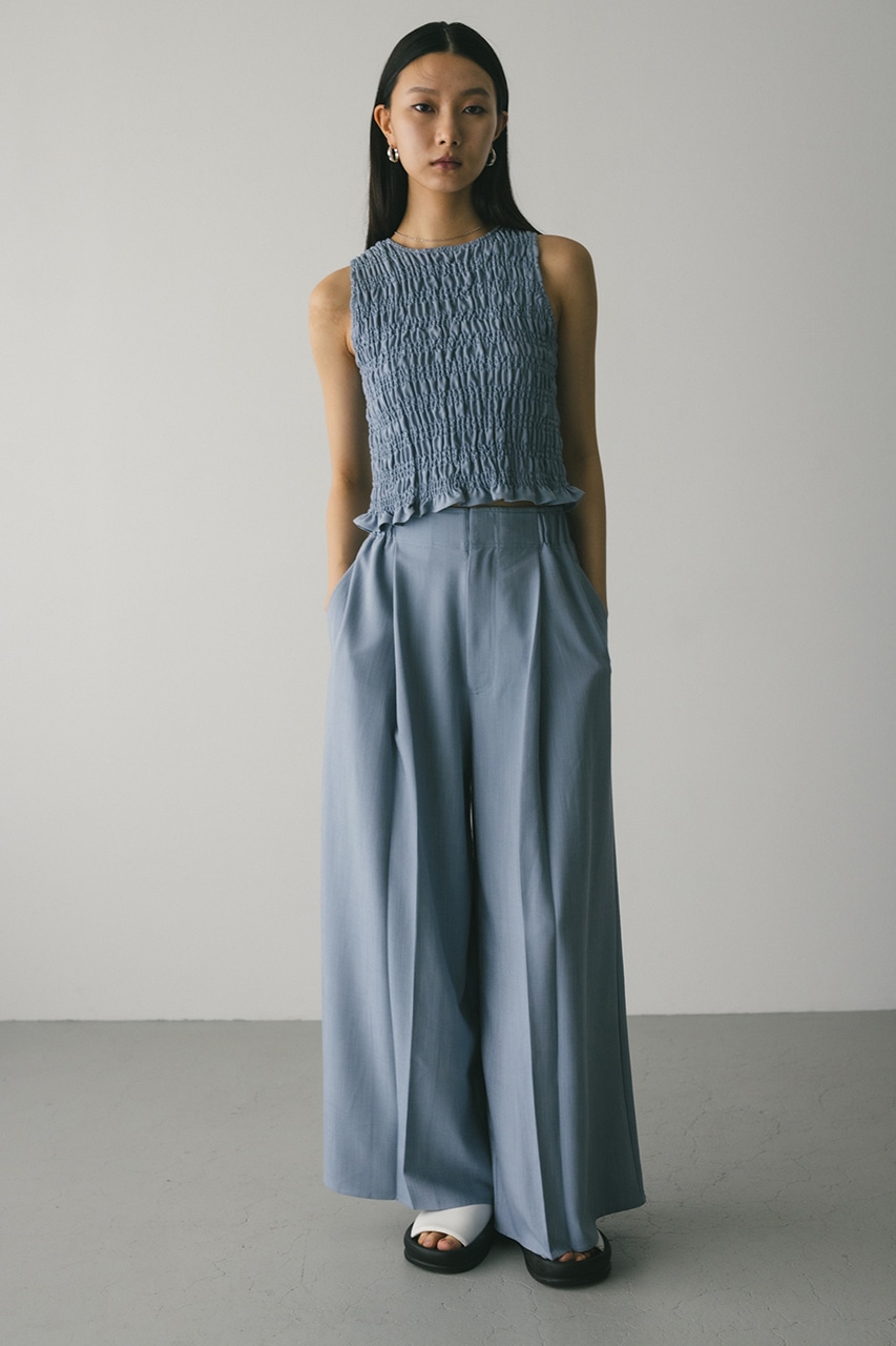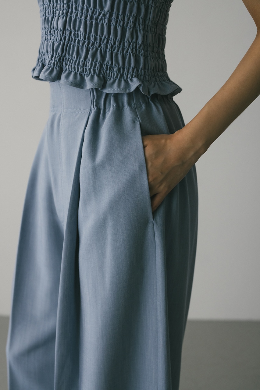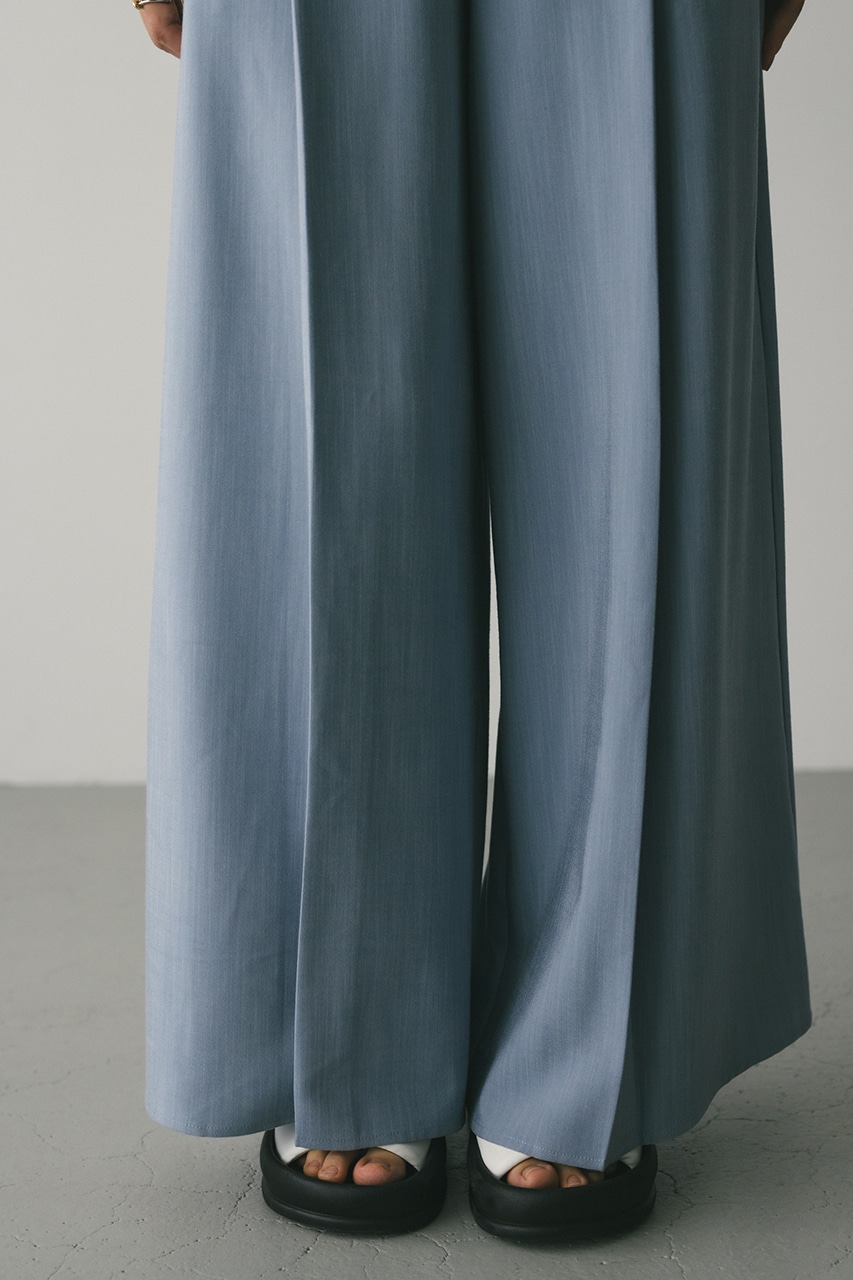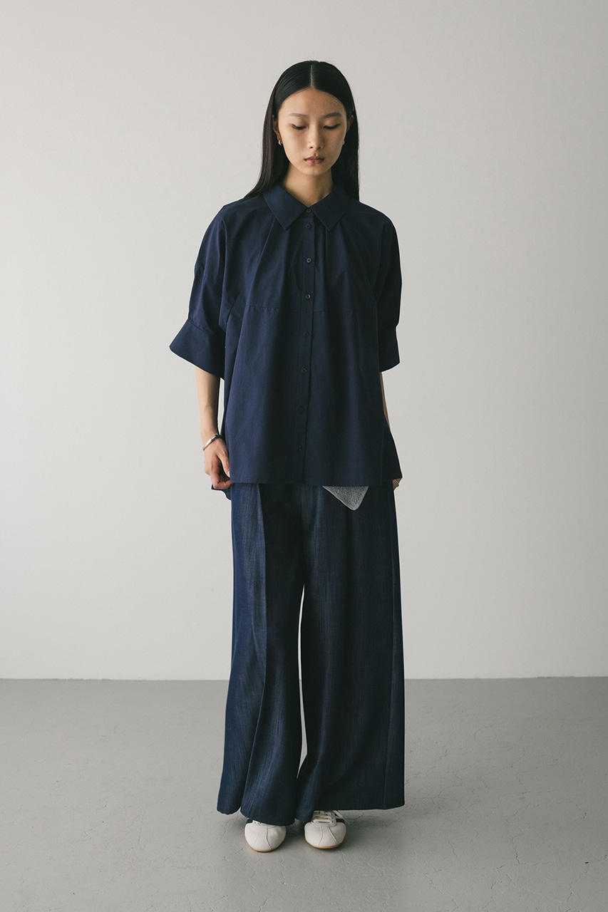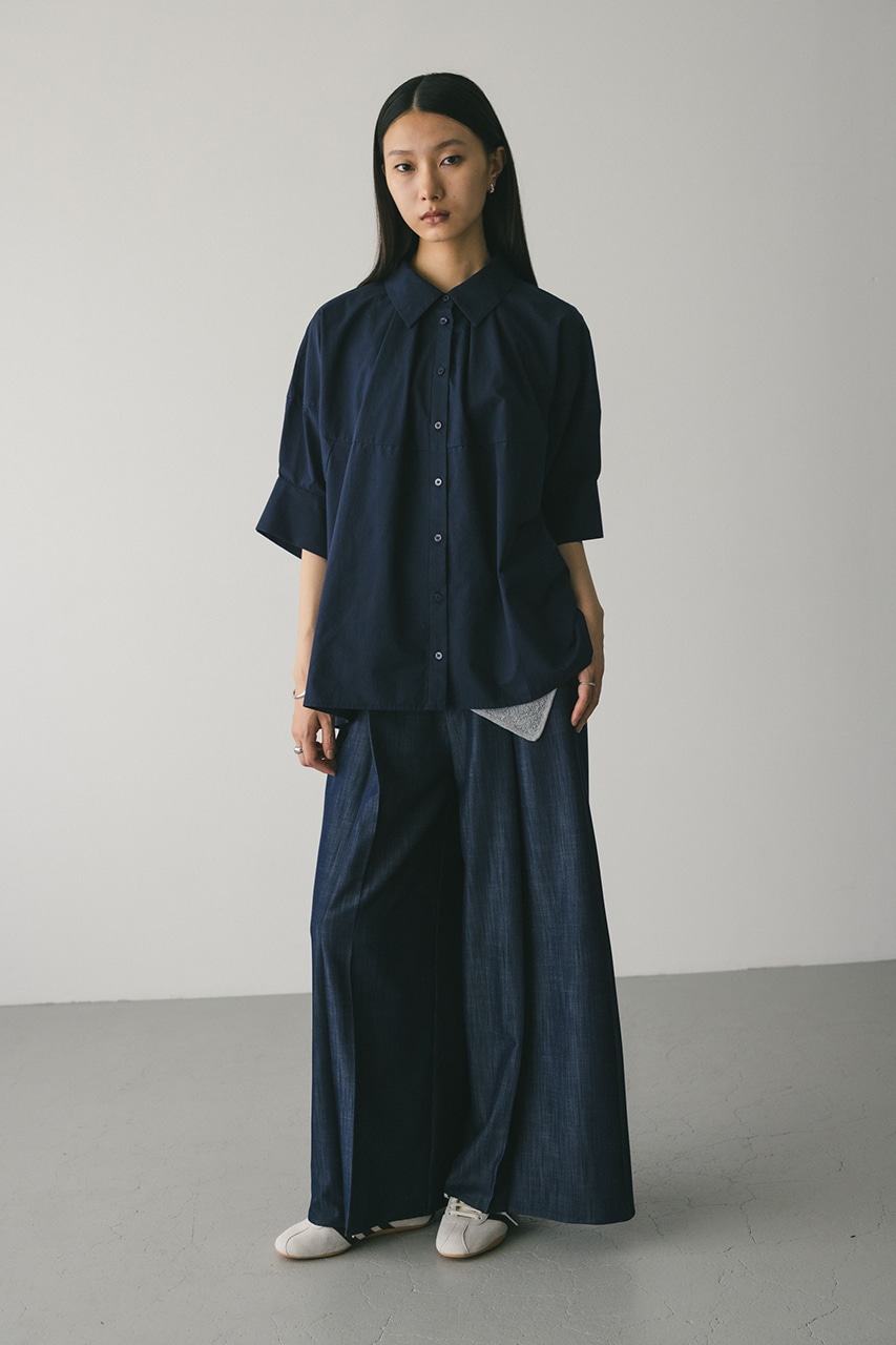 柔らかな肌触りやシルクのような光沢感、吸湿性や速乾性に優れているテンセル混デニム生地を使用したワイドパンツ。軽くさらりとした履き心地がポイント。カジュアル過ぎない大人なデニムです。500IAT30-1281(シャーリングトップ)とセットアップ着用可能。ストレッチあり、透け感なし。