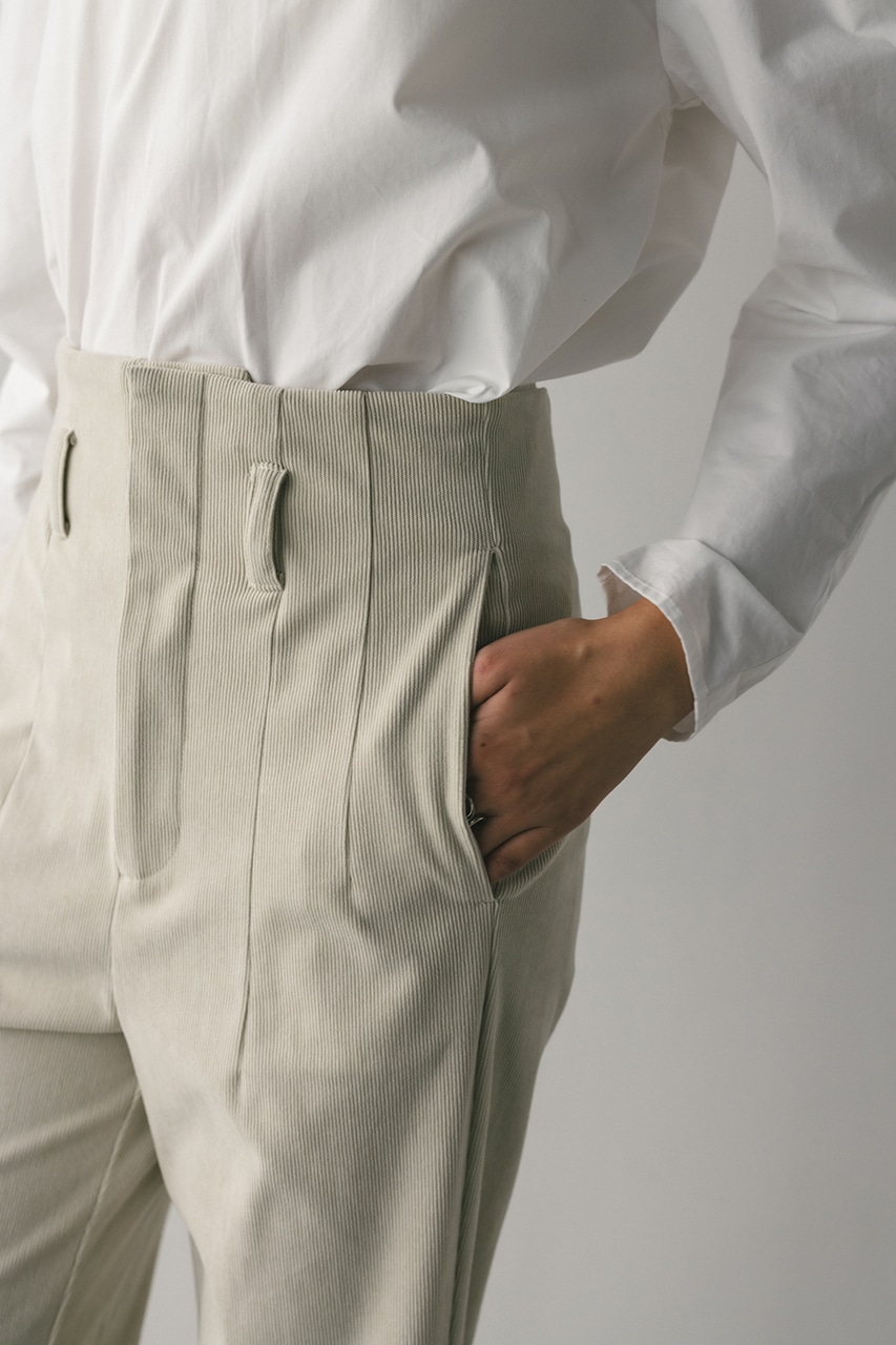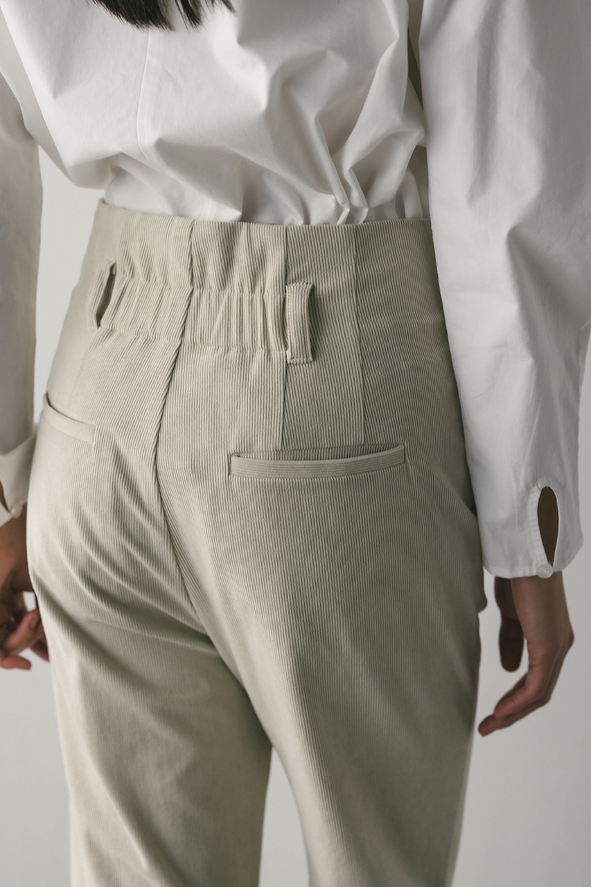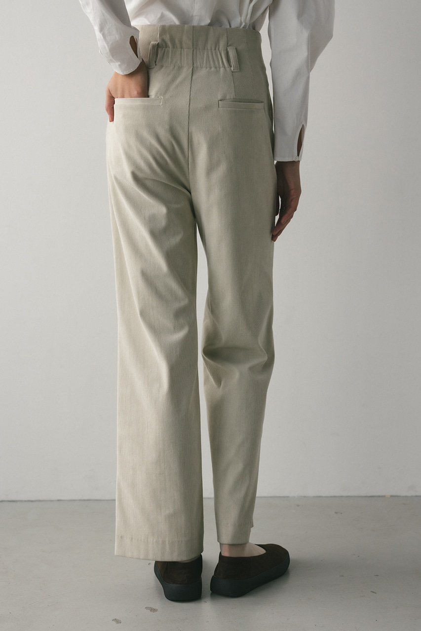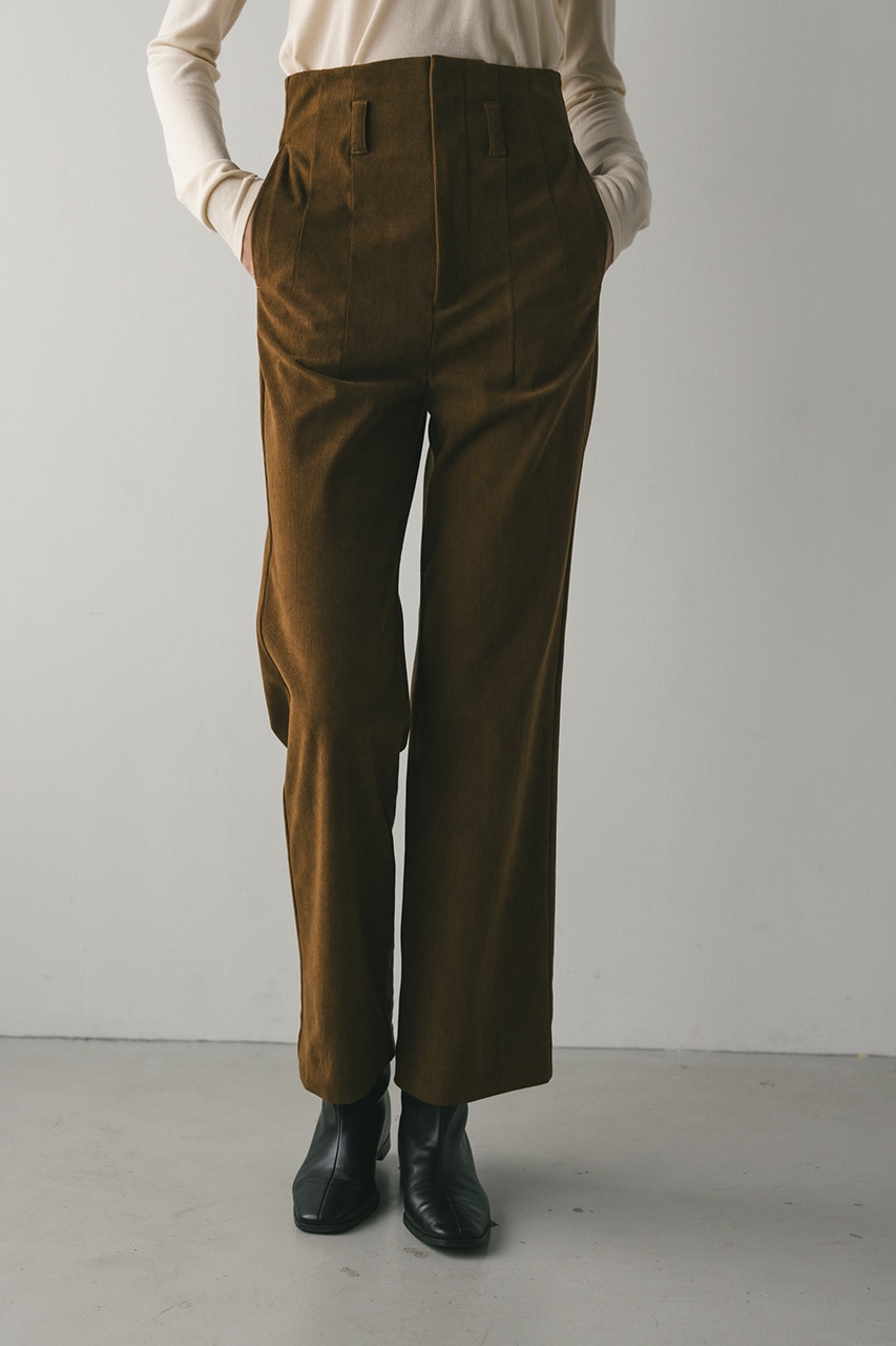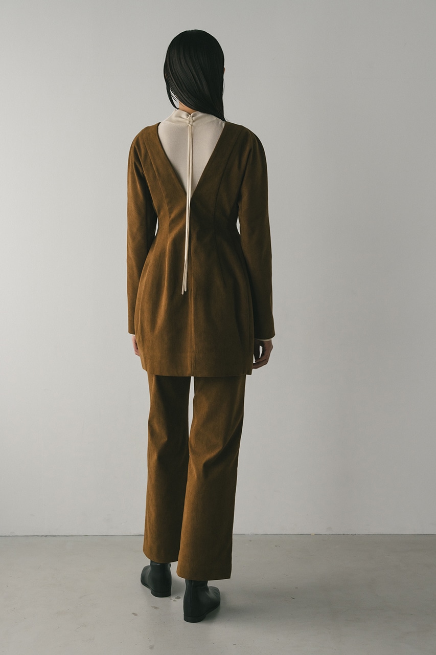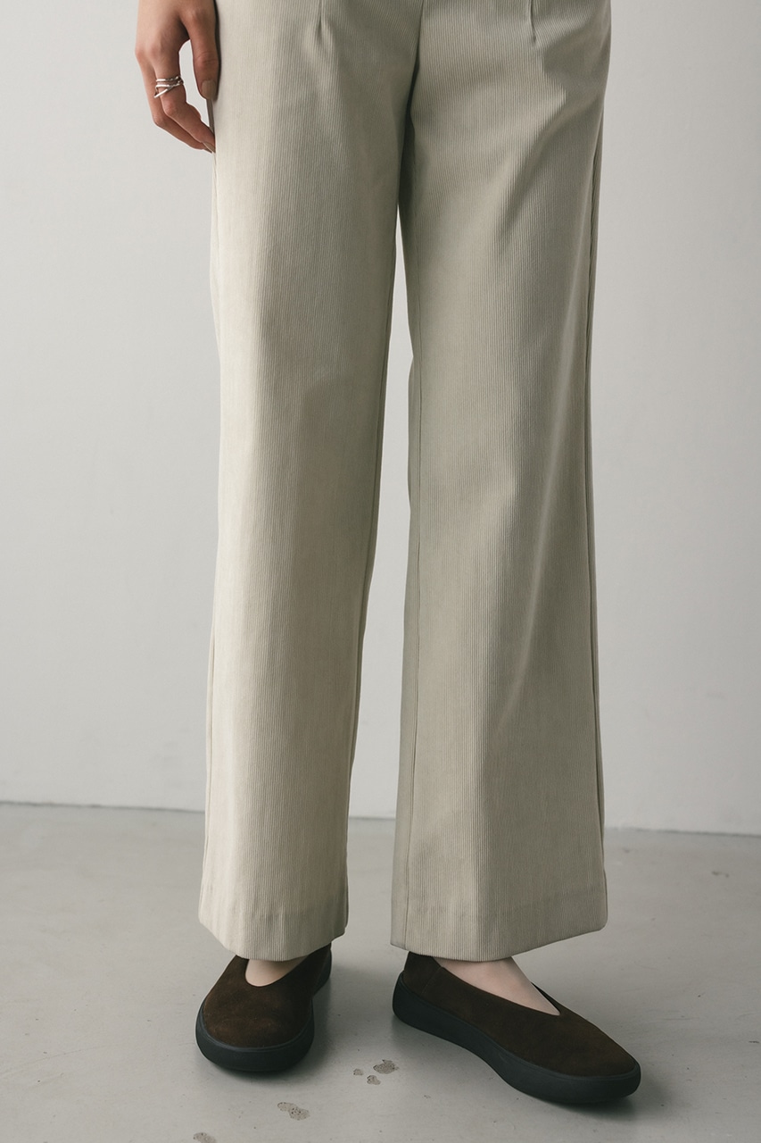 やわらかい肌触り、独特の光沢感と畝のある見た目がモードなコーデュロイパンツ。膝位置を上から設定し、広がりすぎないセミフレアーシルエットに仕上げました。コーデュロイの素材感が魅力の一枚なのでトップスはシンプルなカットソーやリブニットなどと合わせるだけでコーディネートが決まる一枚です。500IAT33-2411(コーデュロイフォルムミニワンピース)とセットアップ着用可能。ストレッチあり、透け感なし。