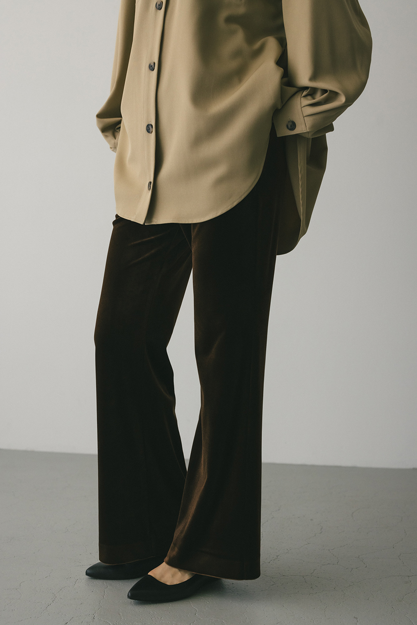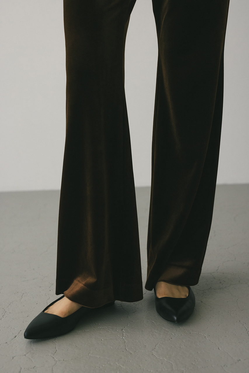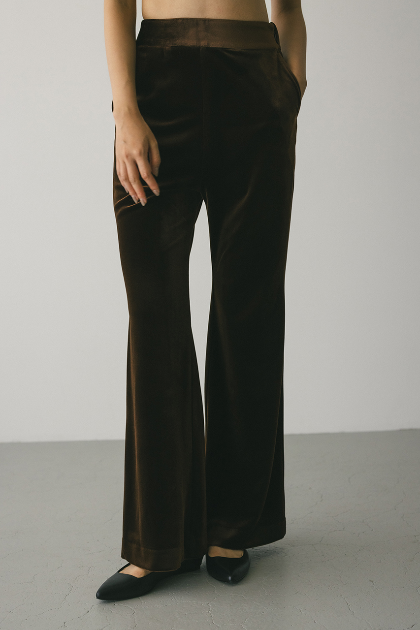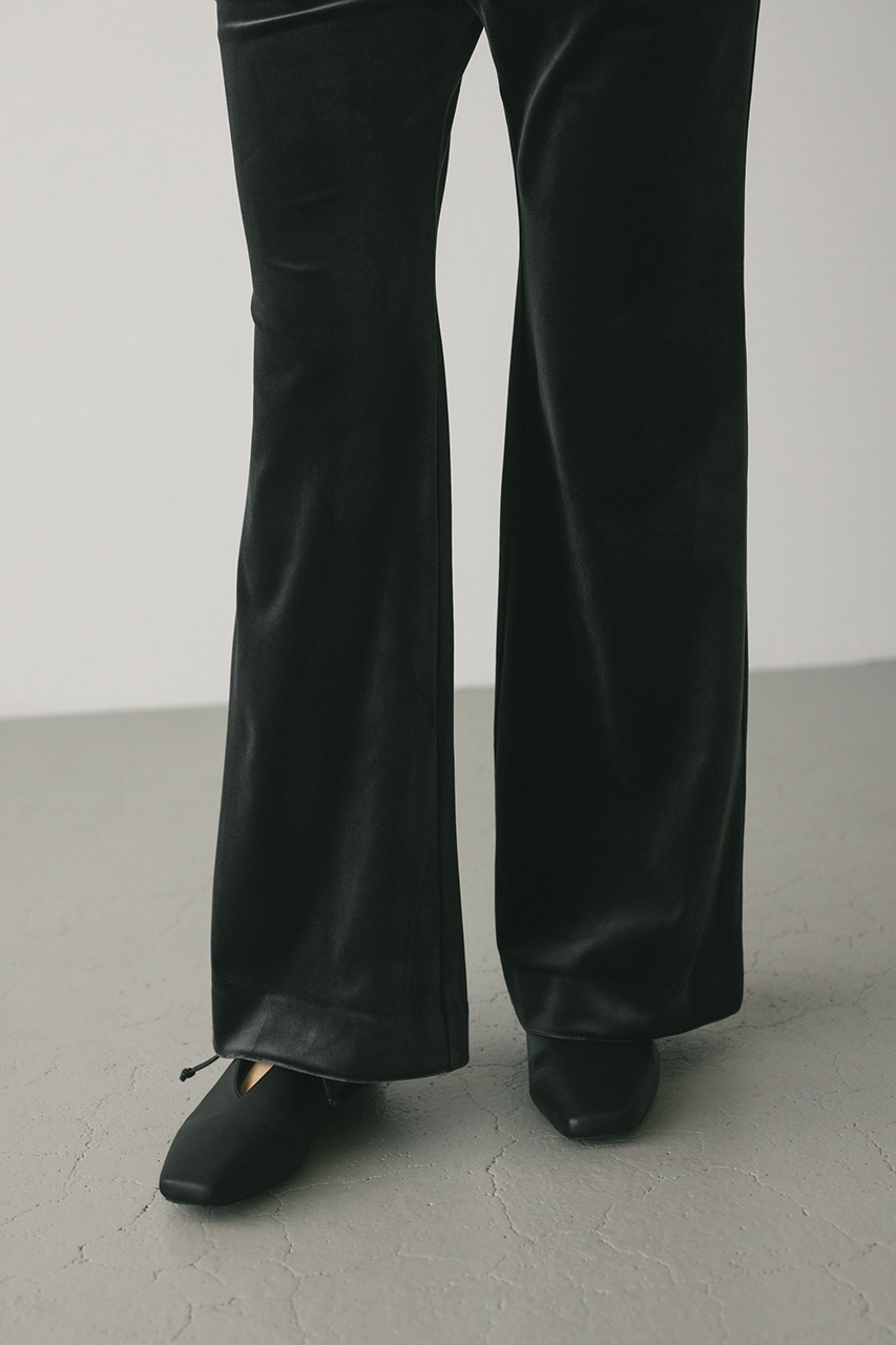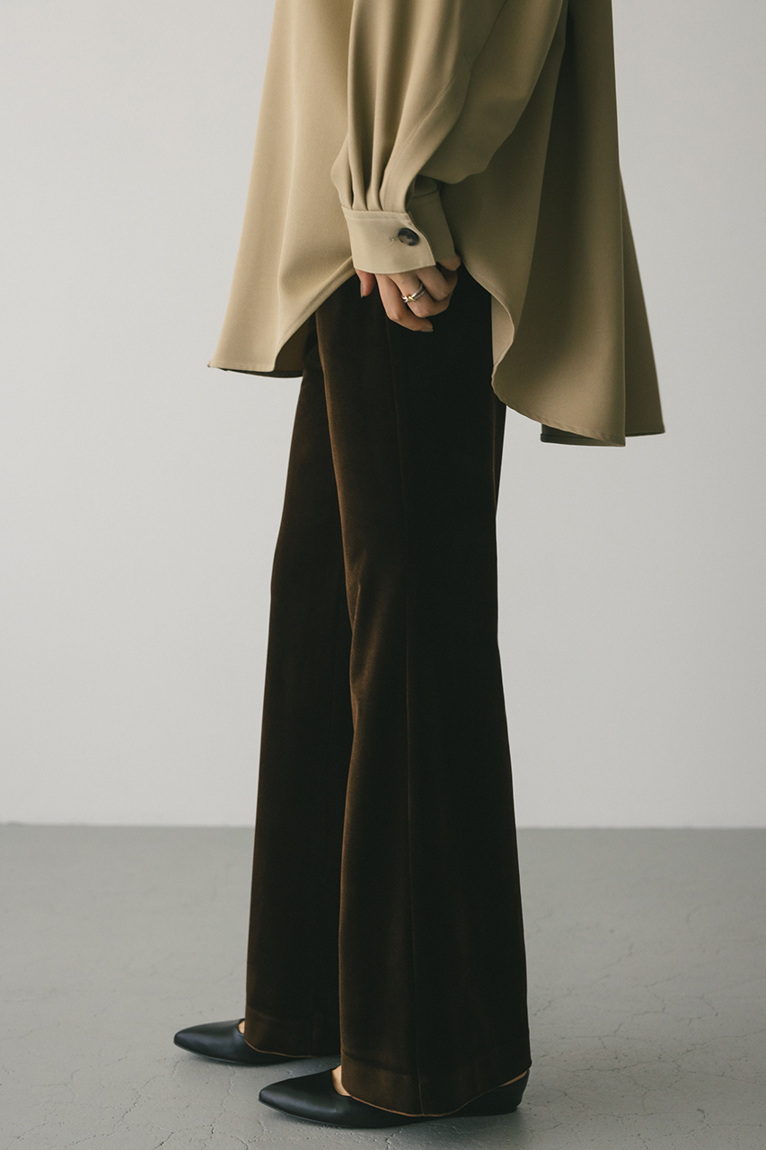 滑らかな肌触りのベロア生地を使用したフレアパンツ。きちんと感のあるセミフレアシルエットで、ベロアでもモードに上品に見せてくれる一枚。上品な光沢感のベロア生地でコーディネートの幅が広がります。ストレッチあり、透け感なし。
