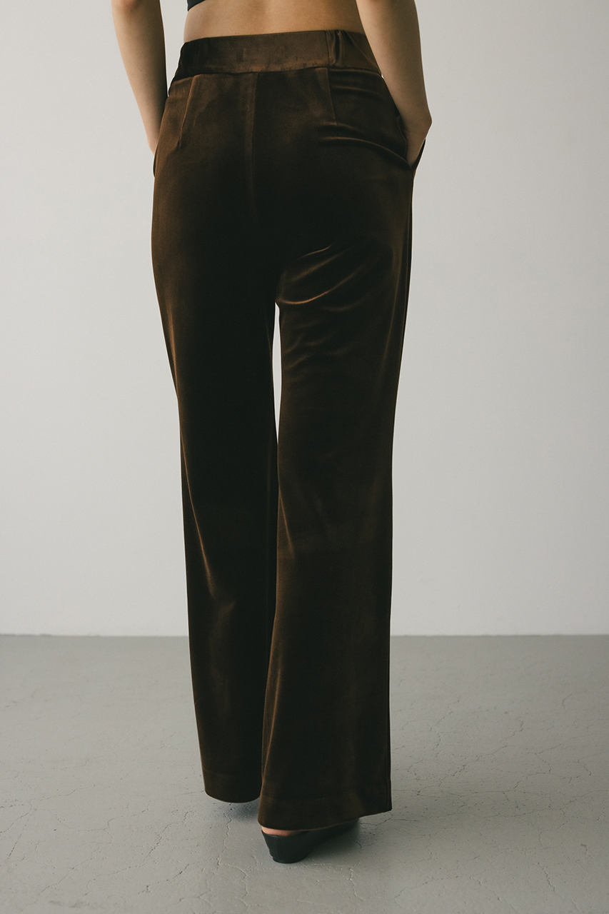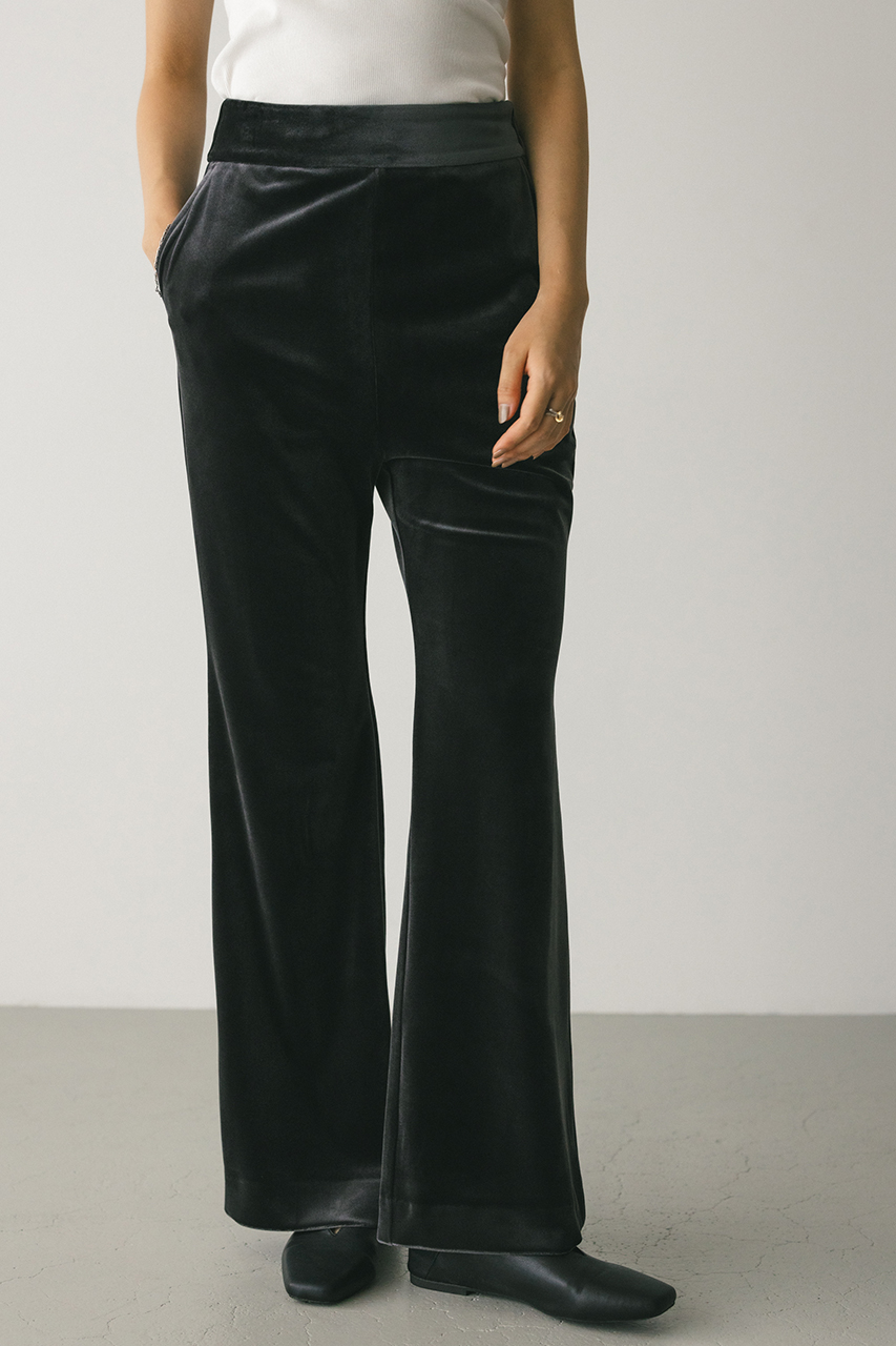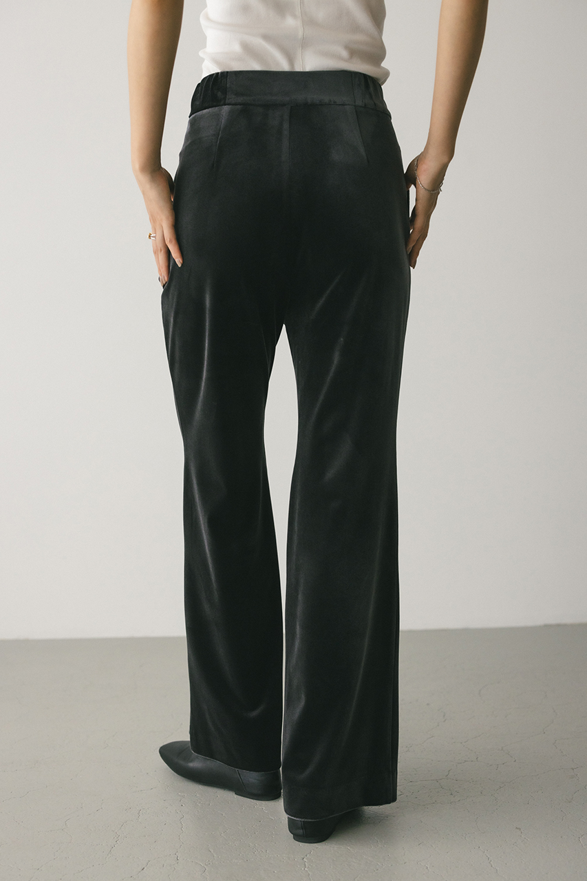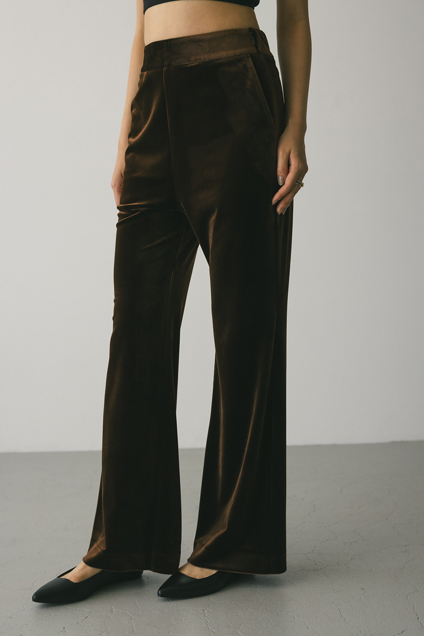 滑らかな肌触りのベロア生地を使用したフレアパンツ。きちんと感のあるセミフレアシルエットで、ベロアでもモードに上品に見せてくれる一枚。上品な光沢感のベロア生地でコーディネートの幅が広がります。ストレッチあり、透け感なし。