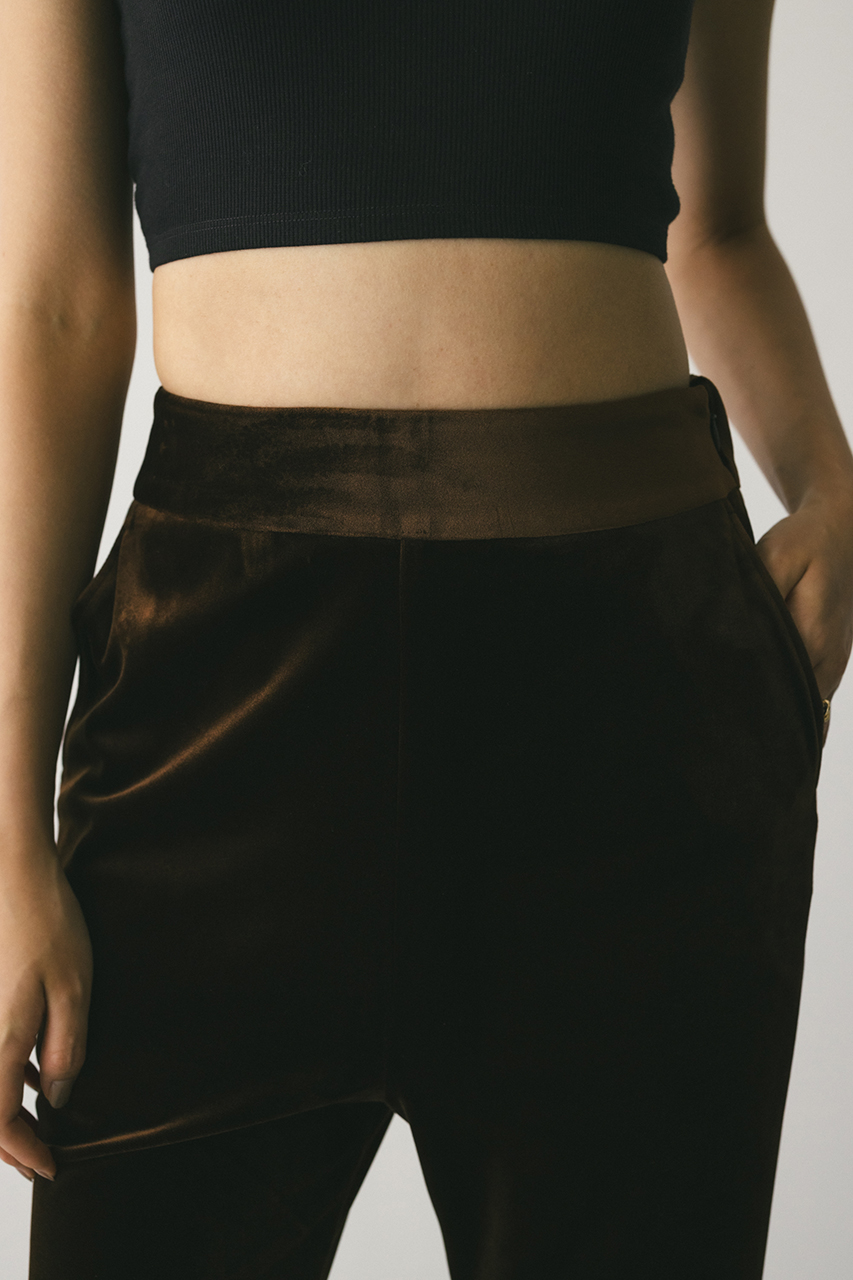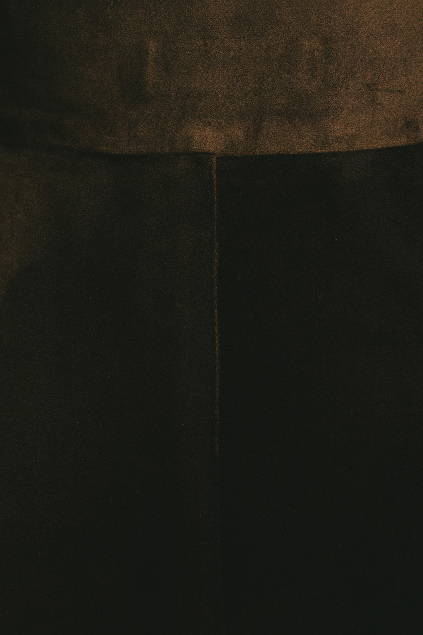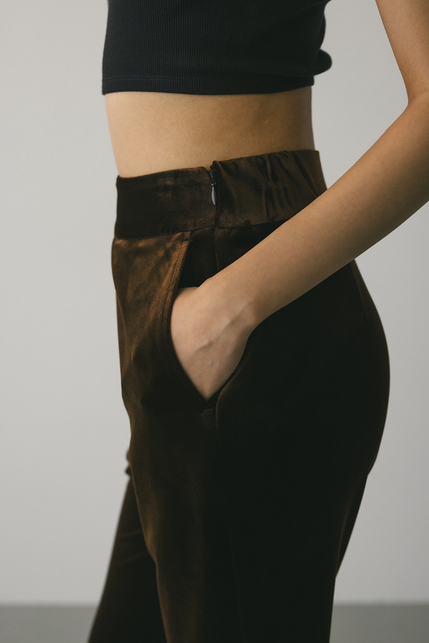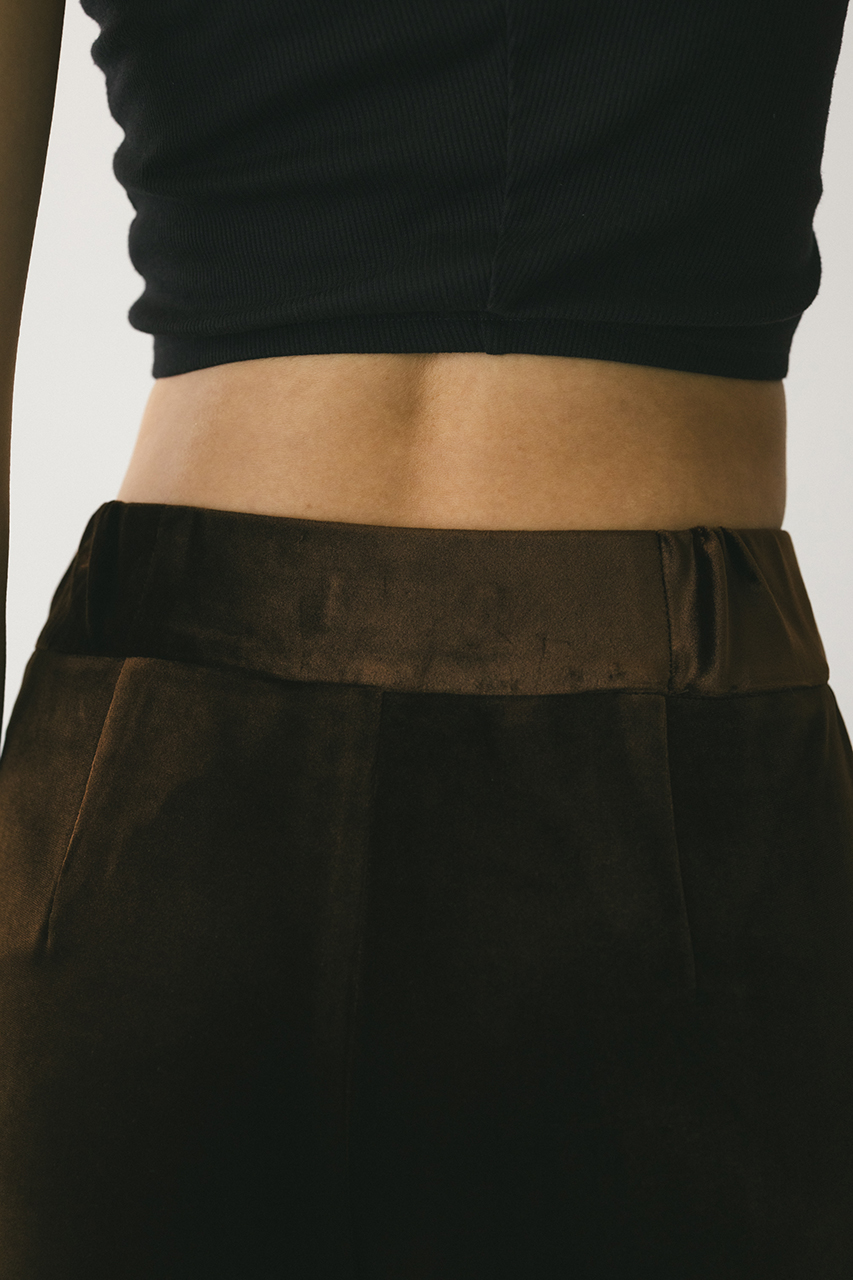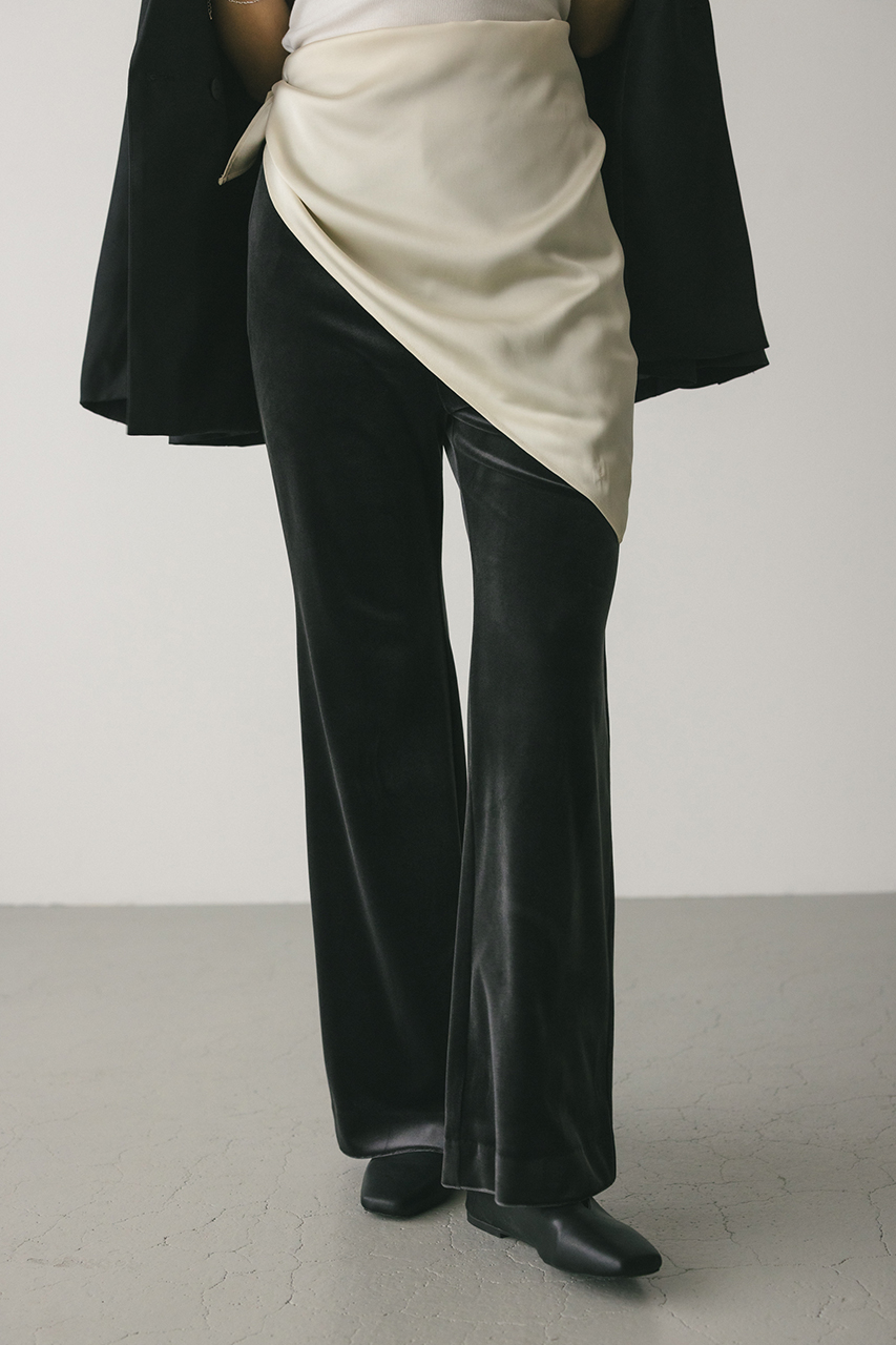 滑らかな肌触りのベロア生地を使用したフレアパンツ。きちんと感のあるセミフレアシルエットで、ベロアでもモードに上品に見せてくれる一枚。上品な光沢感のベロア生地でコーディネートの幅が広がります。ストレッチあり、透け感なし。