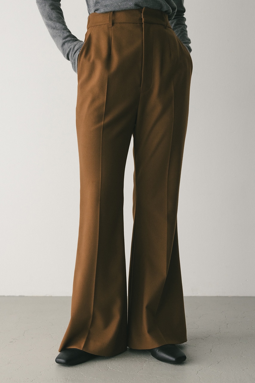 膝の位置をやや高めに取り、美脚見せにこだわったシルエットとセンタープレスデザインでスタイルアップが叶うフレアパンツ。きちんと感がありながらも、ウエストバックゴム仕様で履き心地が良いのも嬉しいポイント。裾部分はほんのりフレアを入れた女性らしいシルエットにしています。500IAT30-3891(タッキングぺプラムキャミ)とセットアップ着用可能。ストレッチあり、透け感なし。