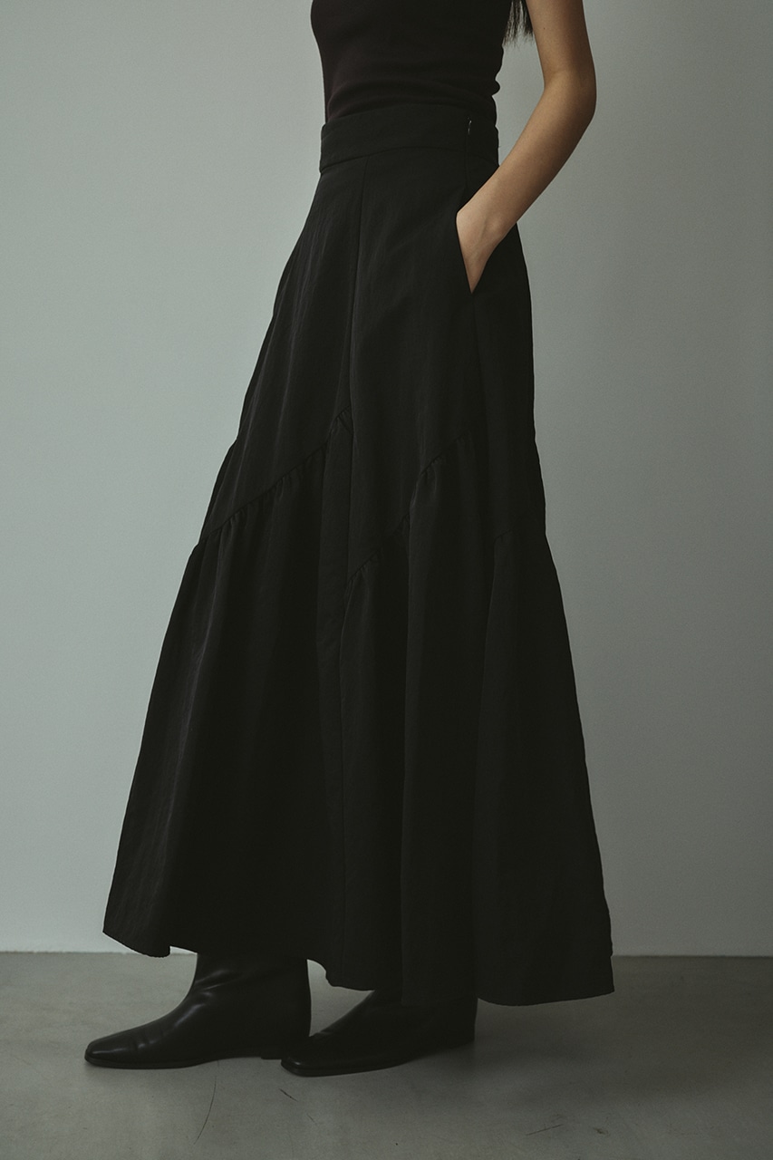 ナイロン素材を使用したモードなフレアスカート。微光沢ながら重厚感のあるナイロン生地を使用。斜めに入ったパネルとギャザーで動きのでるフレアシルエットに仕上げました。ウエストバックゴム仕様。ストレッチなし、透け感なし。