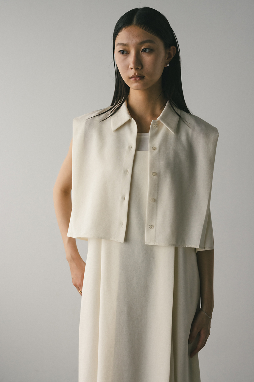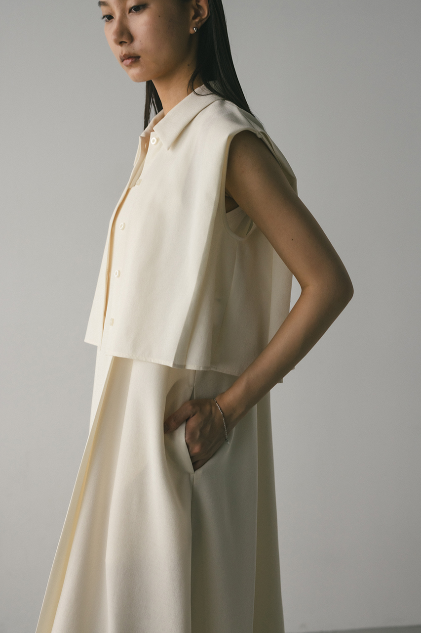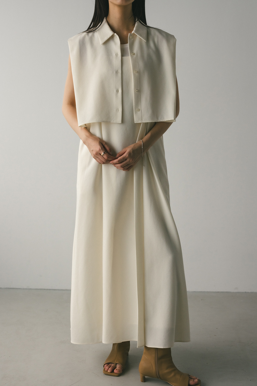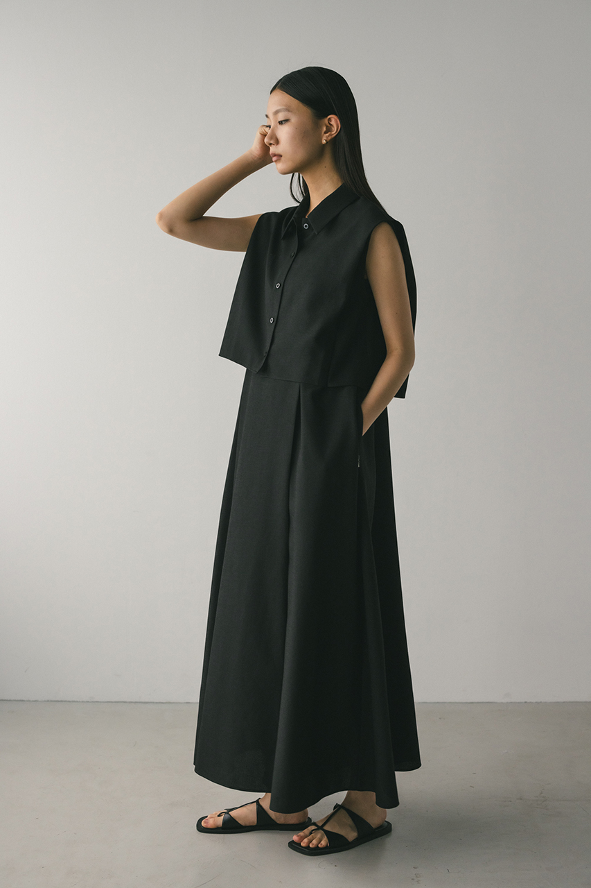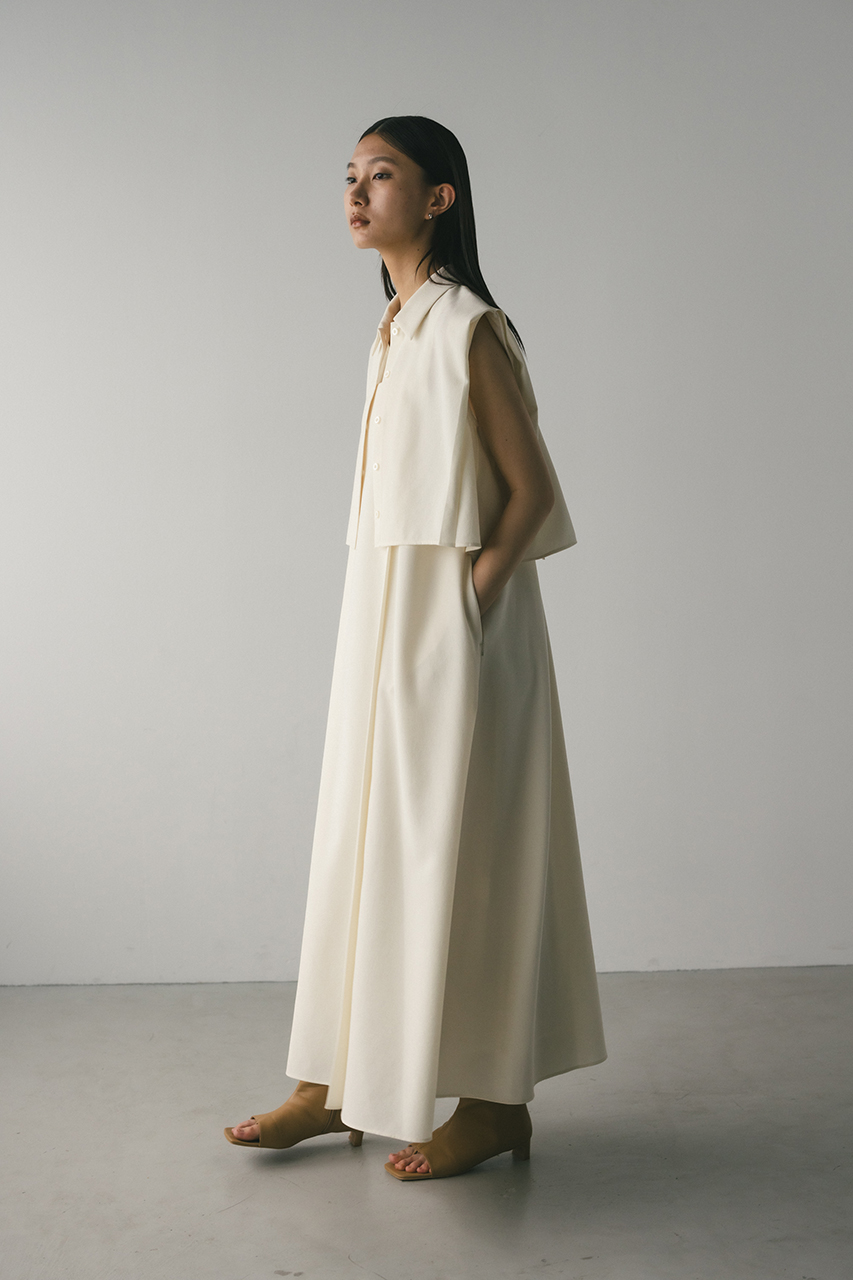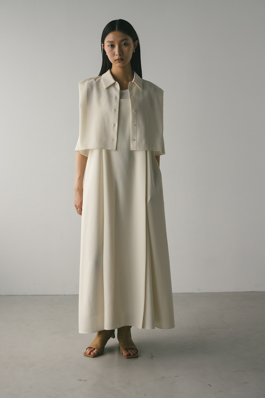 コンパクトなサイズ感のショートシャツとフレアワンピースが着回しの効くセットアイテム。シャツのショルダー部分には深くタックを入れ、二の腕がすっきりと見えるシルエットに仕上げています。フロントに大きくタックを入れたワンピースは、たっぷりと入ったフレアデザインで大人なシルエットに導きます。シンプルなデザインなので別々でも着用頂けます。ストレッチなし、透け感IVOややあり(裏地付き)