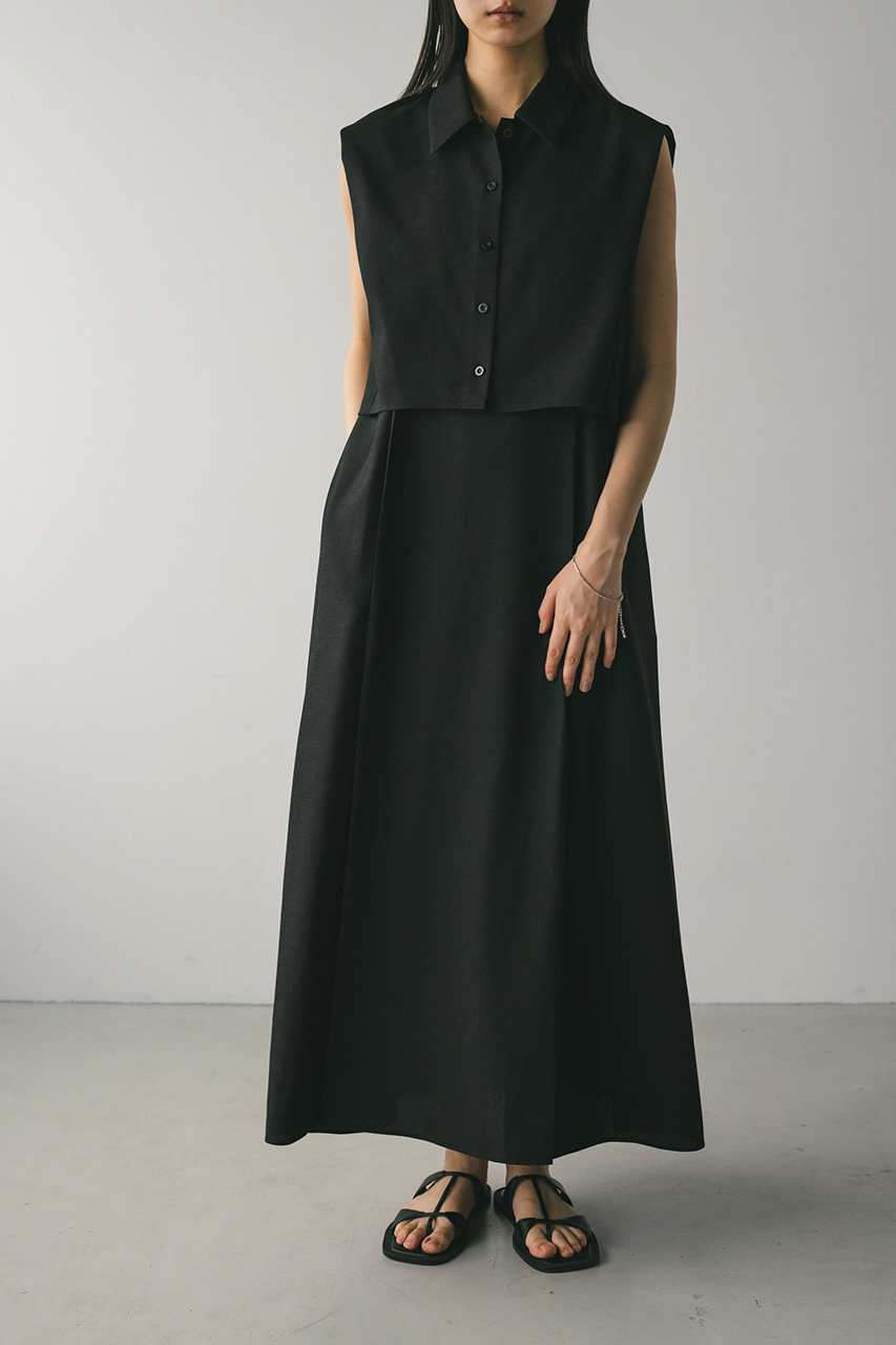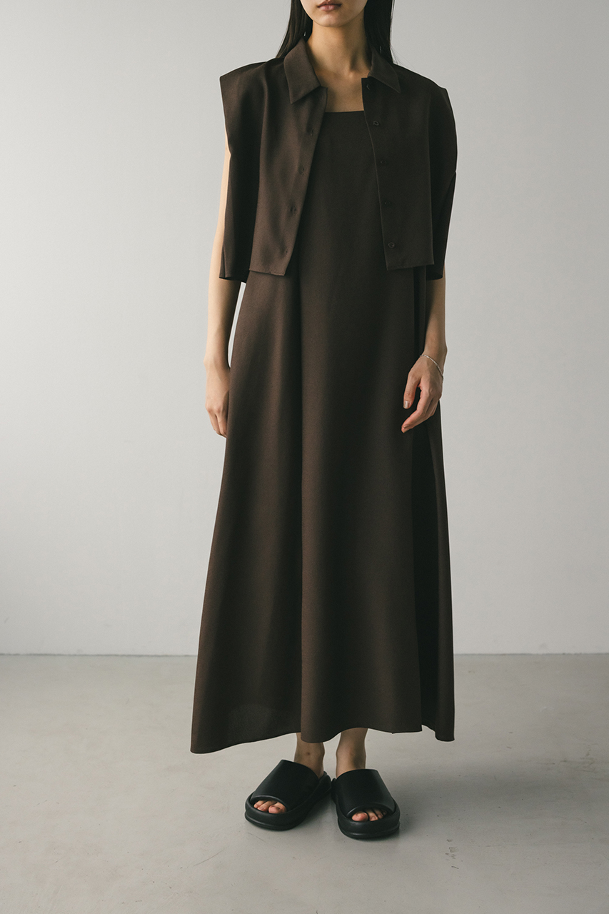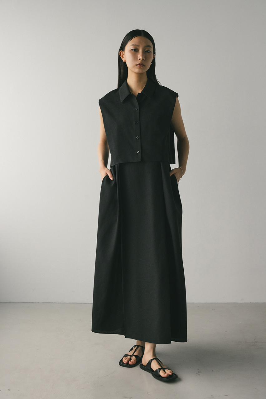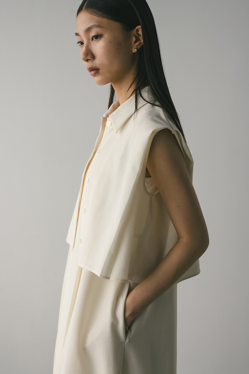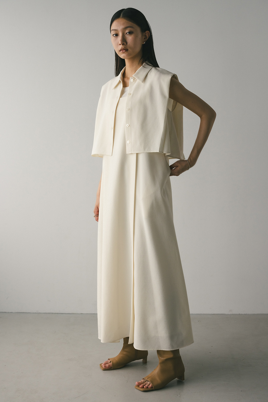 コンパクトなサイズ感のショートシャツとフレアワンピースが着回しの効くセットアイテム。シャツのショルダー部分には深くタックを入れ、二の腕がすっきりと見えるシルエットに仕上げています。フロントに大きくタックを入れたワンピースは、たっぷりと入ったフレアデザインで大人なシルエットに導きます。シンプルなデザインなので別々でも着用頂けます。ストレッチなし、透け感IVOややあり(裏地付き)