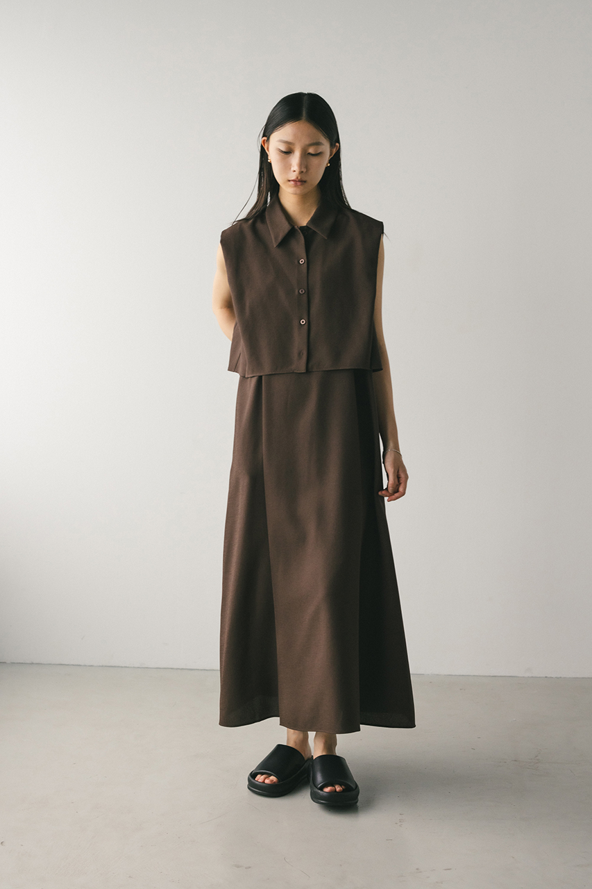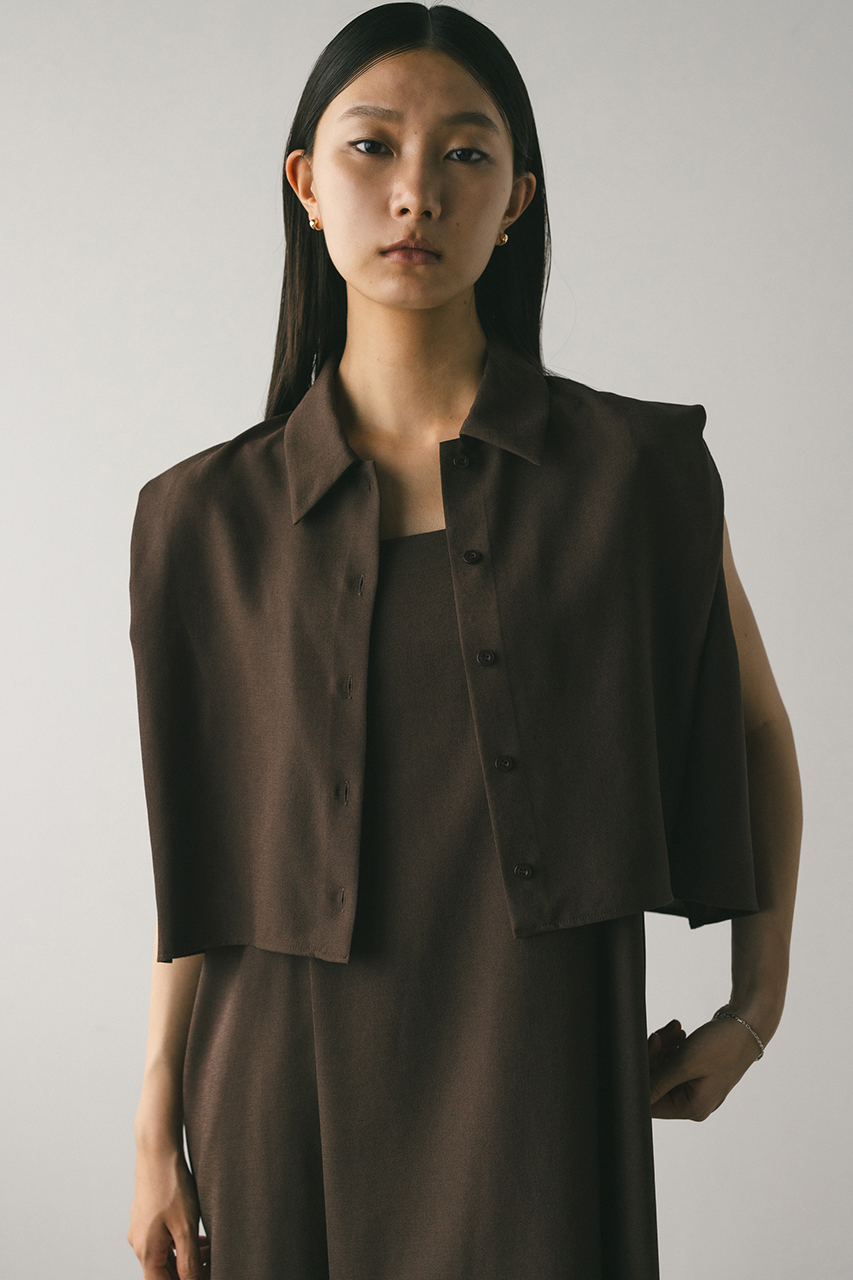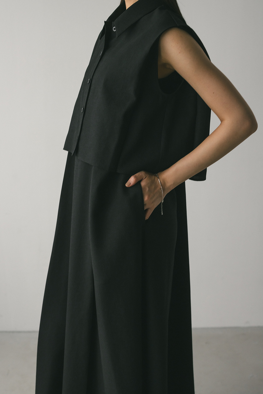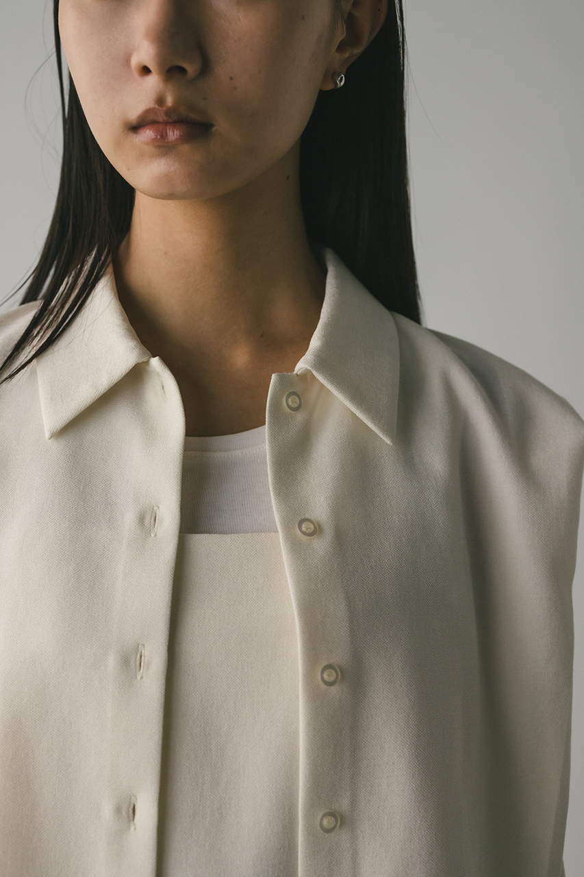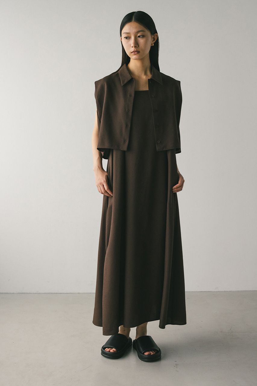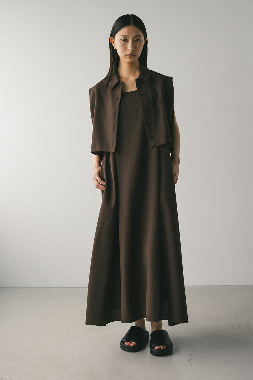 コンパクトなサイズ感のショートシャツとフレアワンピースが着回しの効くセットアイテム。シャツのショルダー部分には深くタックを入れ、二の腕がすっきりと見えるシルエットに仕上げています。フロントに大きくタックを入れたワンピースは、たっぷりと入ったフレアデザインで大人なシルエットに導きます。シンプルなデザインなので別々でも着用頂けます。ストレッチなし、透け感IVOややあり(裏地付き)