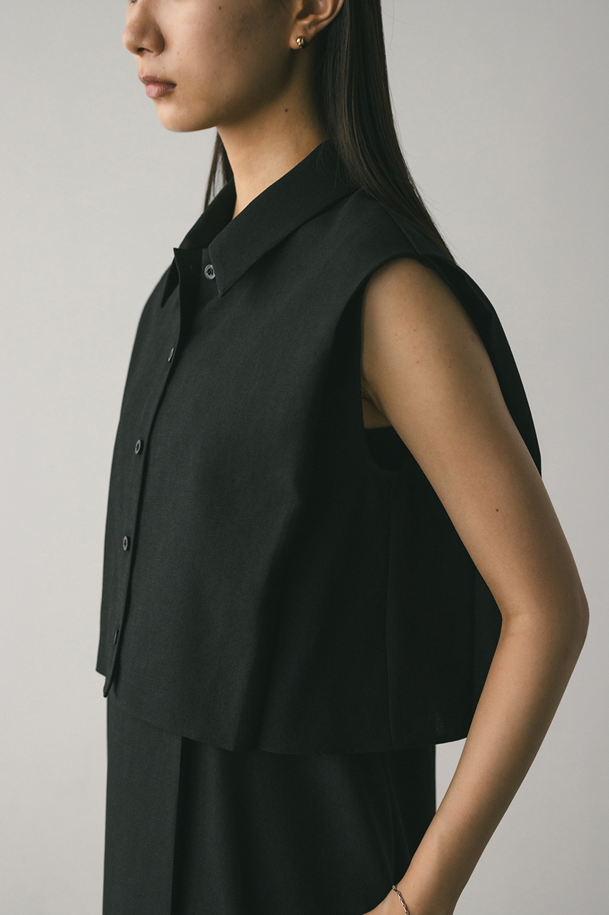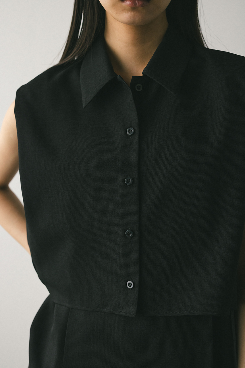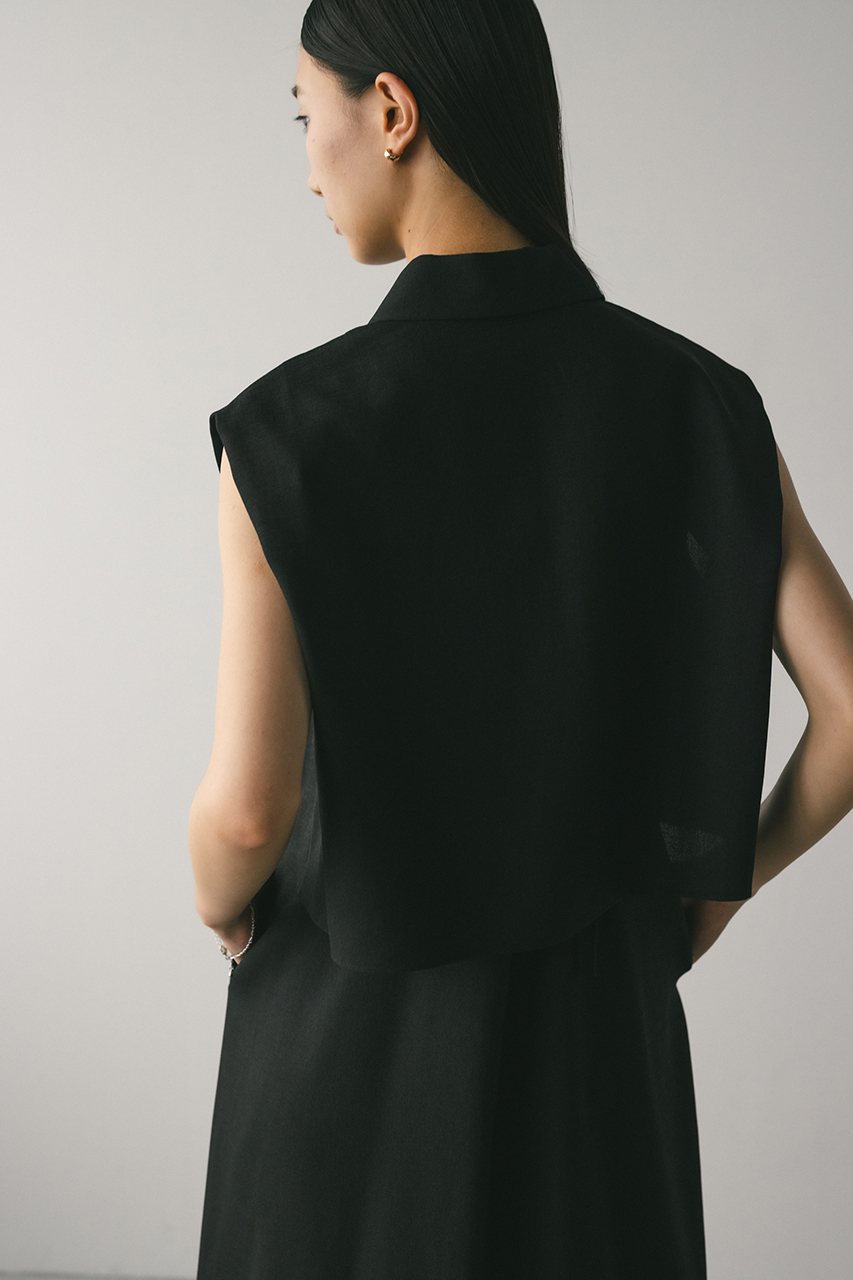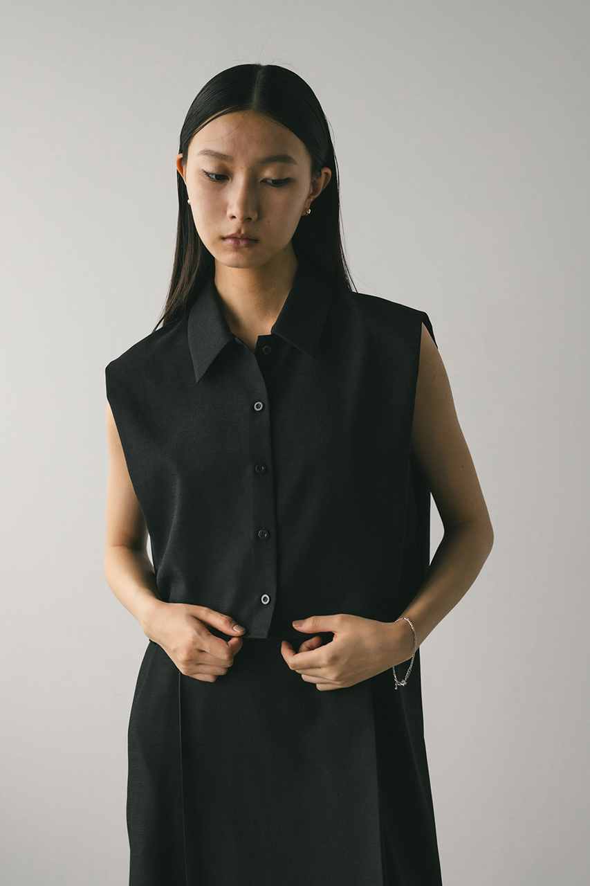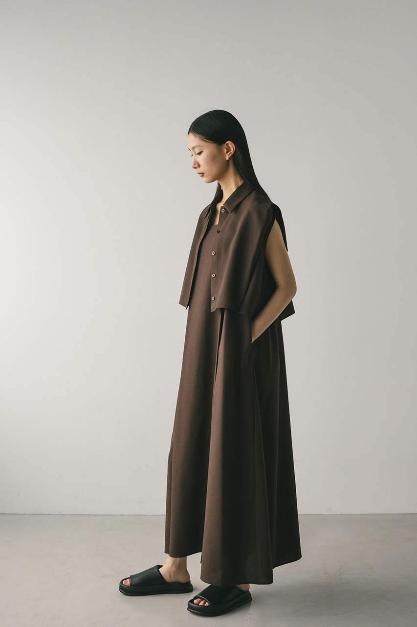 コンパクトなサイズ感のショートシャツとフレアワンピースが着回しの効くセットアイテム。シャツのショルダー部分には深くタックを入れ、二の腕がすっきりと見えるシルエットに仕上げています。フロントに大きくタックを入れたワンピースは、たっぷりと入ったフレアデザインで大人なシルエットに導きます。シンプルなデザインなので別々でも着用頂けます。ストレッチなし、透け感IVOややあり(裏地付き)
