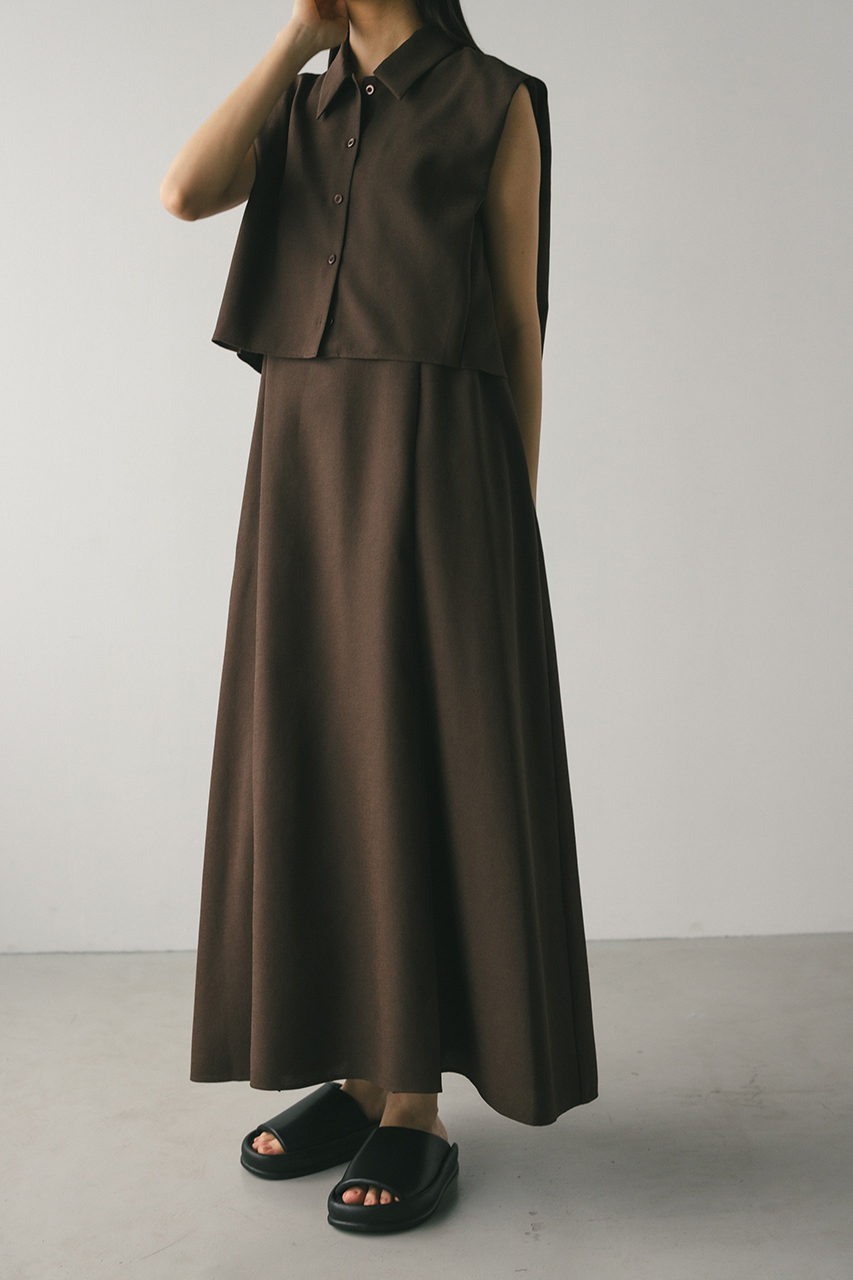 コンパクトなサイズ感のショートシャツとフレアワンピースが着回しの効くセットアイテム。シャツのショルダー部分には深くタックを入れ、二の腕がすっきりと見えるシルエットに仕上げています。フロントに大きくタックを入れたワンピースは、たっぷりと入ったフレアデザインで大人なシルエットに導きます。シンプルなデザインなので別々でも着用頂けます。ストレッチなし、透け感IVOややあり(裏地付き)