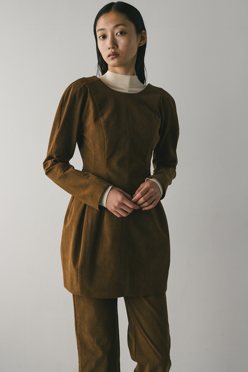 やわらかい肌触り、独特の光沢感と畝のある見た目がモードなコーデュロイミニワンピース。ウエストをしっかりとシェイプし、ウエスト位置をやや上するに設定することでスタイルアップに導きます。アームのパネルをあえてなくし、袖上にタックと細身の袖で独特のカーブスリーブが腕周りをしなやかなに見せてくれます。500IAT31-2391(コーデュロイセミフレアパンツ)とセットアップ着用可能。ストレッチあり、透け感なし。
