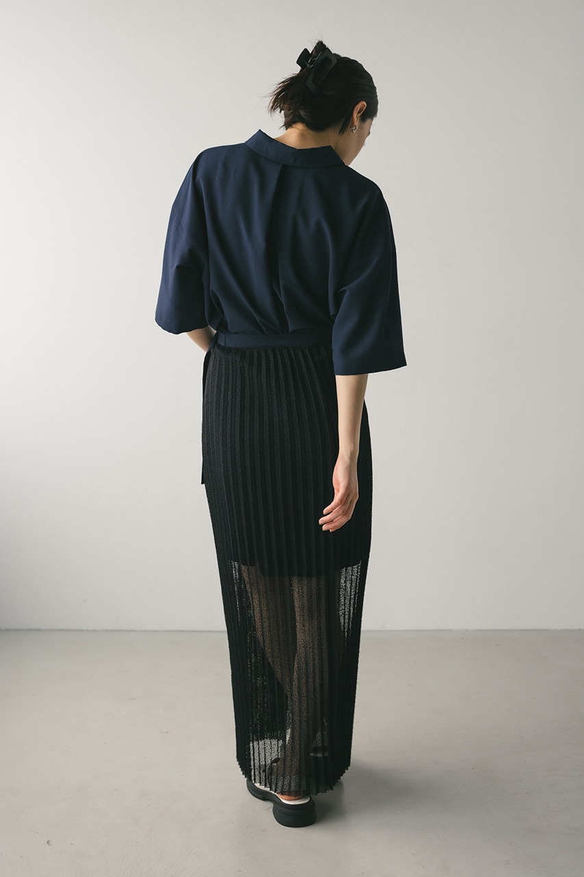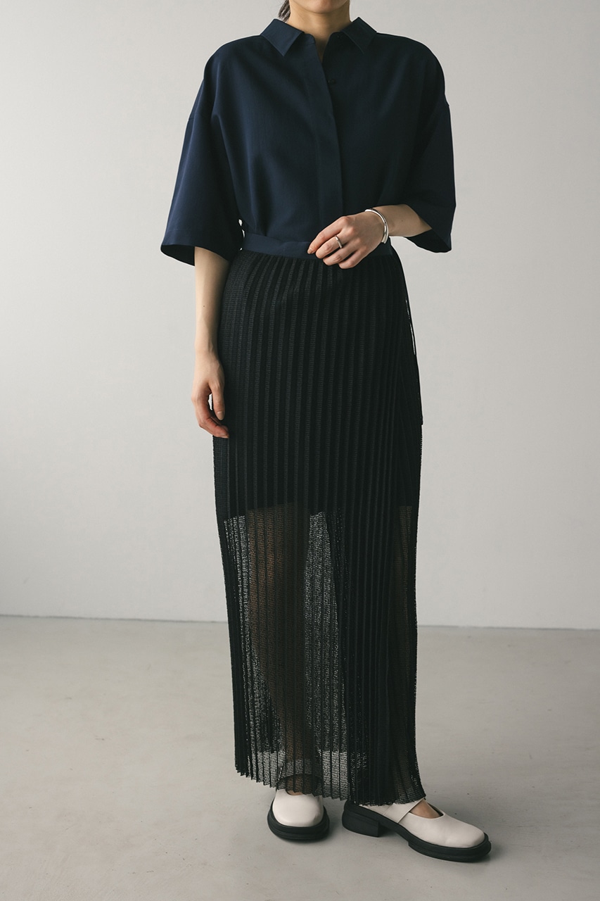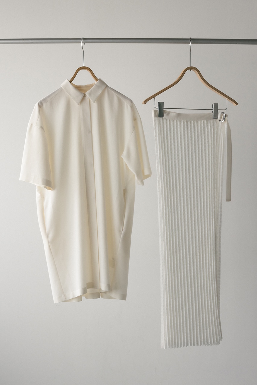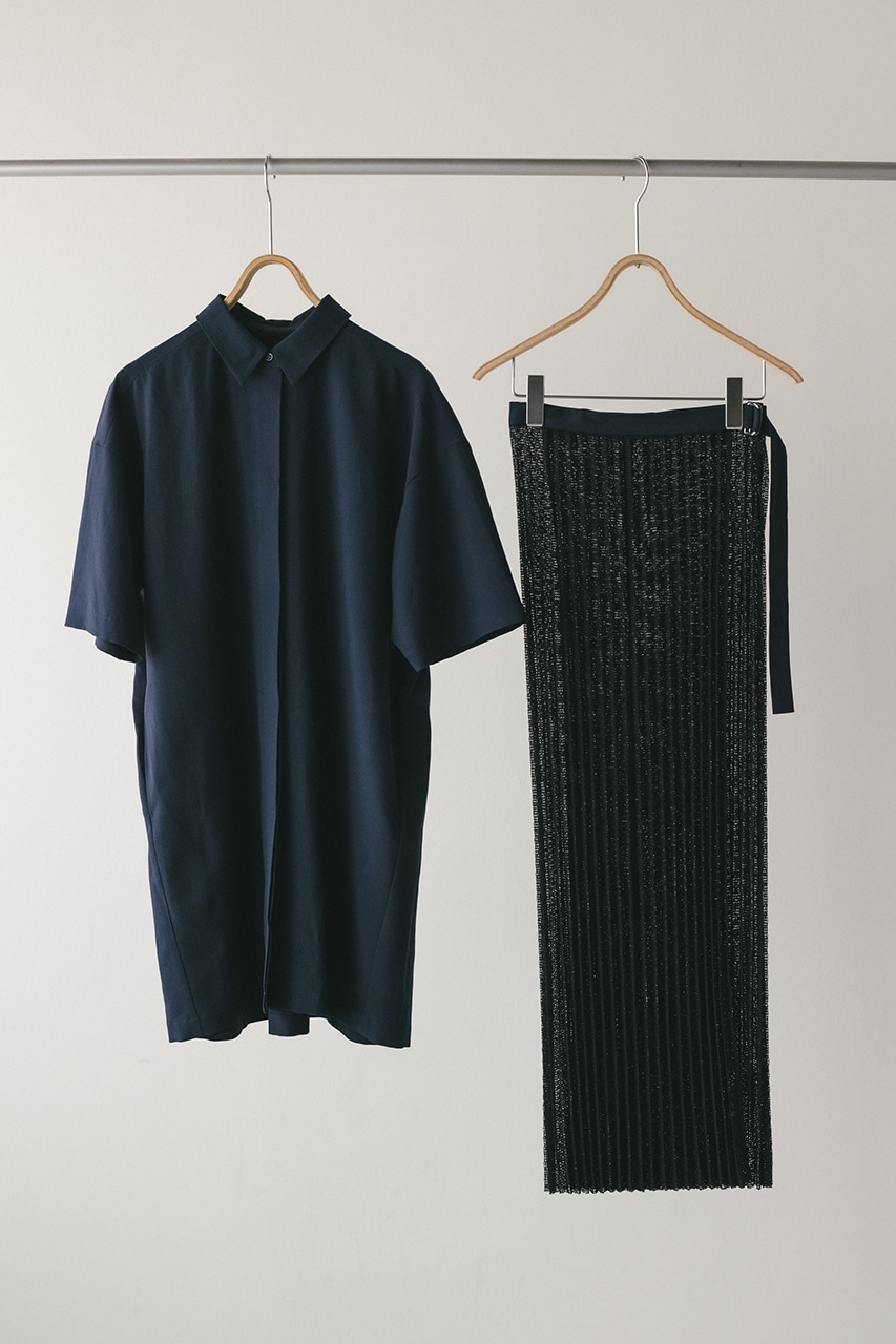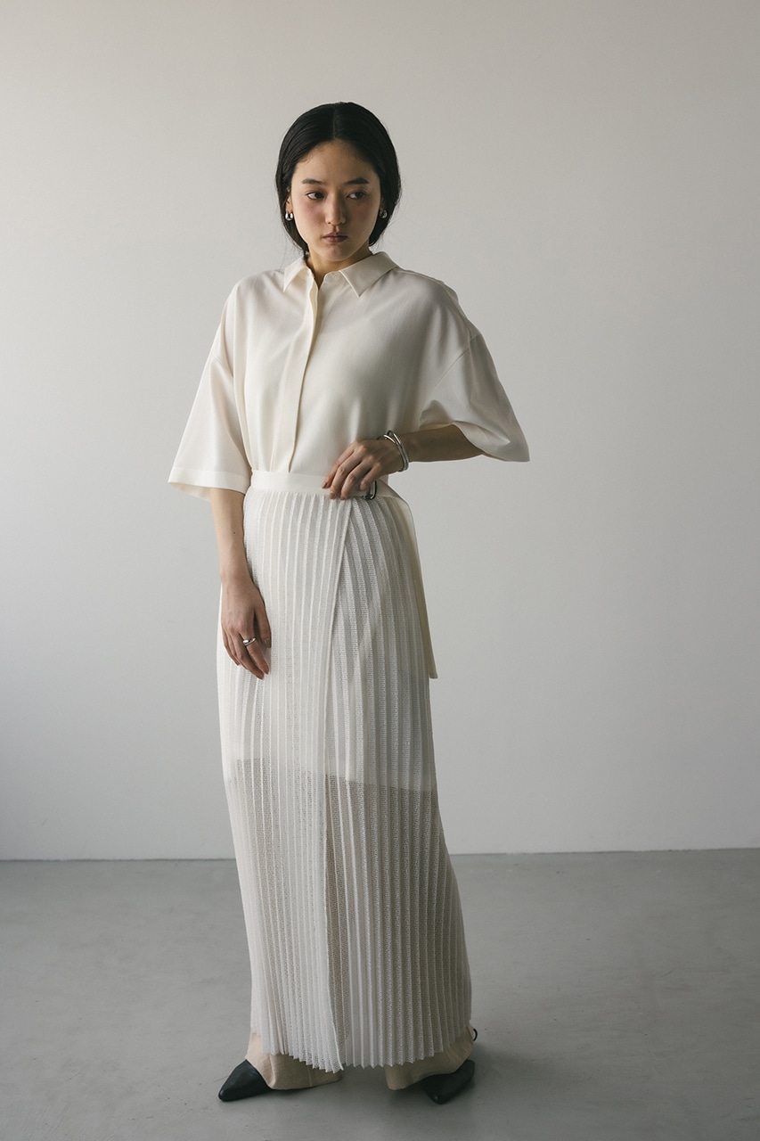 着回し力抜群のハーフスリーブのルーズシャツと格子柄のメッシュレースにプリーツ加工を施したラッププリーツスカートのセットアイテム。脇パネルを前にふったシャツはサイドからでもきれいに見せてくれるシルエットがポイント。ストレッチあり(シャツ)ストレッチなし(スカート)、透け感ややあり(シャツ)/透け感あり(スカート)