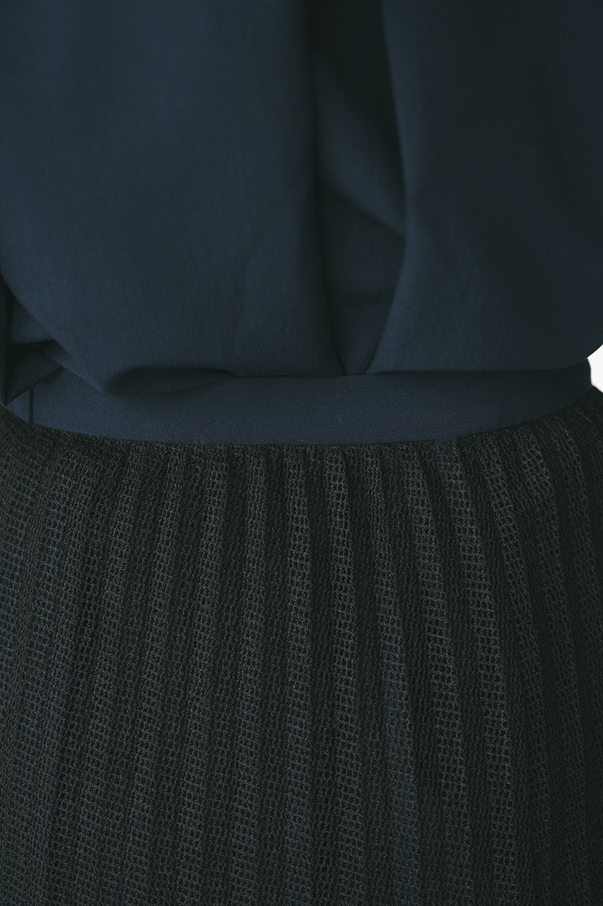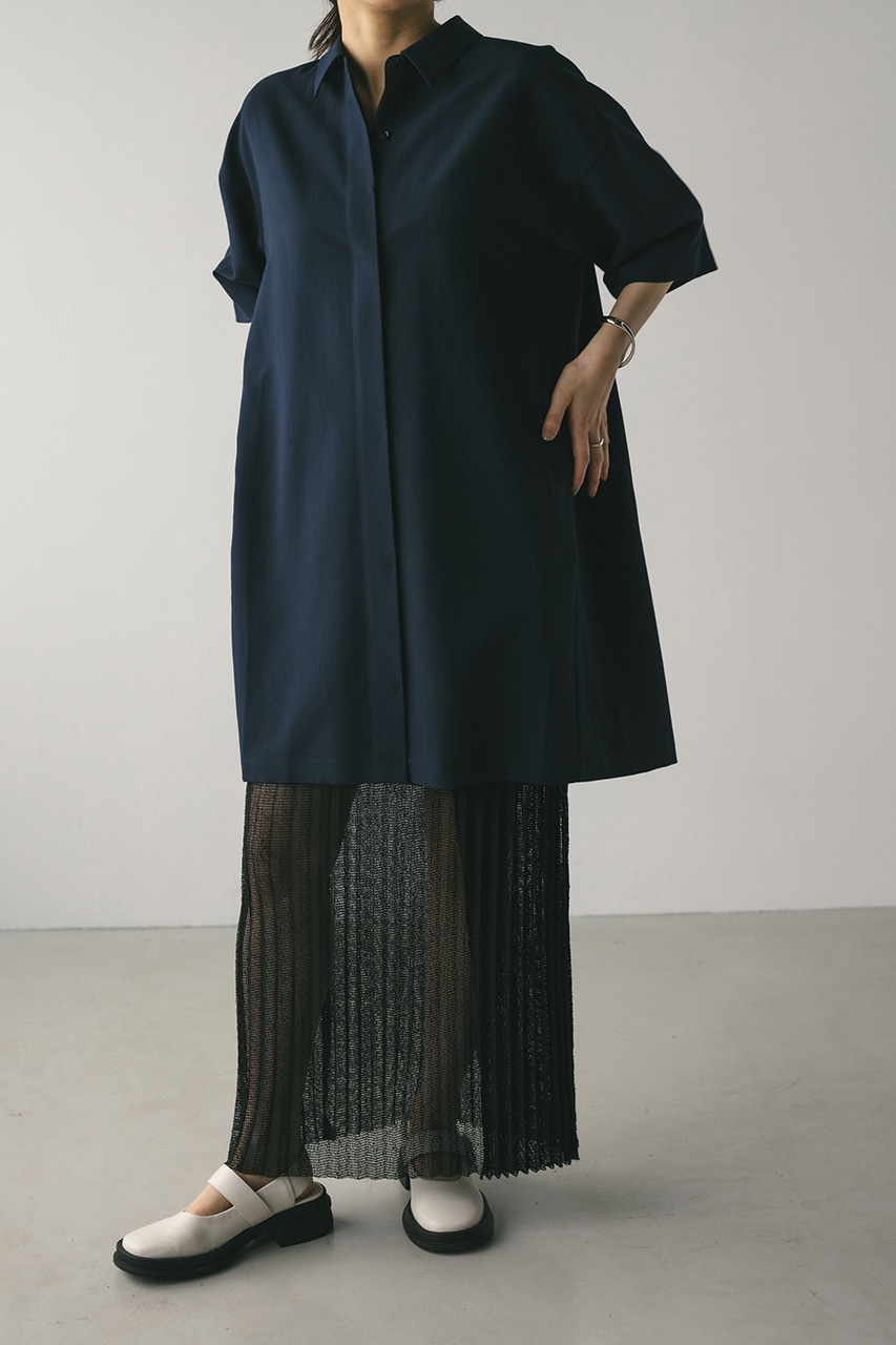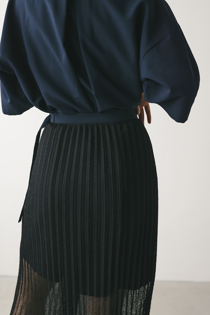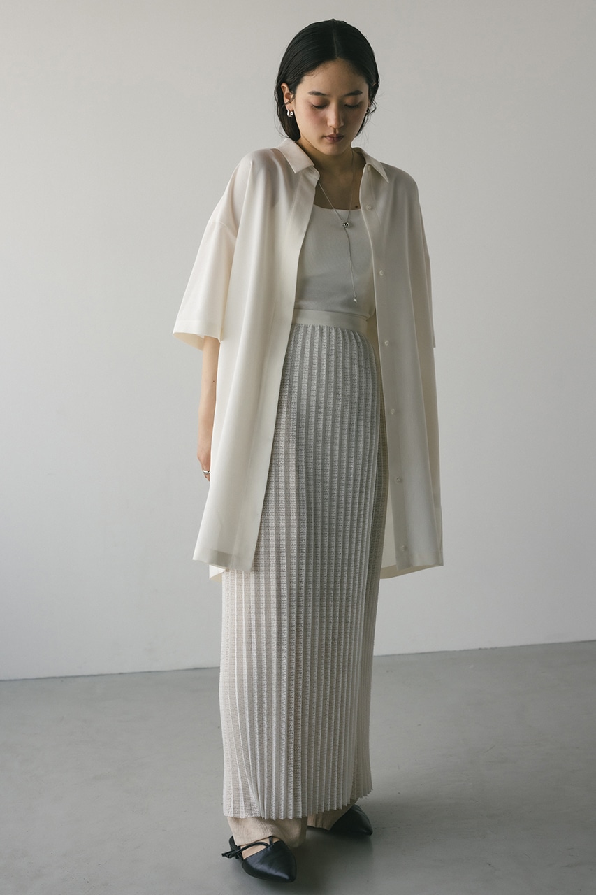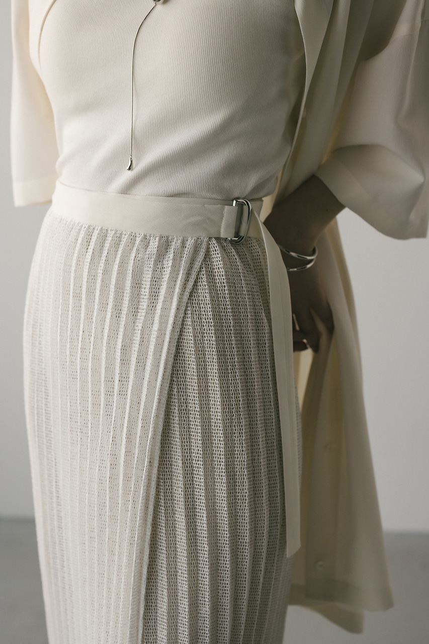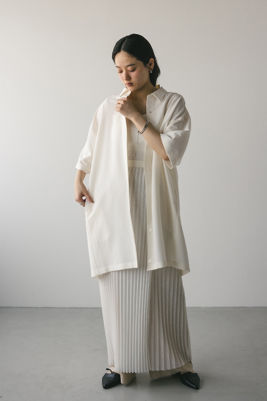 着回し力抜群のハーフスリーブのルーズシャツと格子柄のメッシュレースにプリーツ加工を施したラッププリーツスカートのセットアイテム。脇パネルを前にふったシャツはサイドからでもきれいに見せてくれるシルエットがポイント。ストレッチあり(シャツ)ストレッチなし(スカート)、透け感ややあり(シャツ)/透け感あり(スカート)