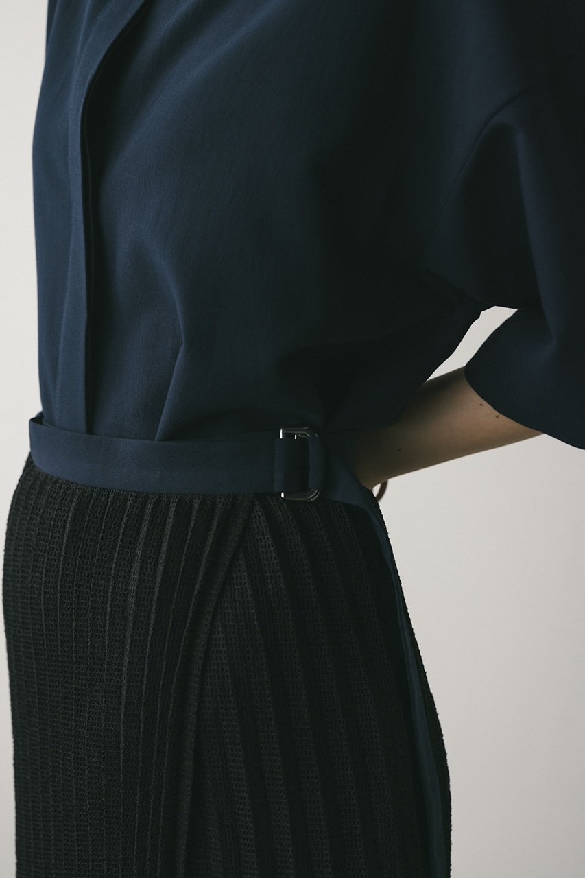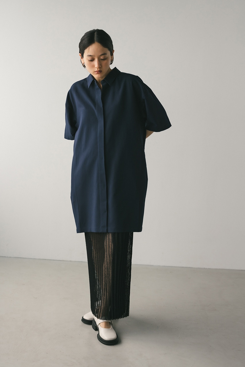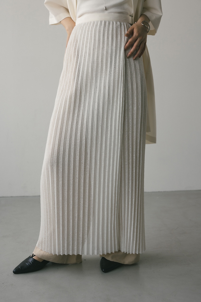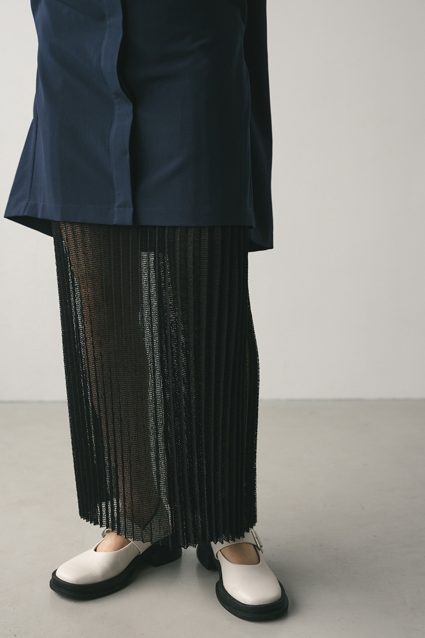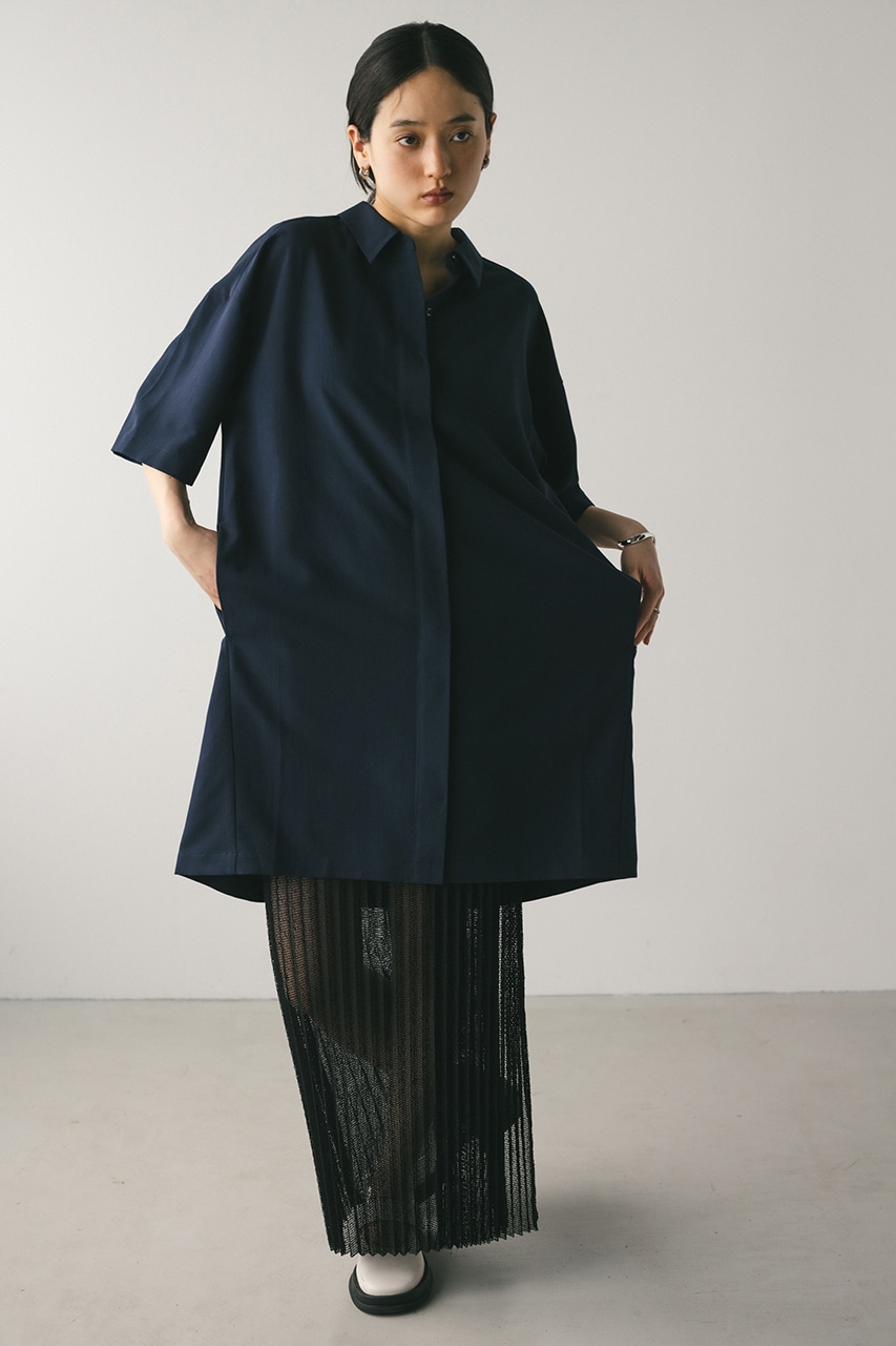 着回し力抜群のハーフスリーブのルーズシャツと格子柄のメッシュレースにプリーツ加工を施したラッププリーツスカートのセットアイテム。脇パネルを前にふったシャツはサイドからでもきれいに見せてくれるシルエットがポイント。ストレッチあり(シャツ)ストレッチなし(スカート)、透け感ややあり(シャツ)/透け感あり(スカート)