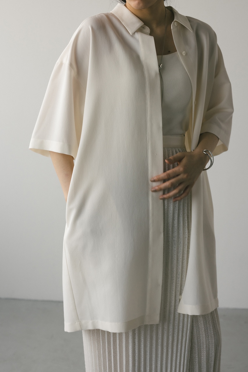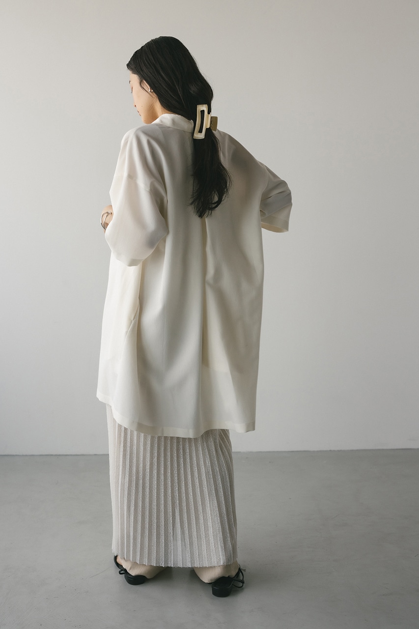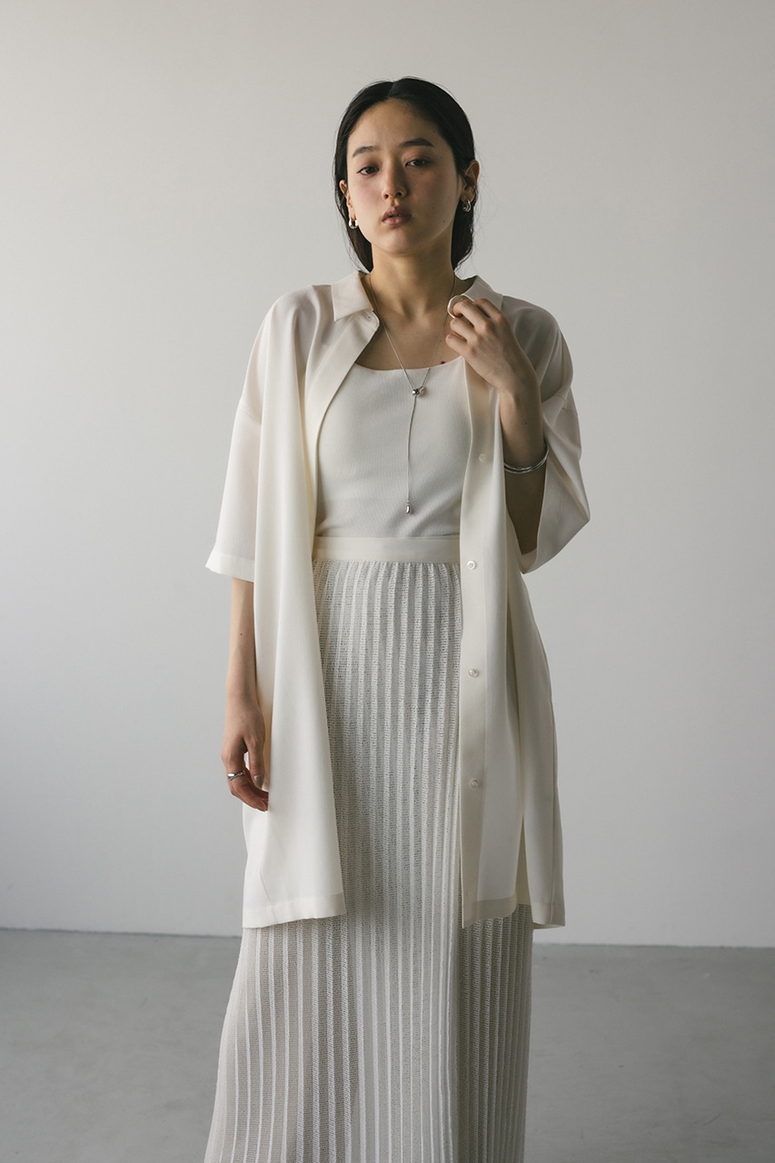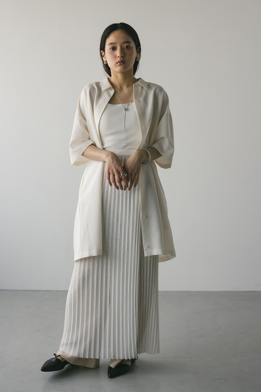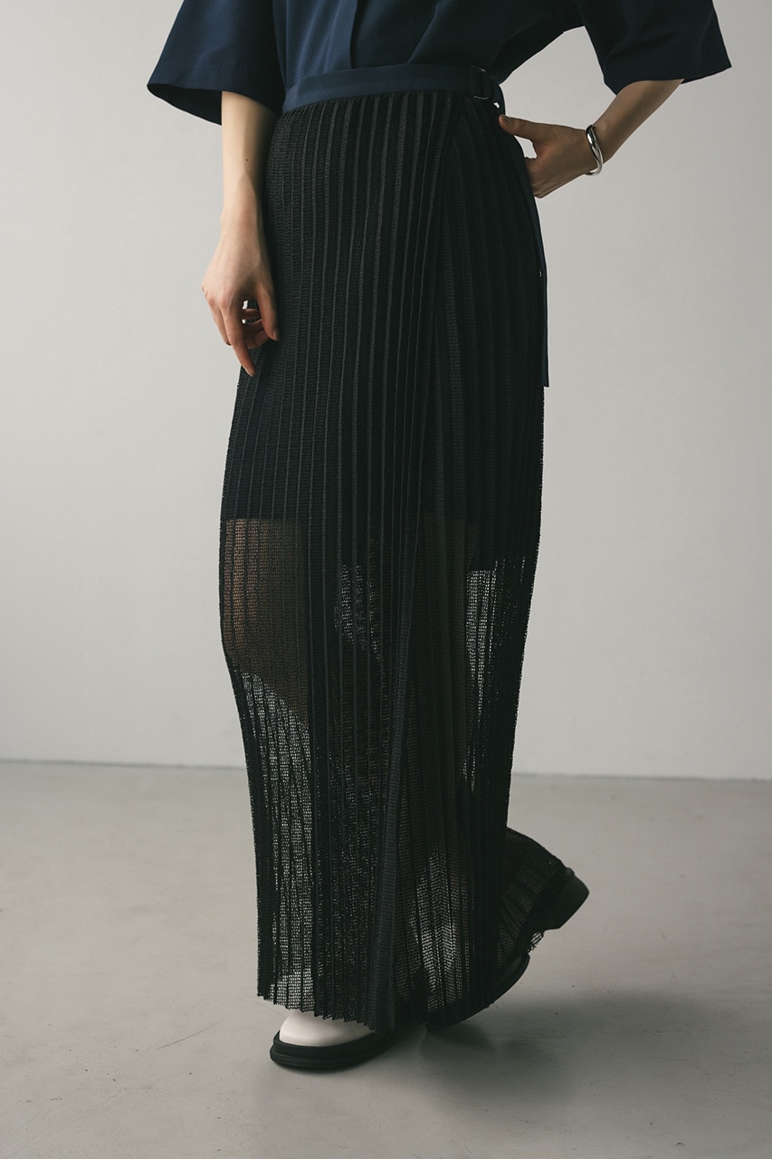 着回し力抜群のハーフスリーブのルーズシャツと格子柄のメッシュレースにプリーツ加工を施したラッププリーツスカートのセットアイテム。脇パネルを前にふったシャツはサイドからでもきれいに見せてくれるシルエットがポイント。ストレッチあり(シャツ)ストレッチなし(スカート)、透け感ややあり(シャツ)/透け感あり(スカート)